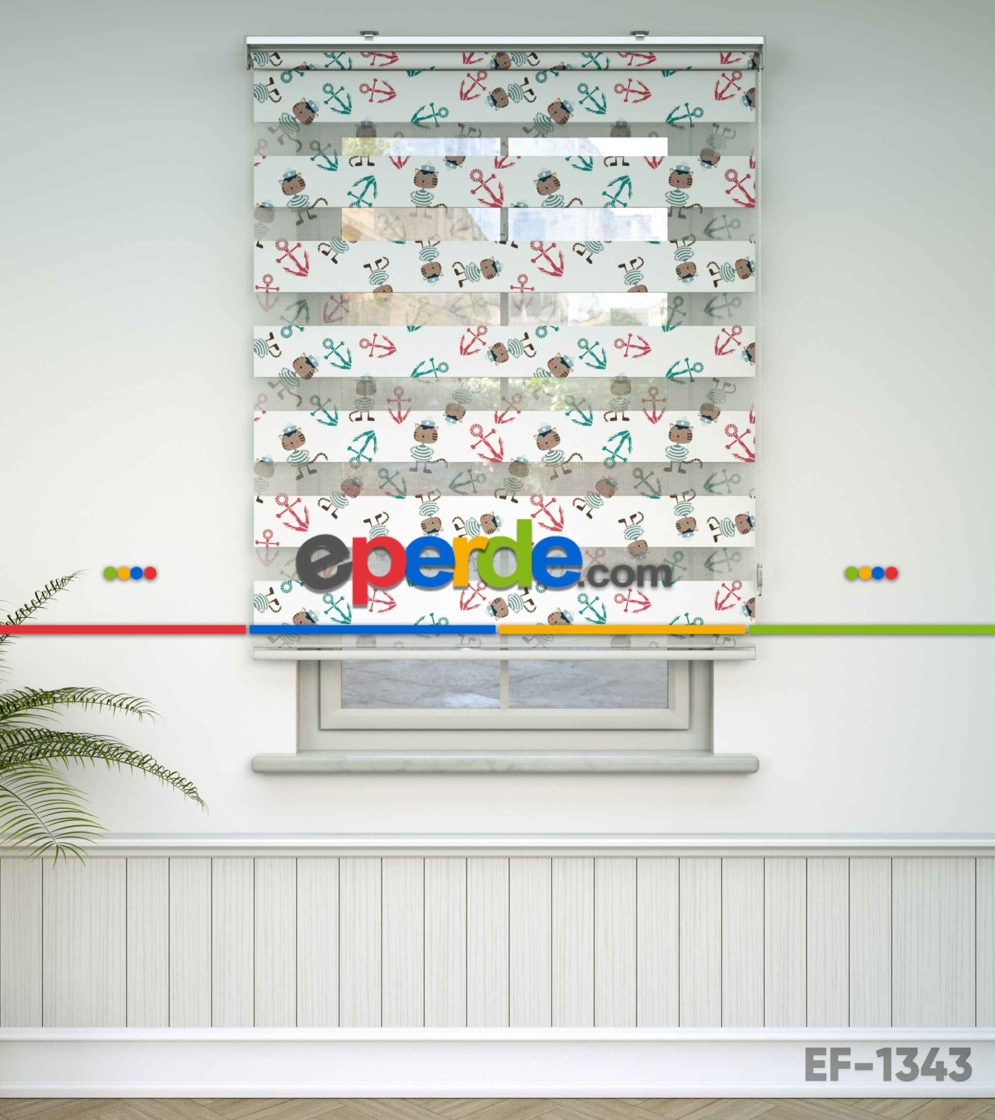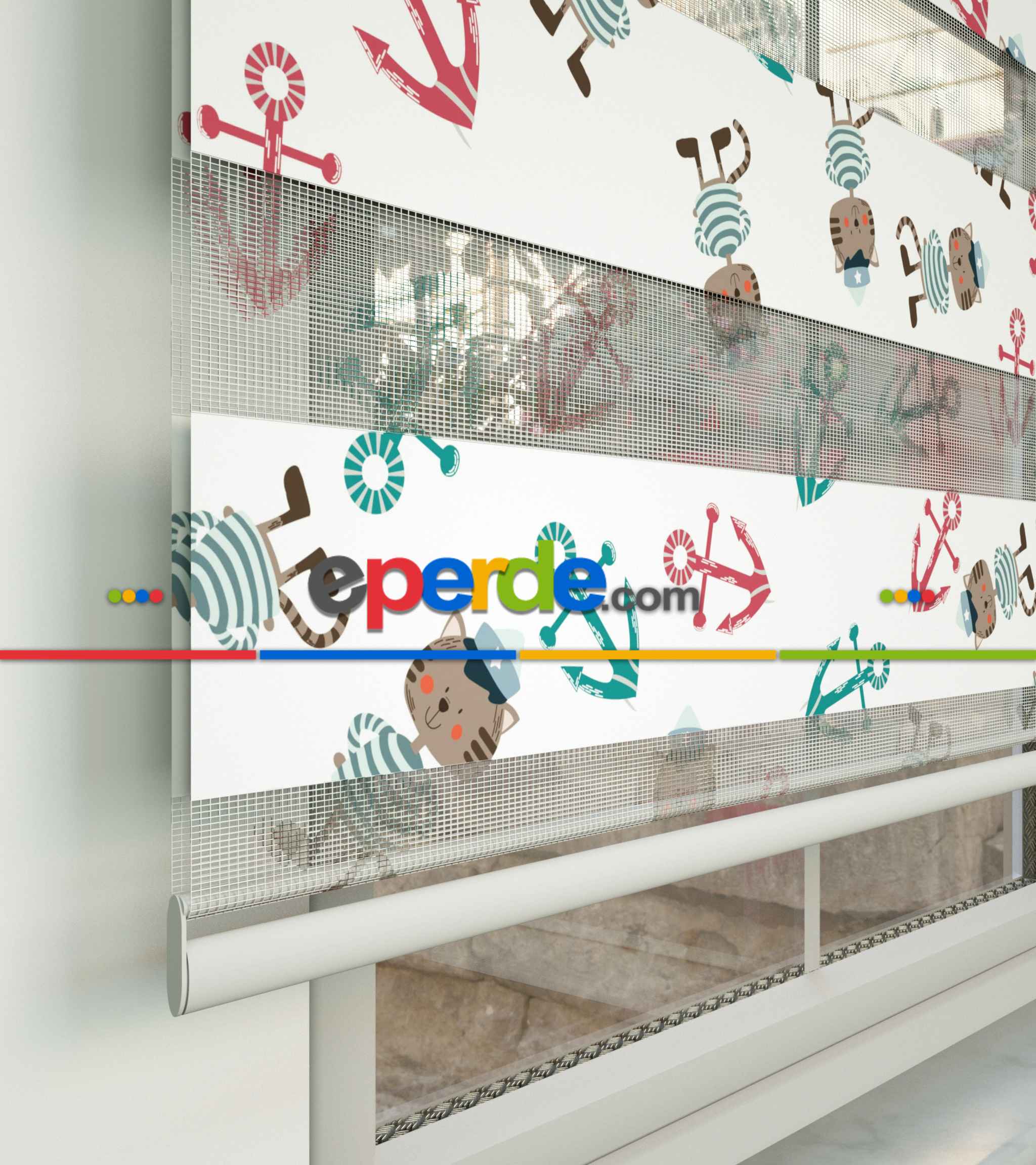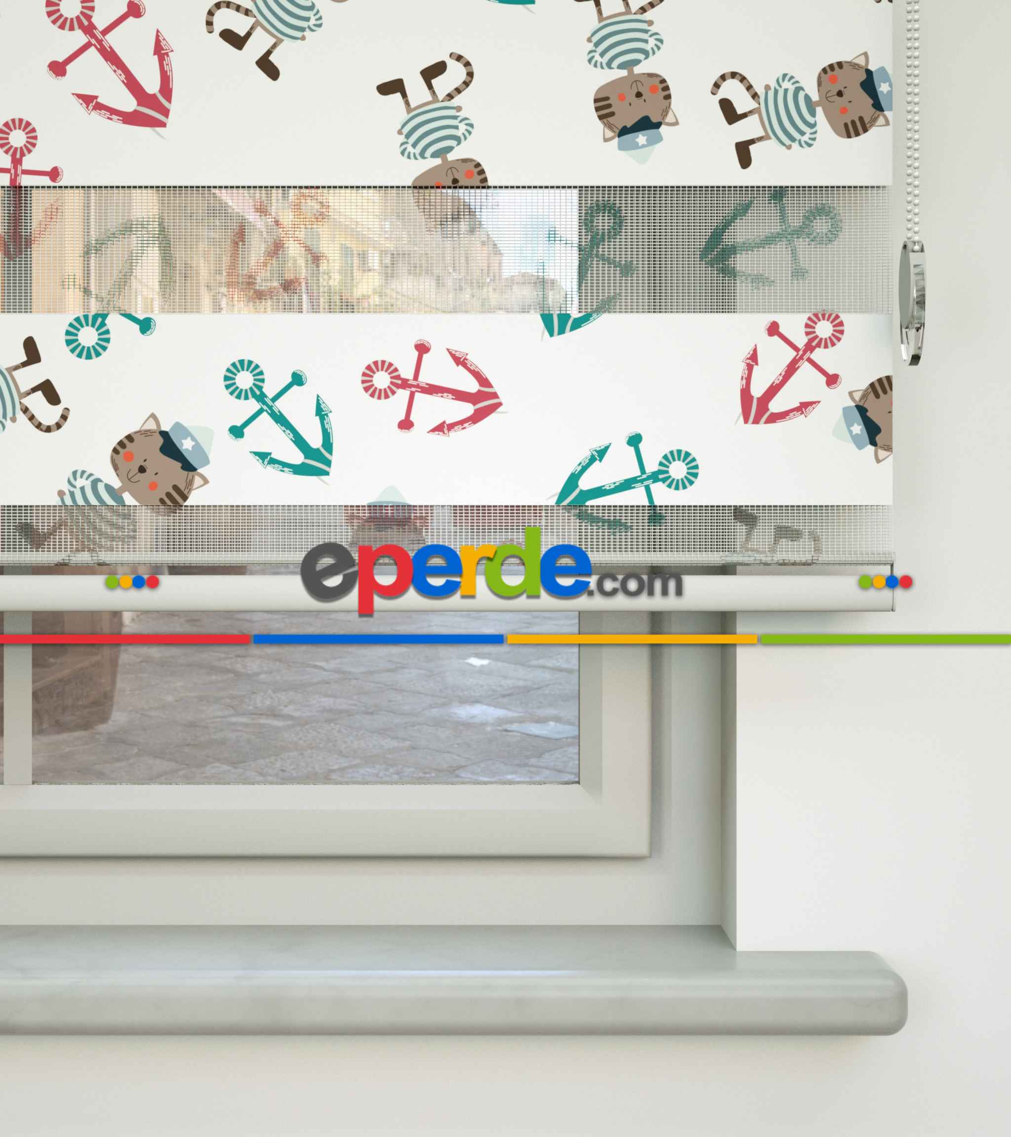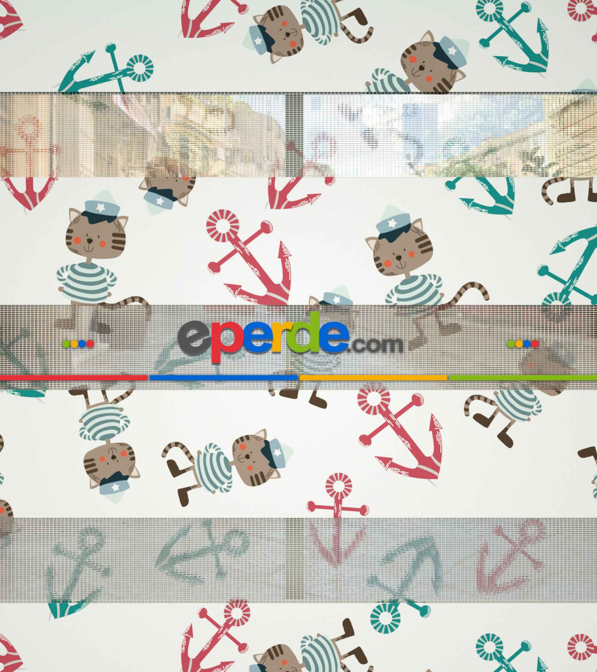 Bebek Odası Zebra - Çapa Ve Denizci Kedi Desen Baskılı Zebra Perde- Yeşil-Kırmızı-Ekru