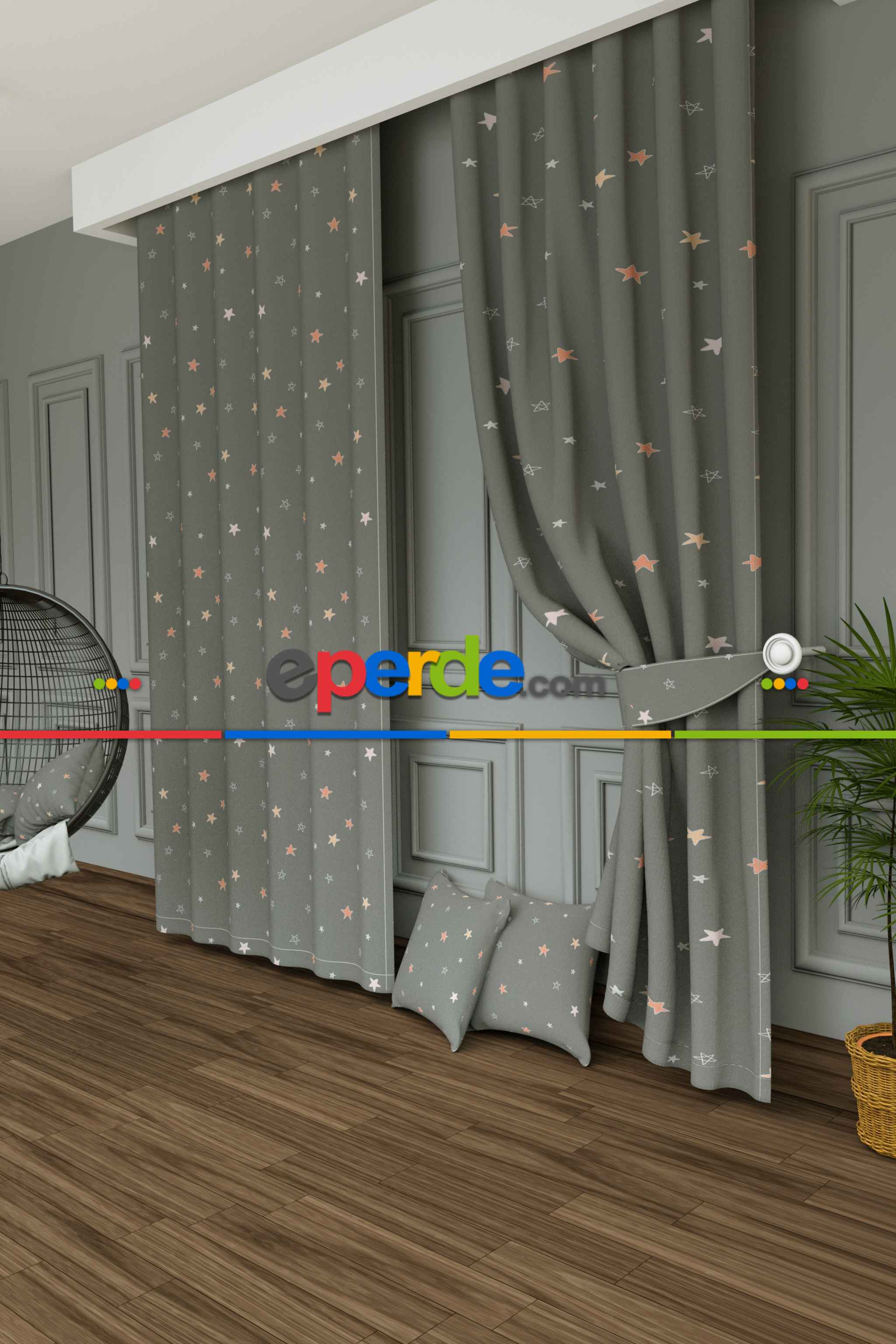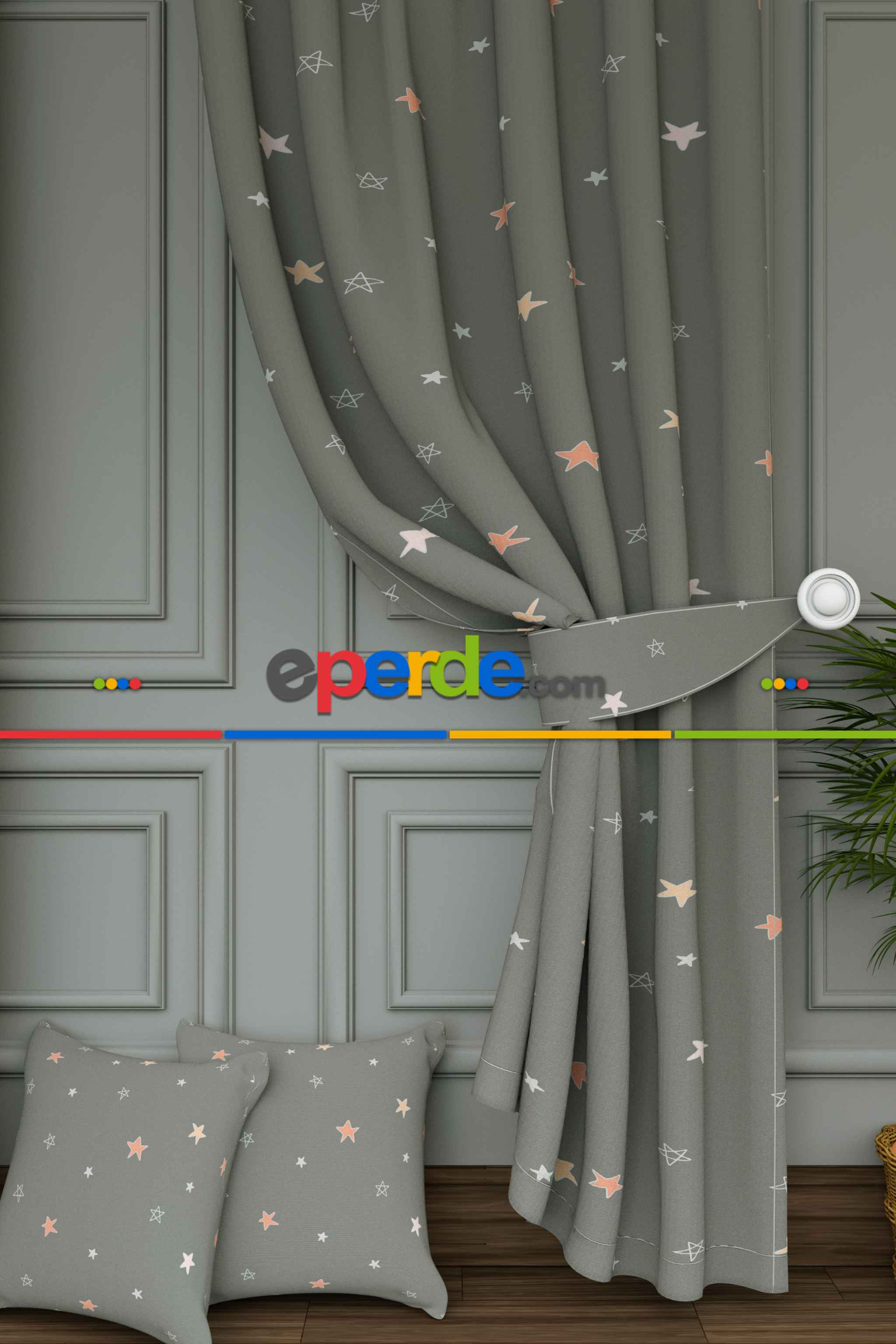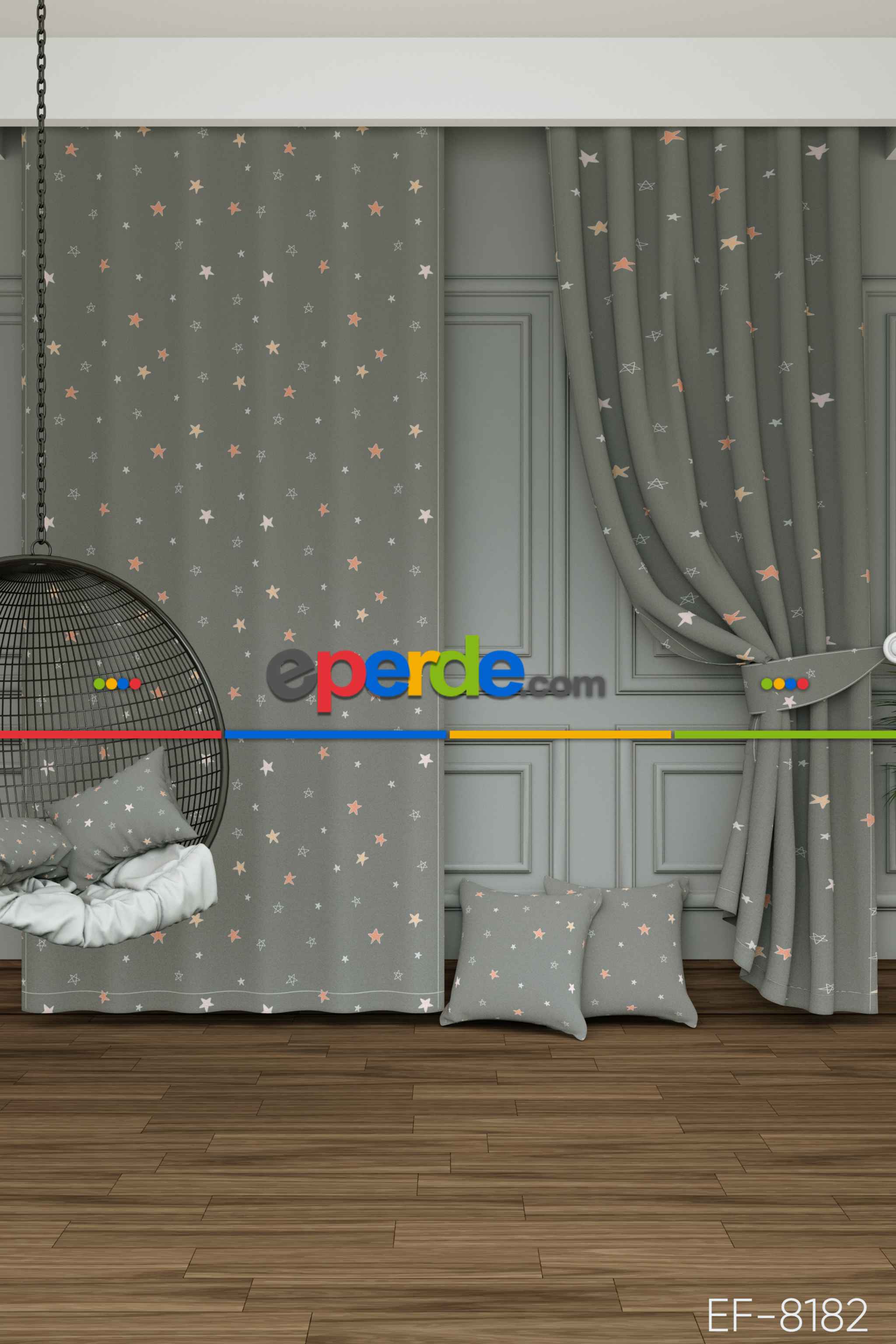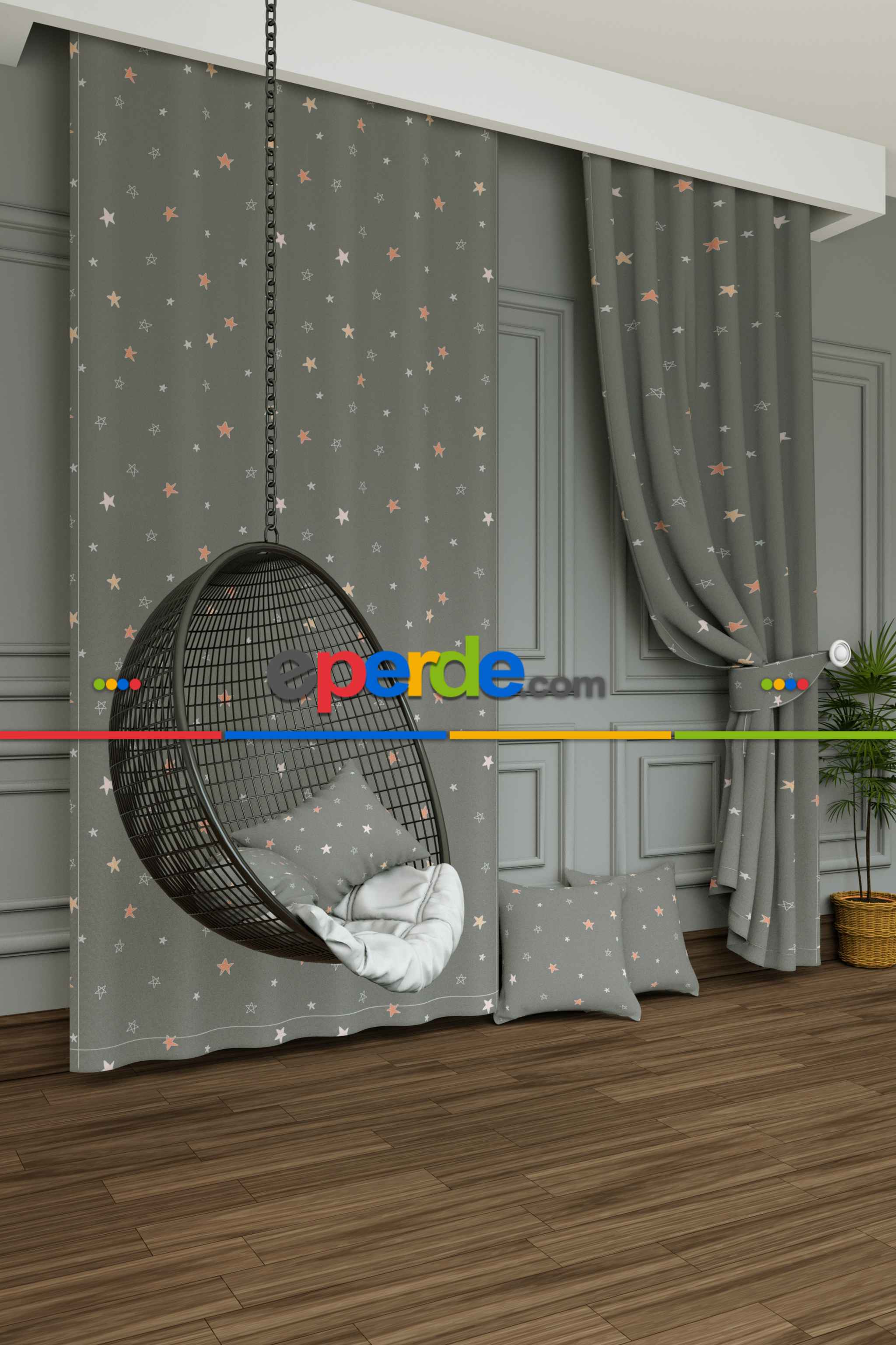 Dökümlü Kumaştan Yeşilimsi Gri Yıldız Desenli Baskılı Fon Perde Geniş En 1. Kalite