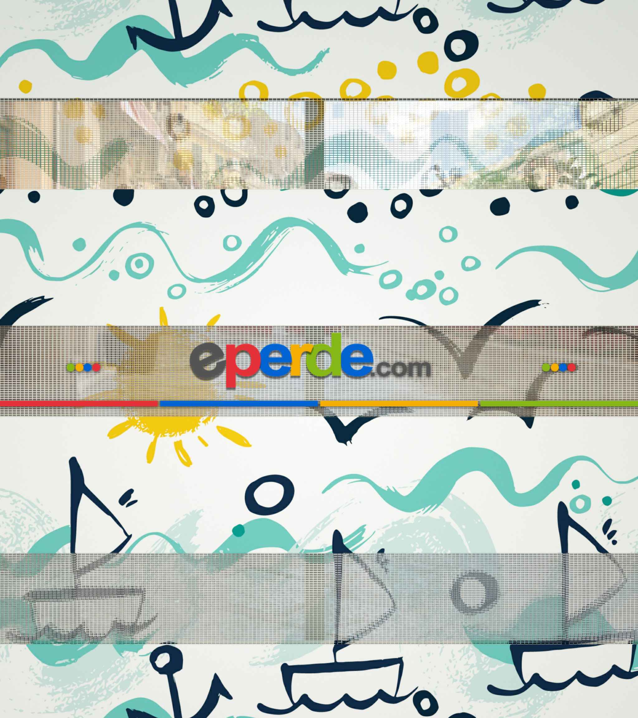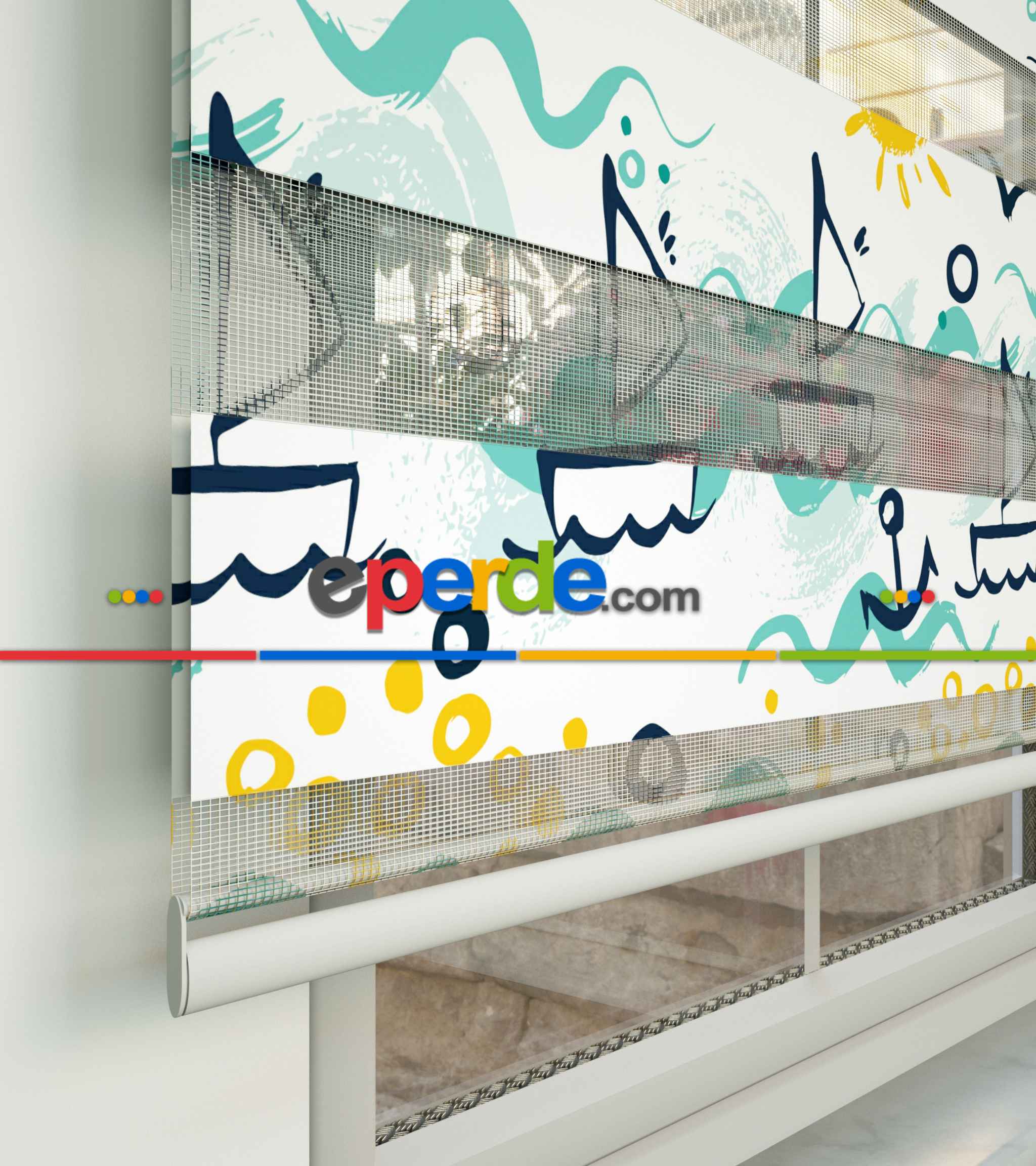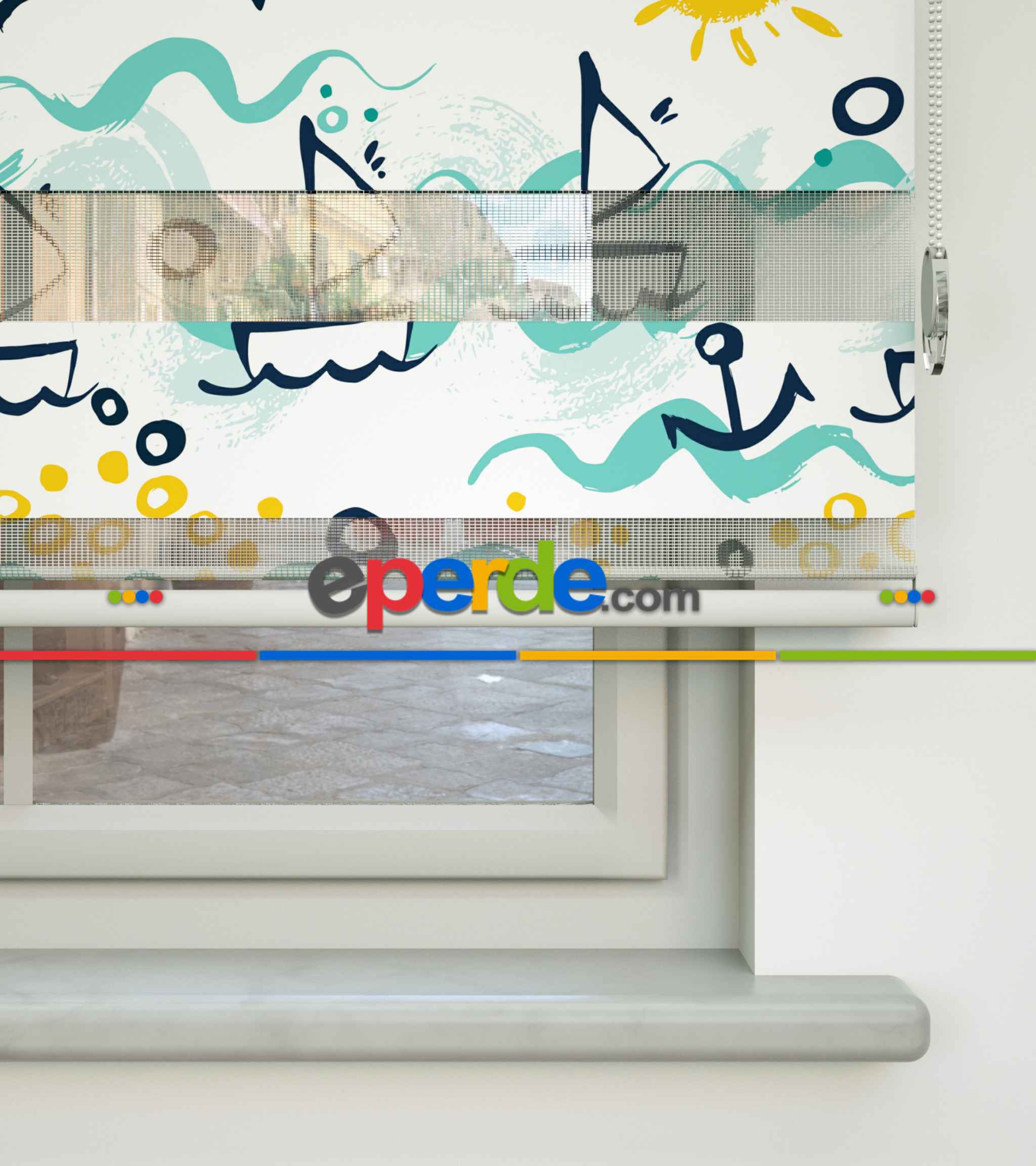 Çocuk Odası Zebra Perde - Denizci Desen Baskılı Zebra Perde- Mavi-Sarı-Beyaz-Su Yeşili