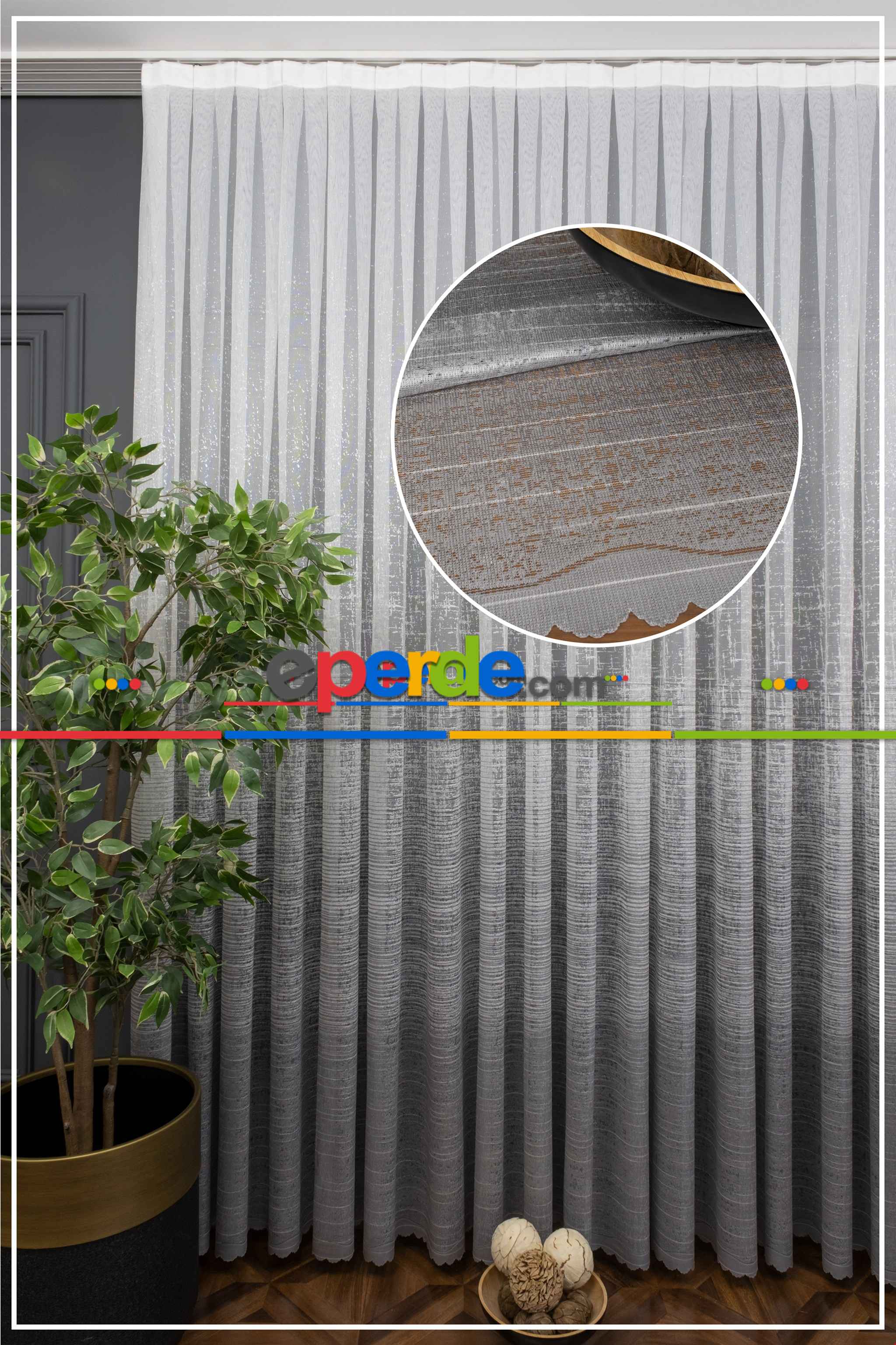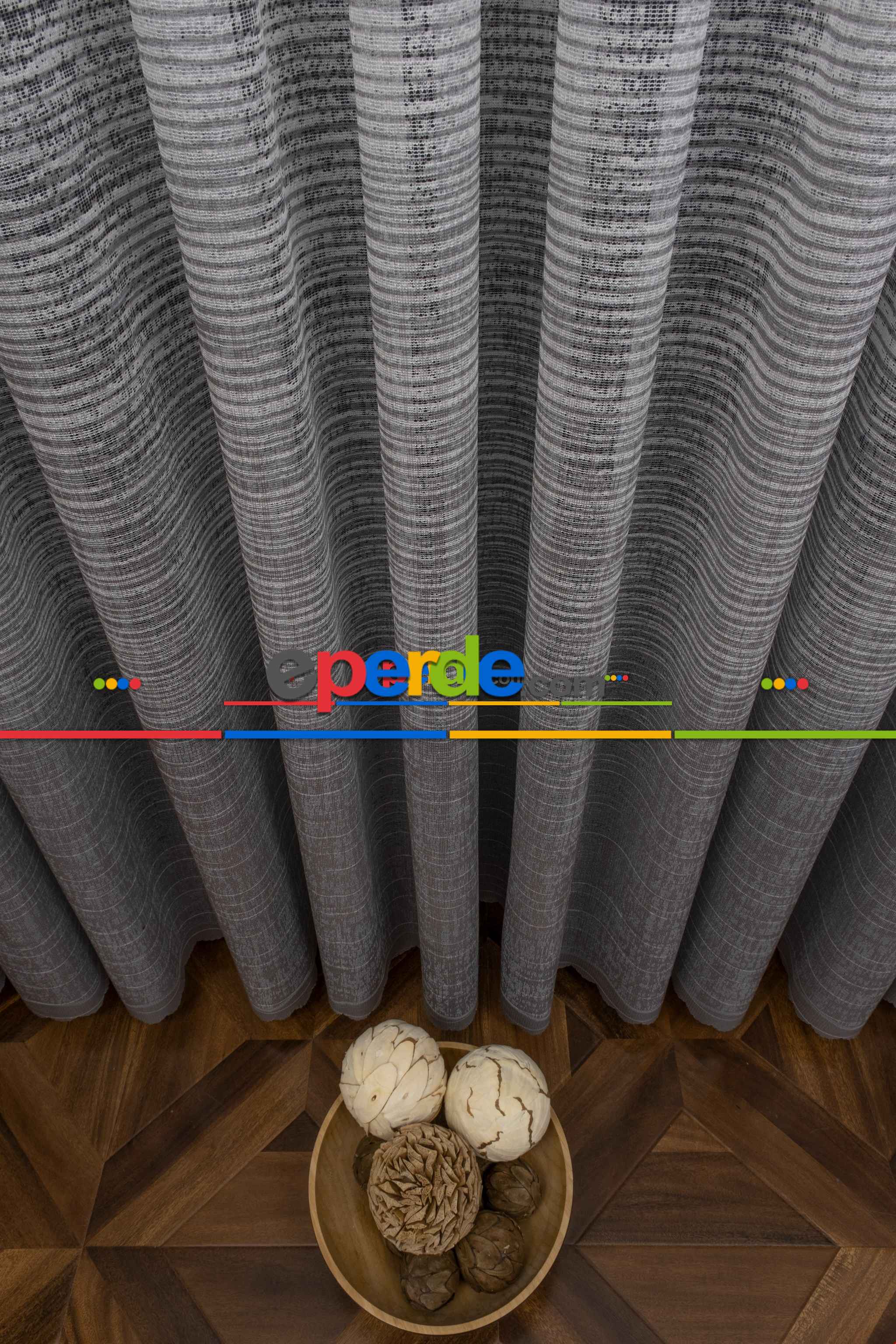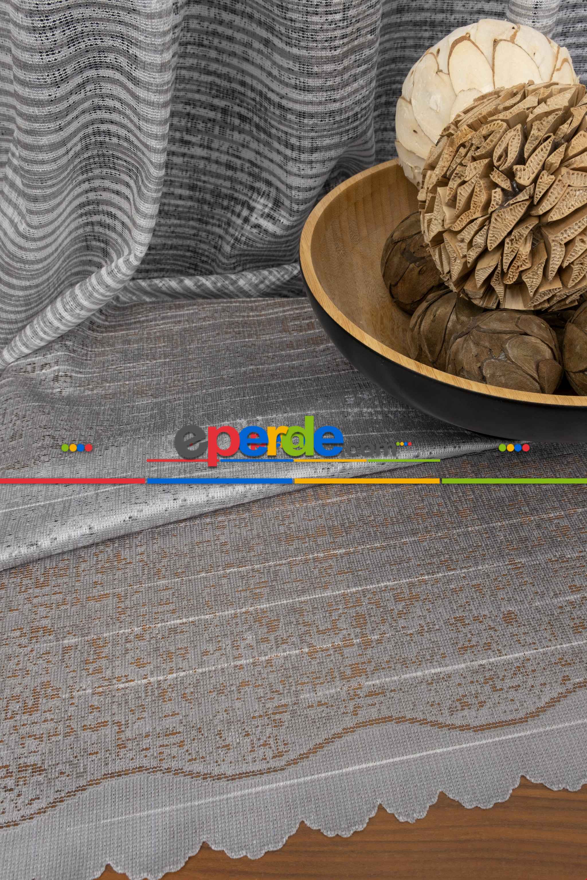 Fırsat Ürünü!! Hazır Ölçülü Gri Modern Çizgili Örme Tül - Eteği Açık Gri Üstü Ekru Renk ( Degrade Geçişli )