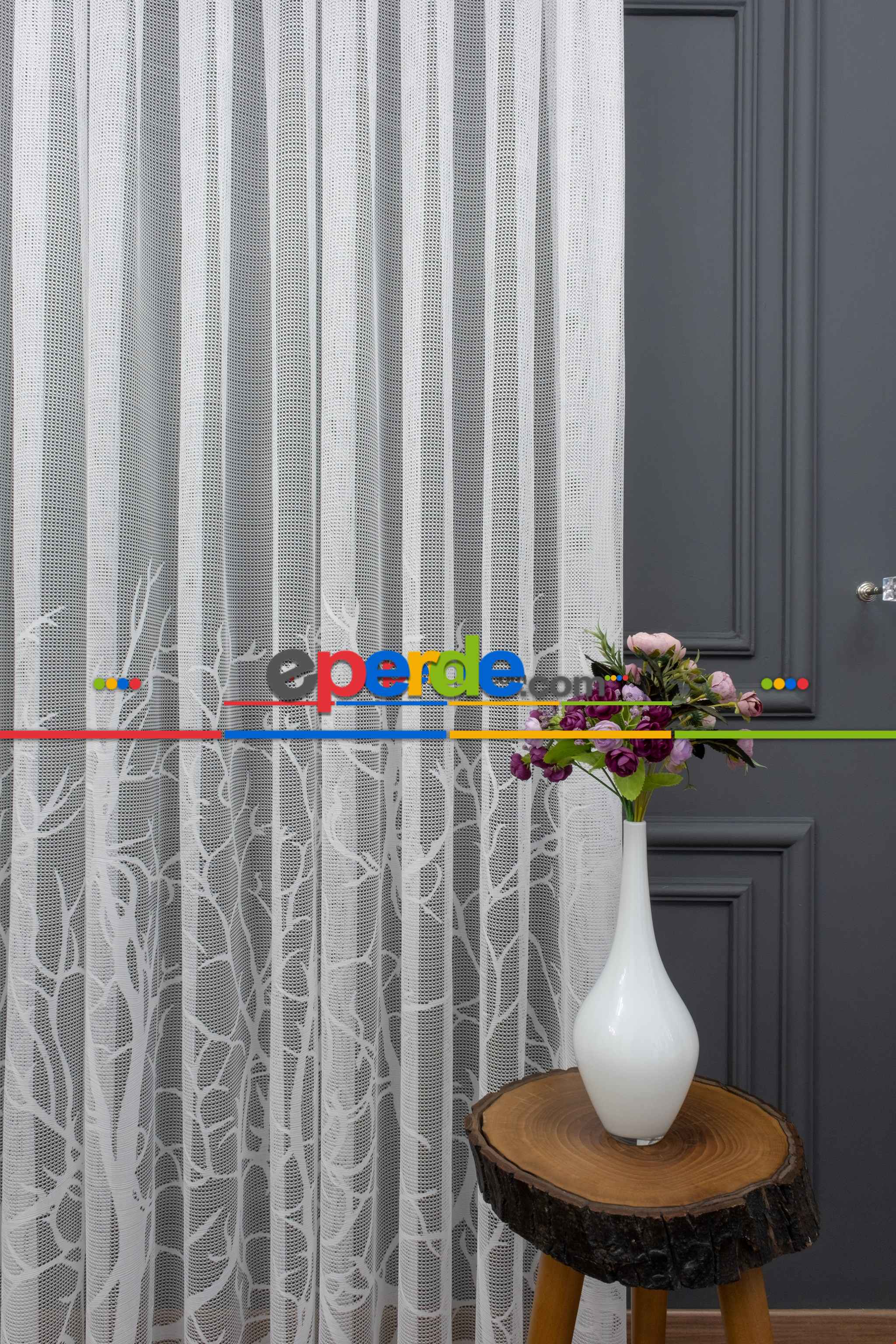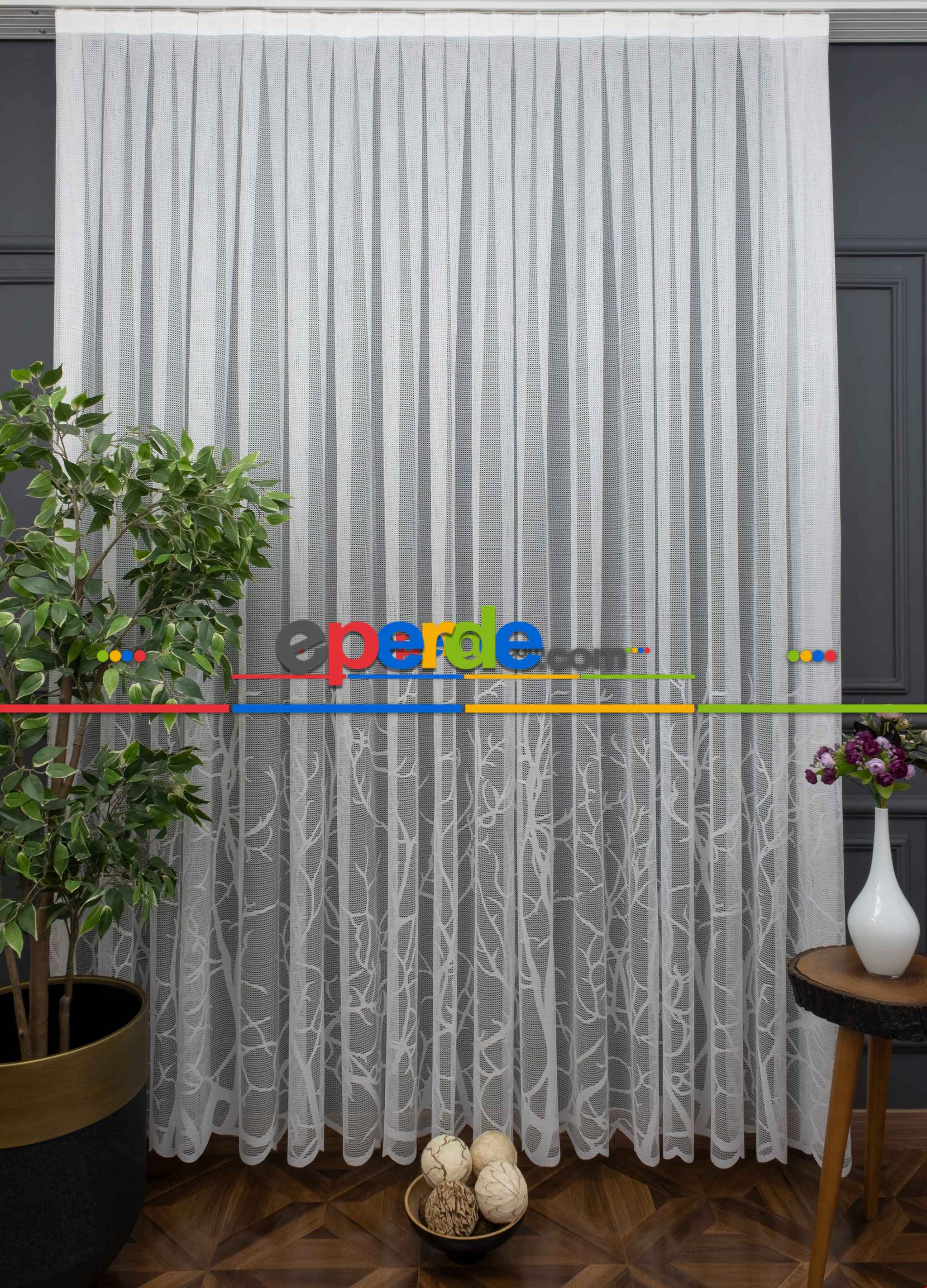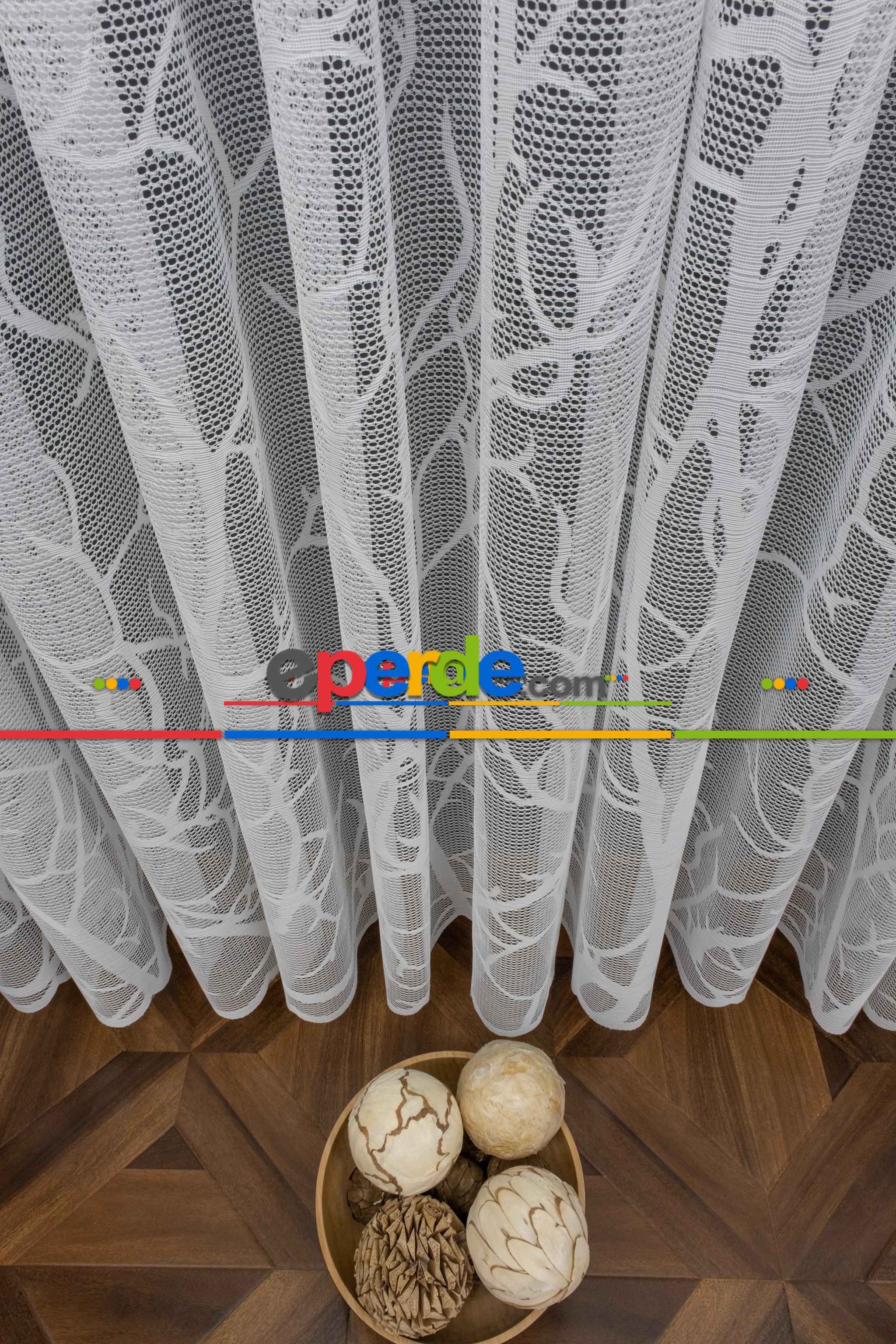 Hazır Ölçülü Eteği Dal Ağaç Desenli Örme Tül - Ekru