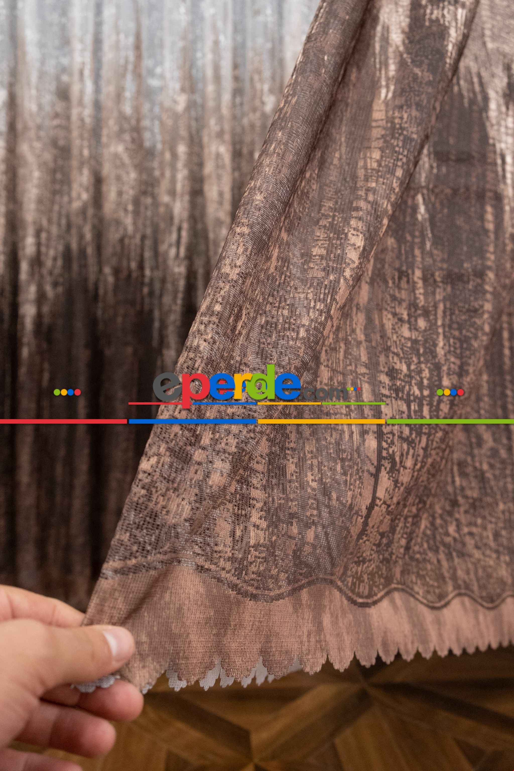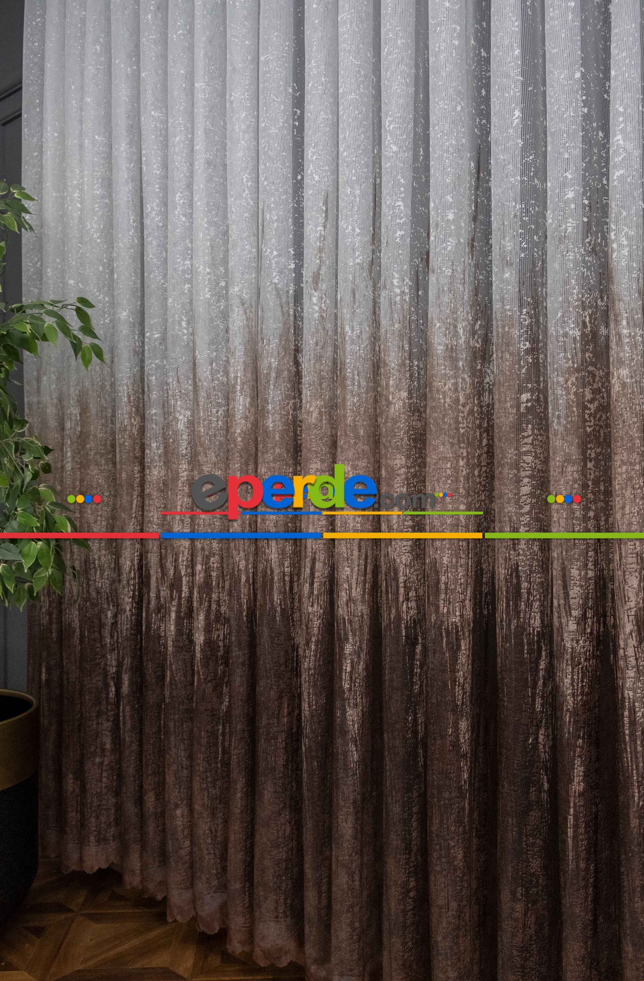Hazır Ölçülü Modern Koyu Kahverengi Desenli Degrade Geçişli Yüksek Kalite Örme Tül Perde