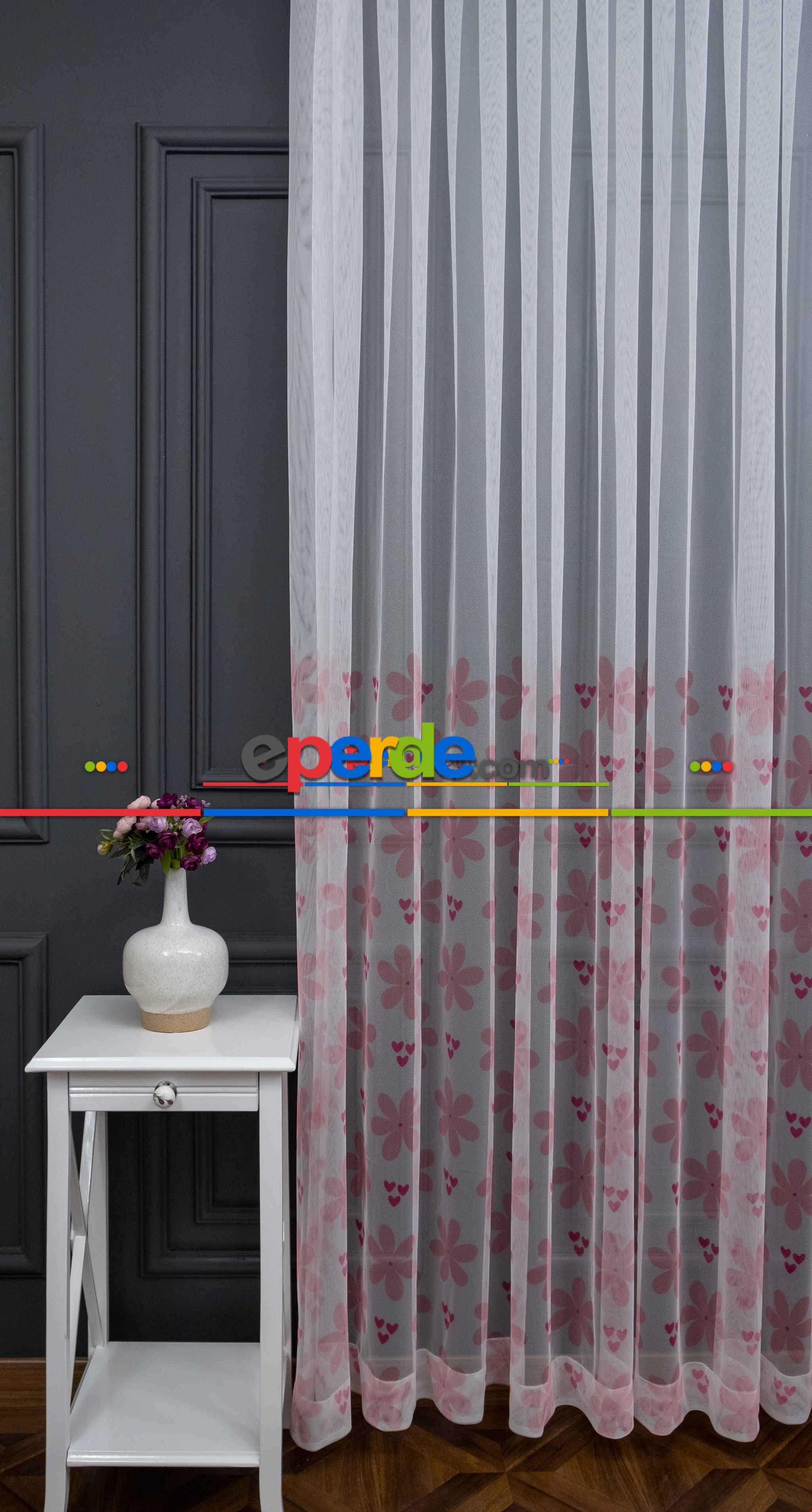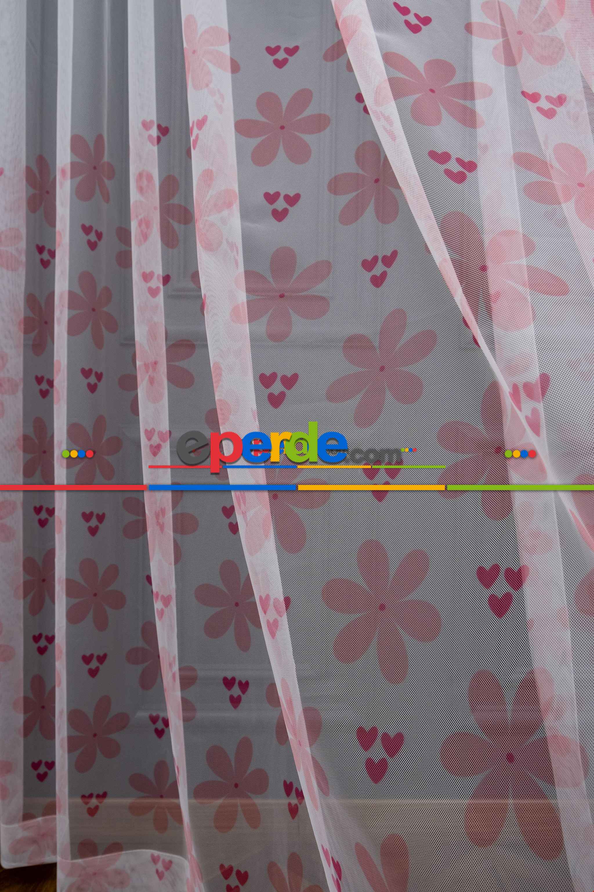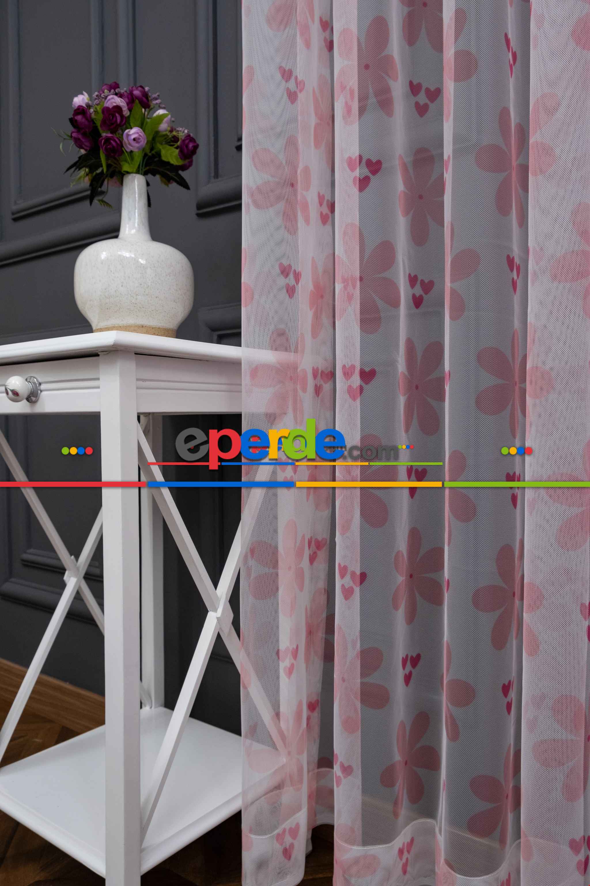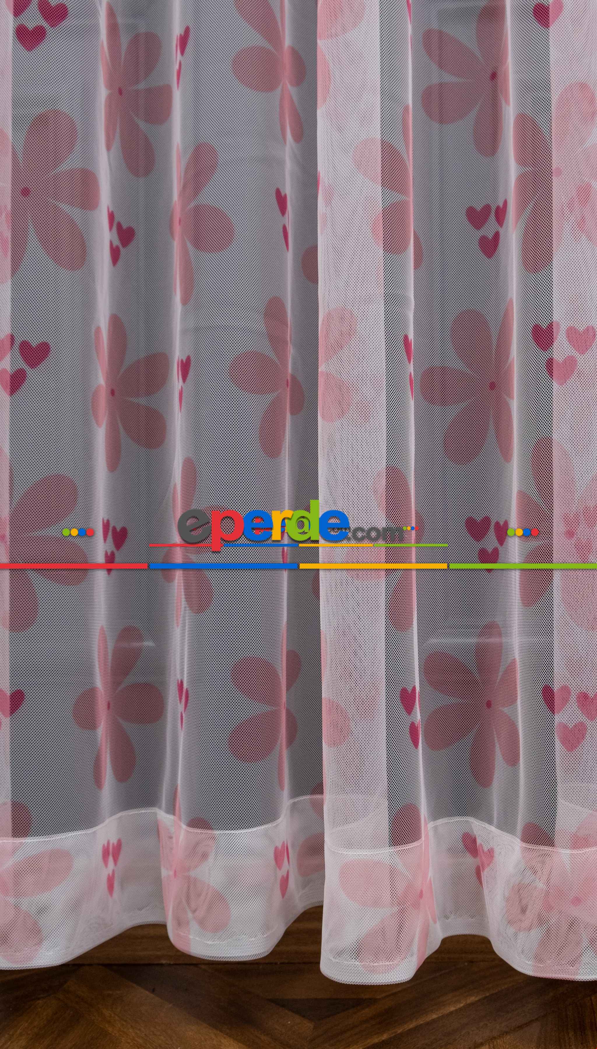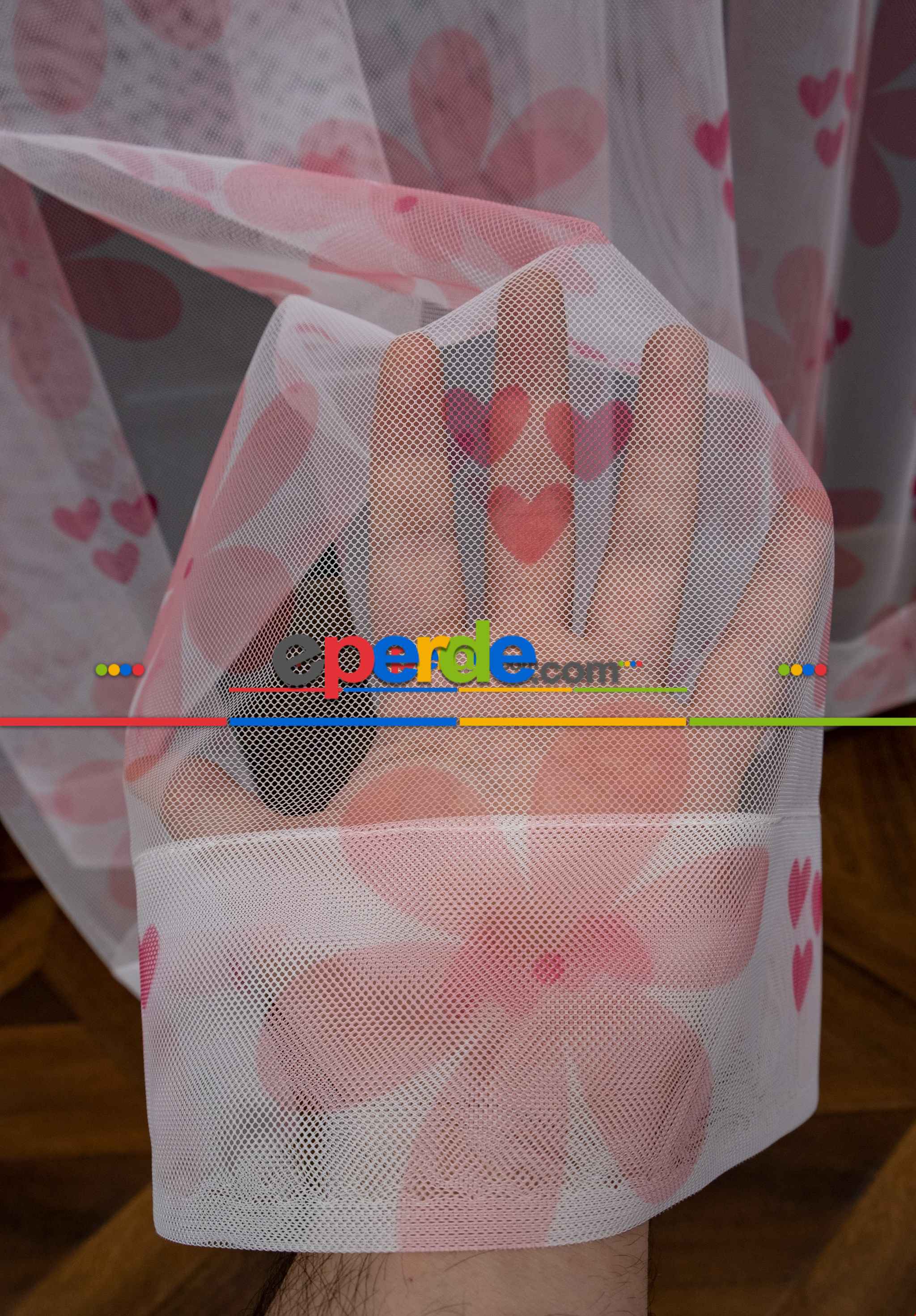 Hazır Ölçülü Petek Zemin Açık Pembe Renkli Kalp Ve Çiçek Desenli Grek Baskılı Tül Perde Ödeme Seçenekleri