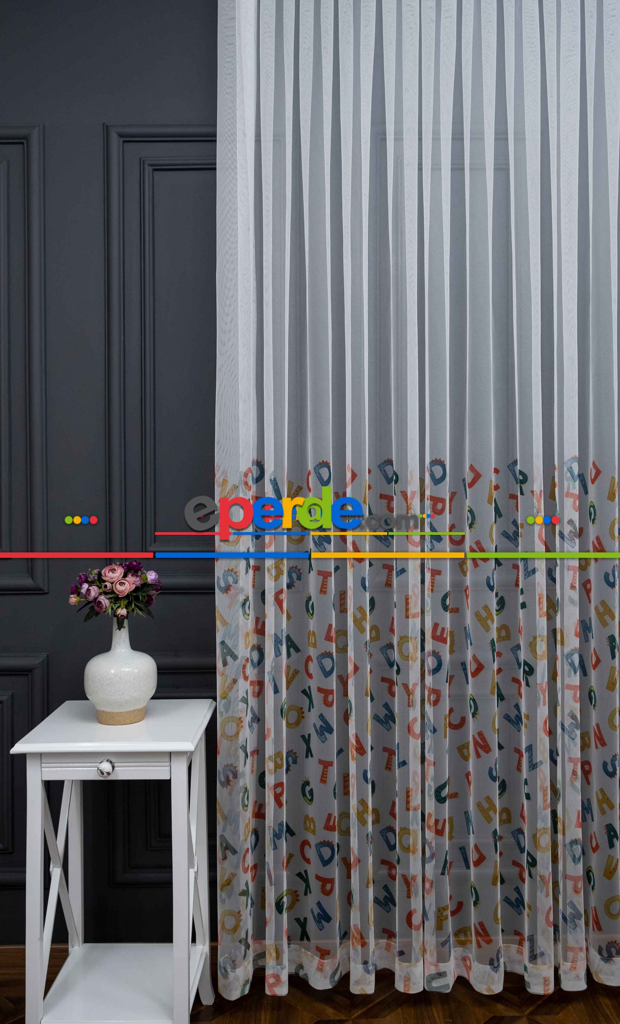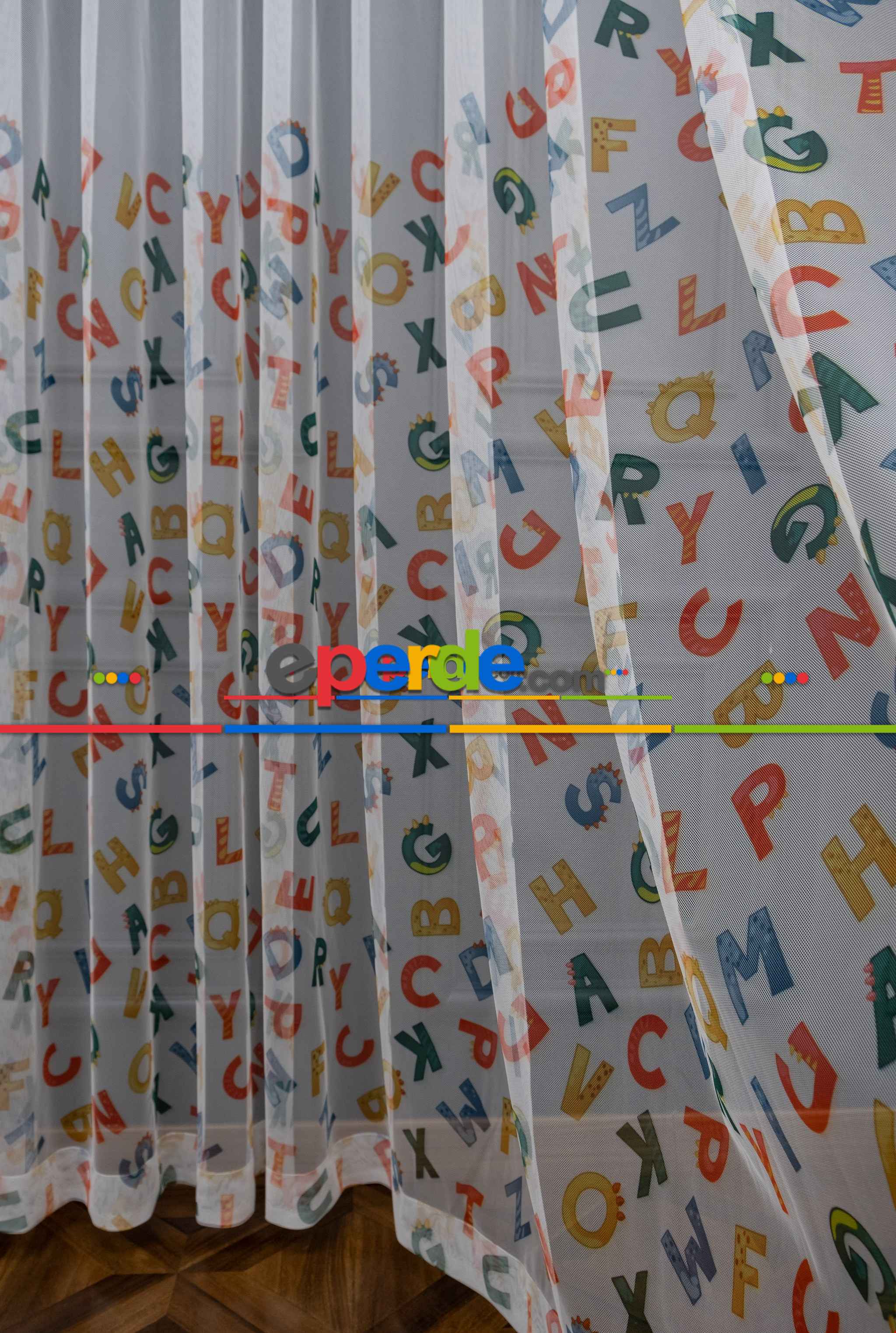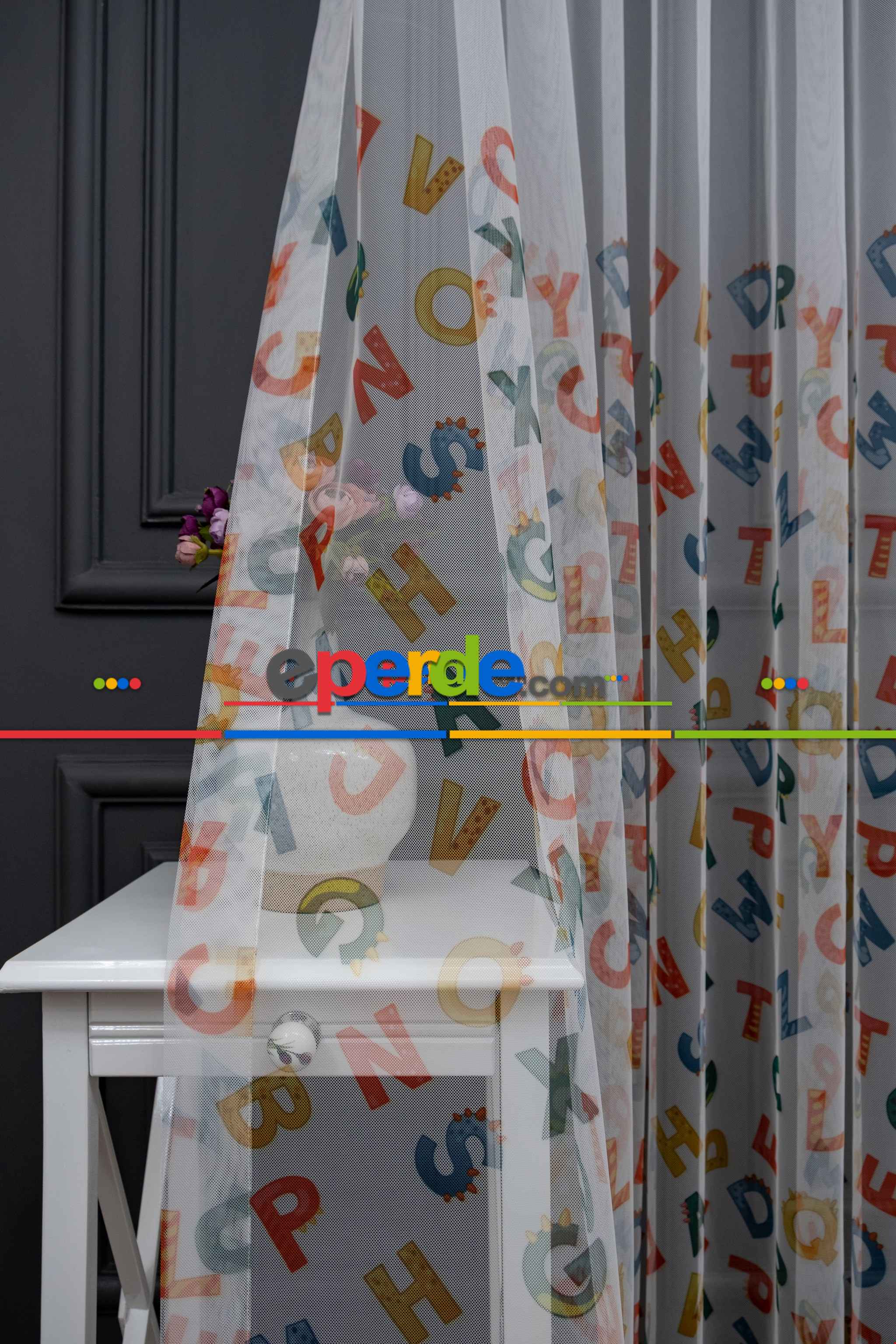 Hazır Ölçülü Petek Zemin Çok Renkli Harfler Desenli Grek Baskılı Tül Perde Ödeme Seçenekleri