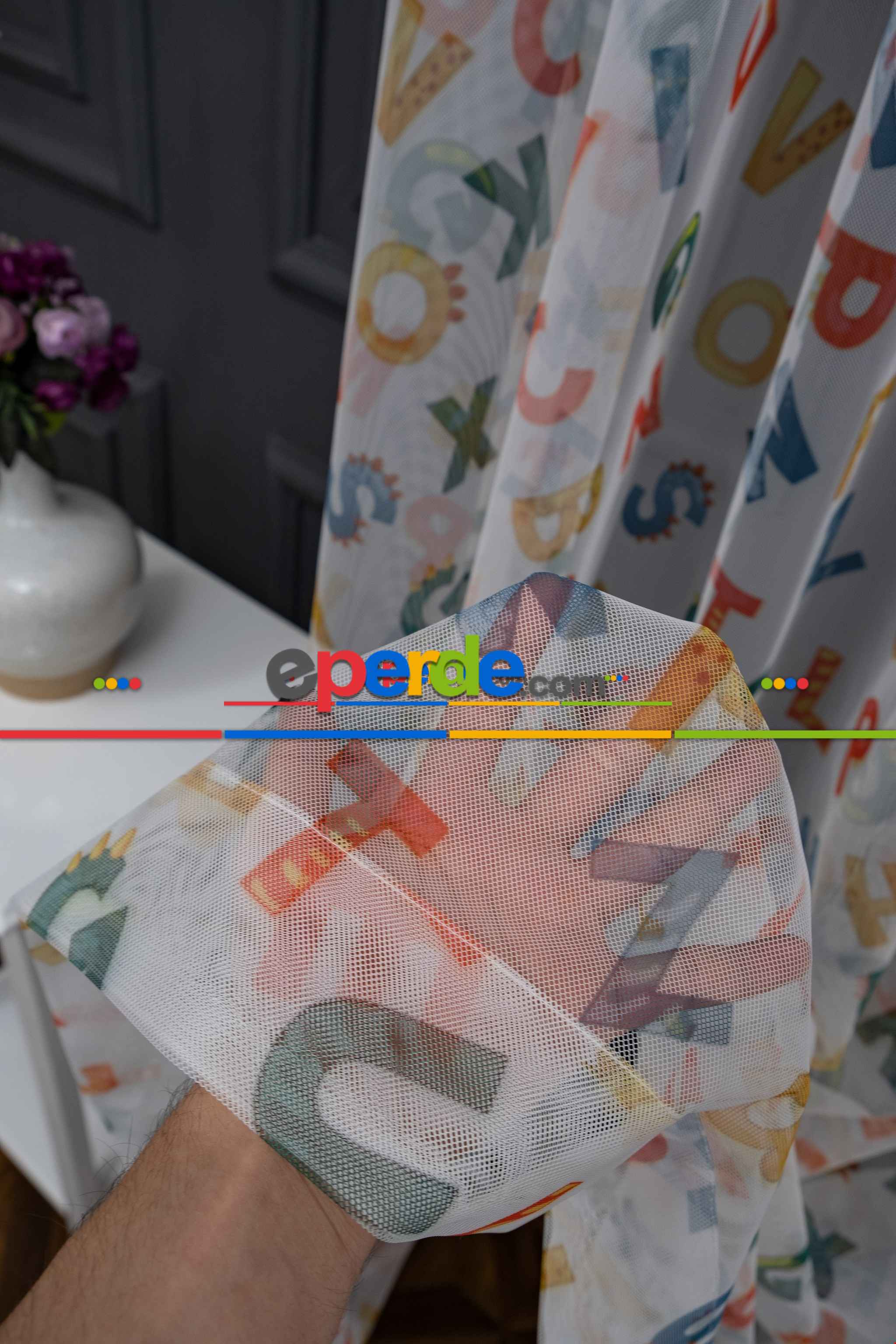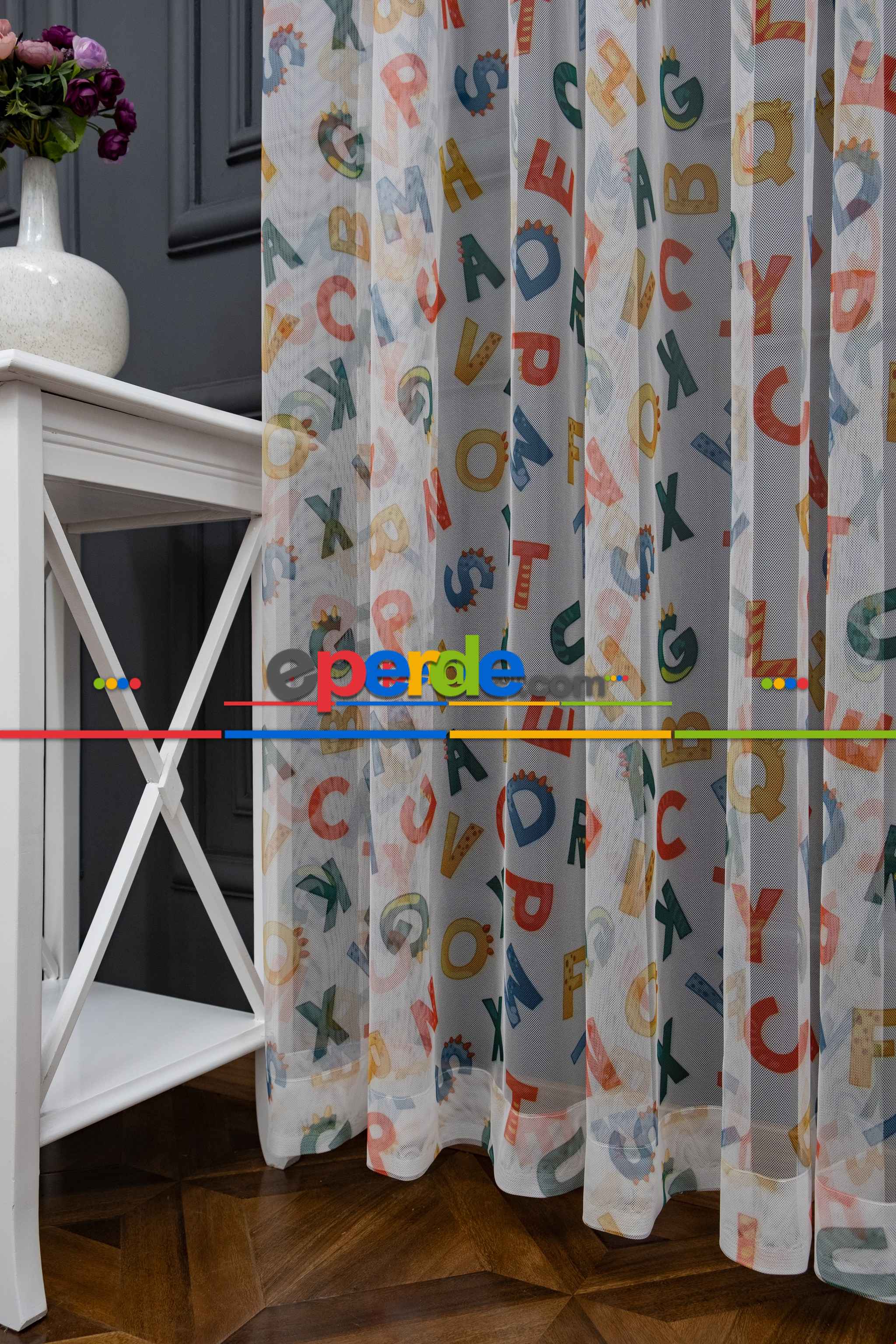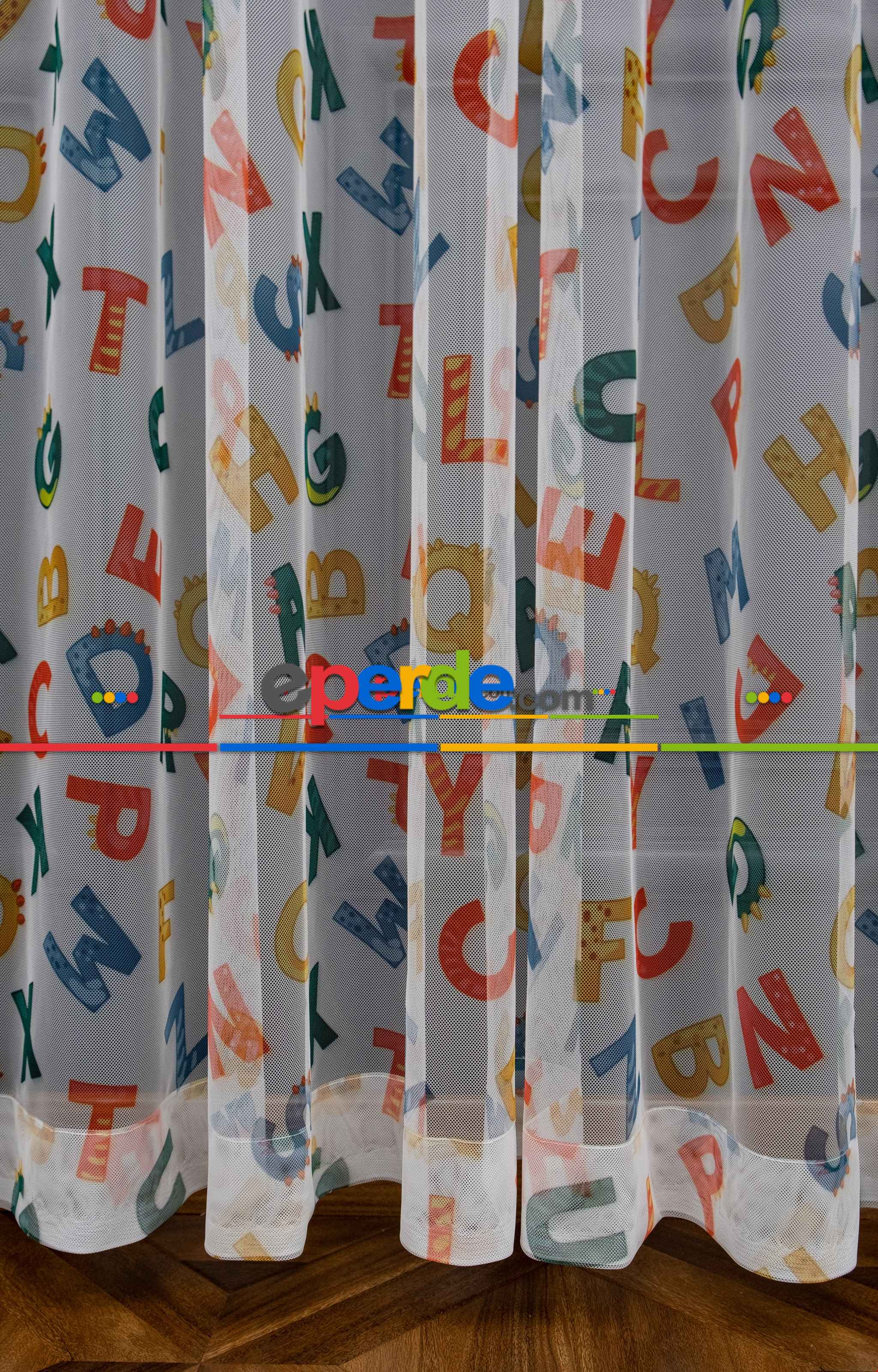 Hazır Ölçülü Petek Zemin Çok Renkli Harfler Desenli Grek Baskılı Tül Perde » Eperde