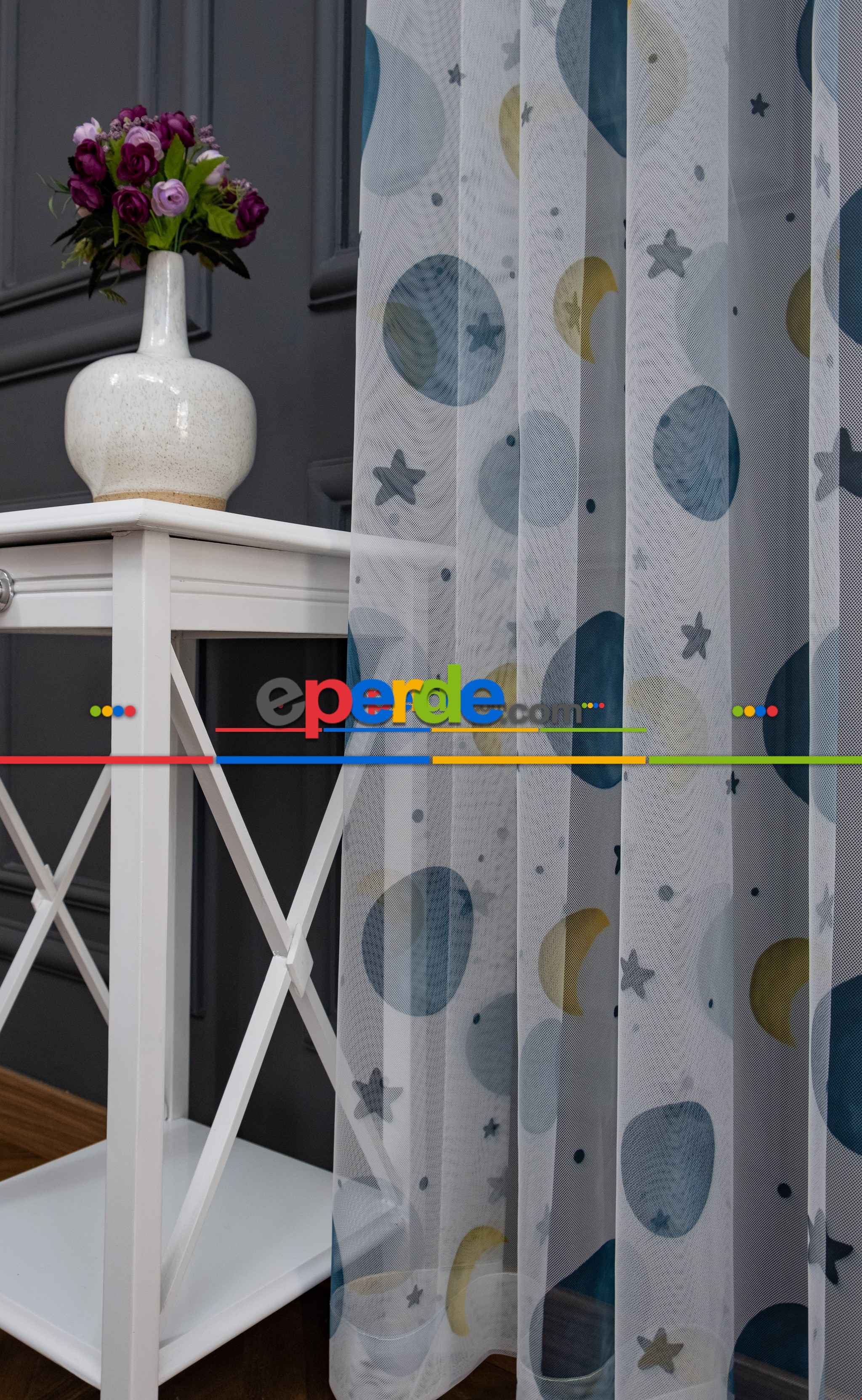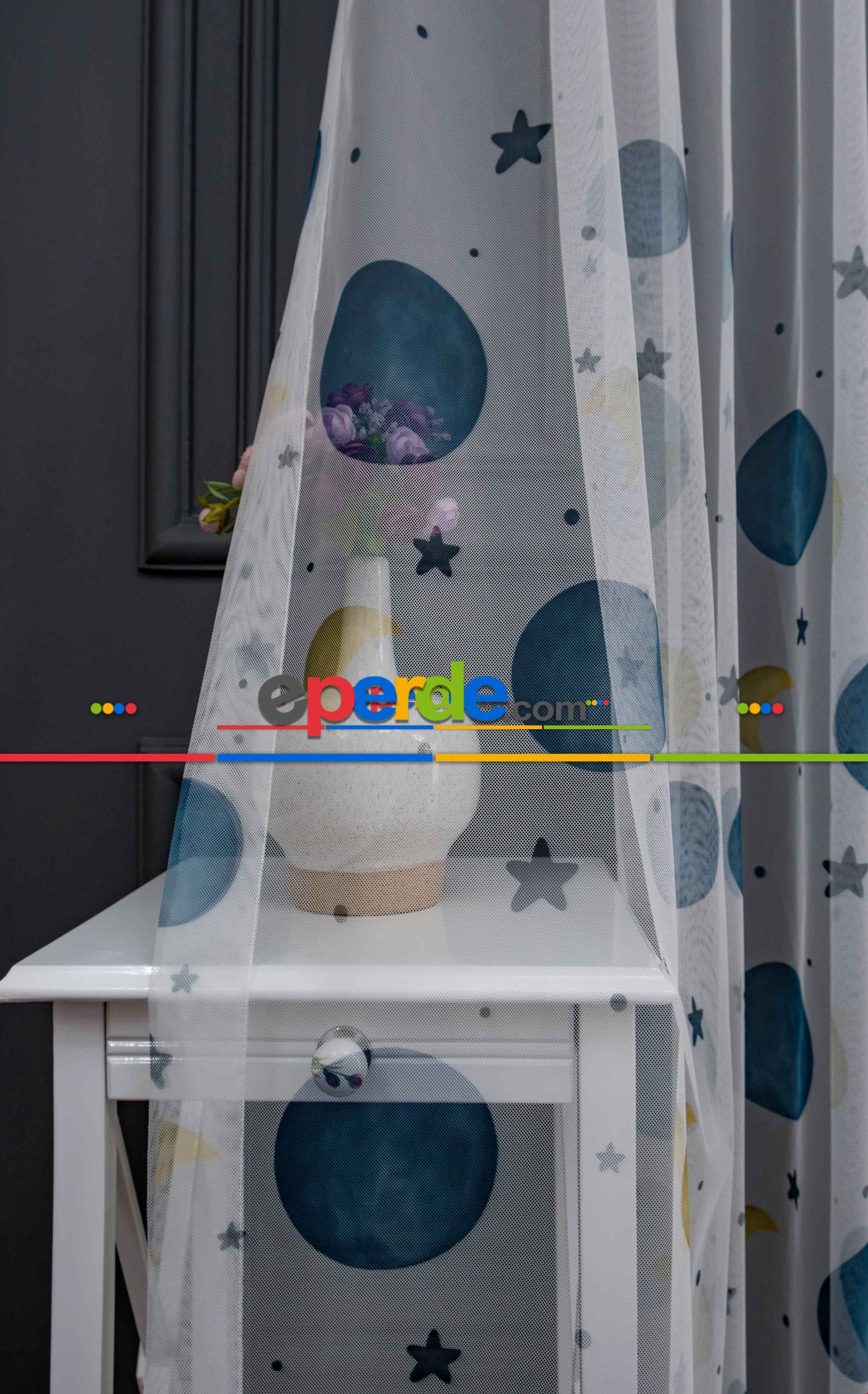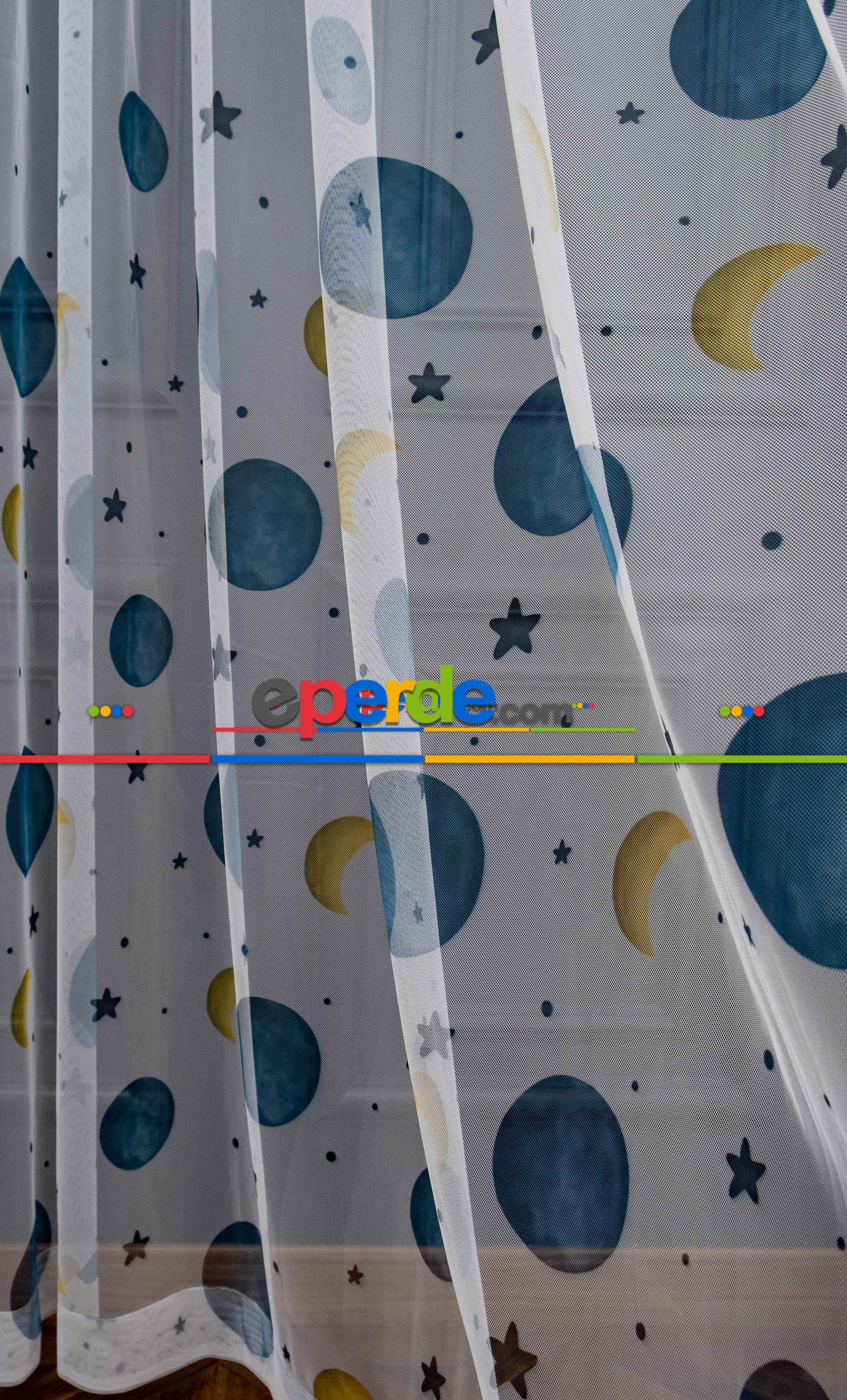 Hazır Ölçülü Petek Zemin Gece Mavisi Ve Sarı Renkli Gezegenler Desenli Grek Baskılı Tül Perde Ödeme Seçenekleri