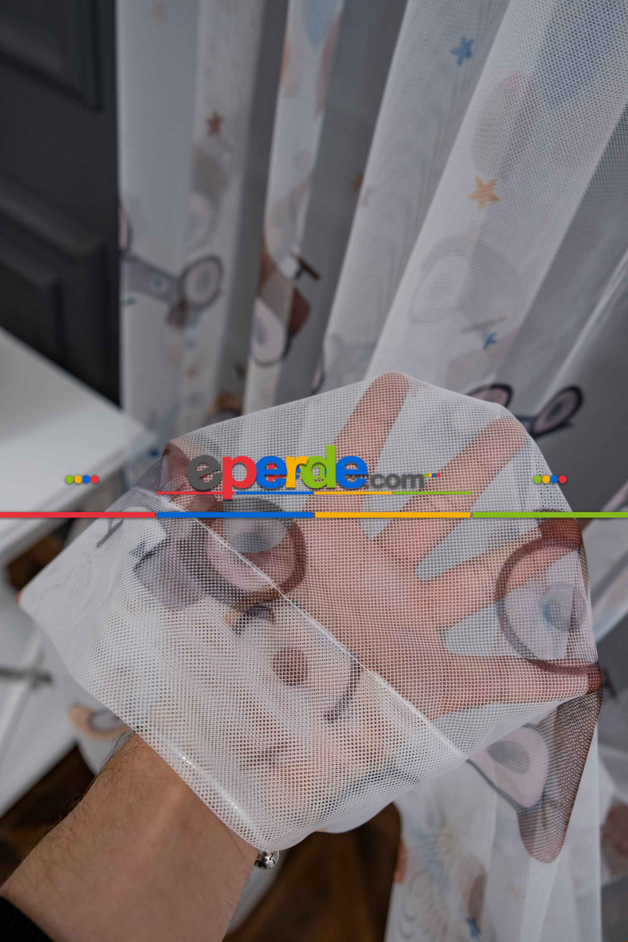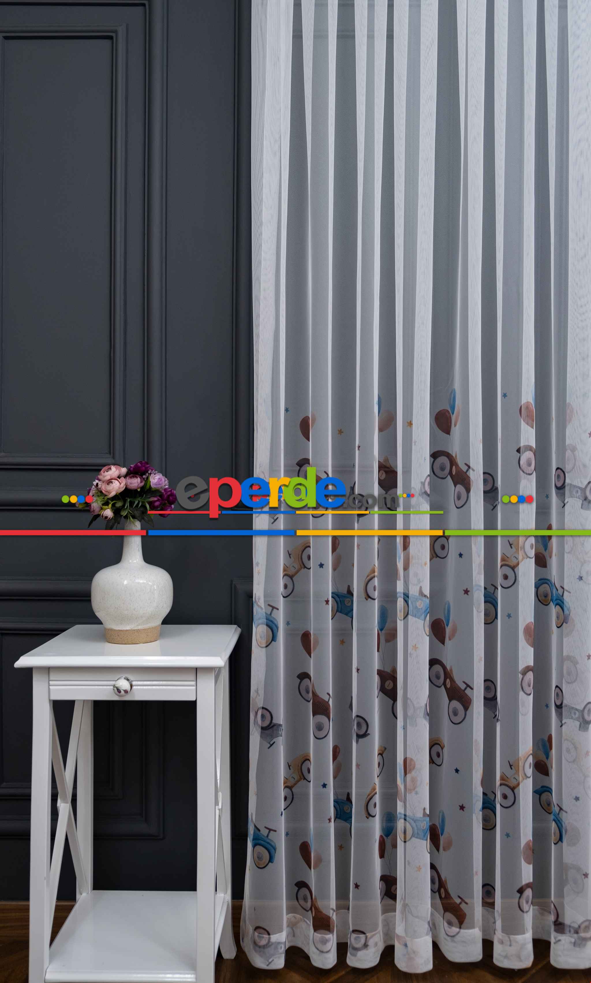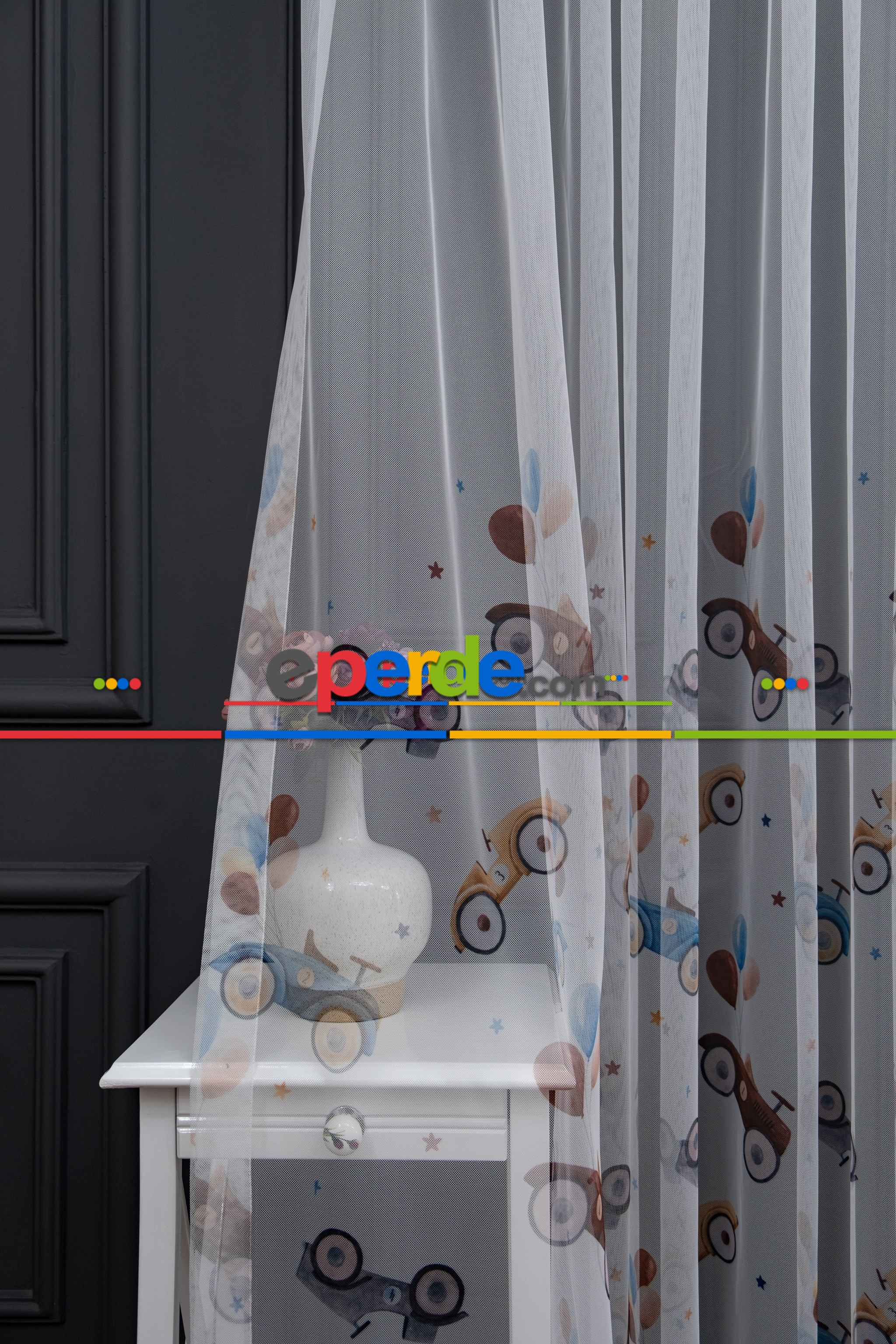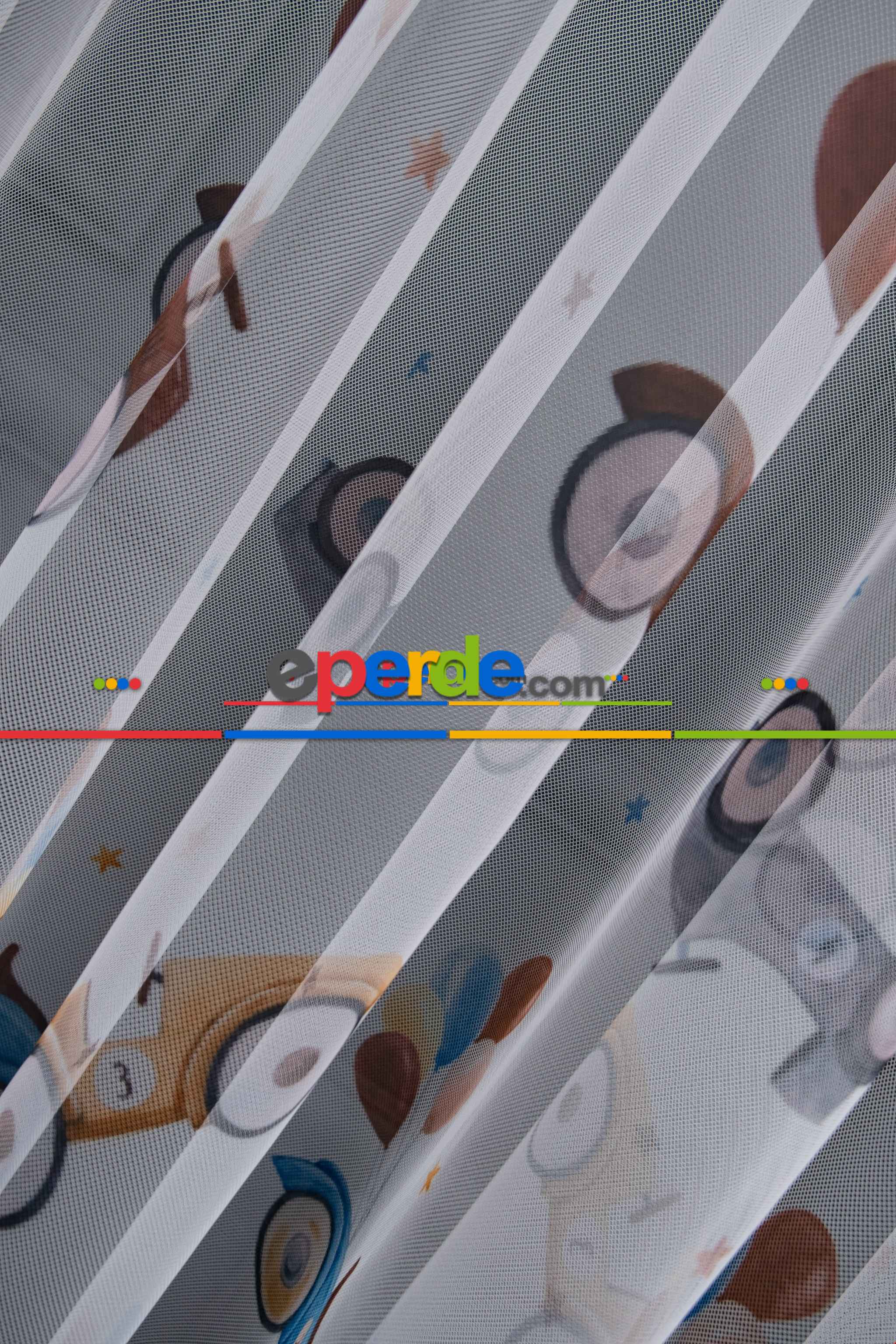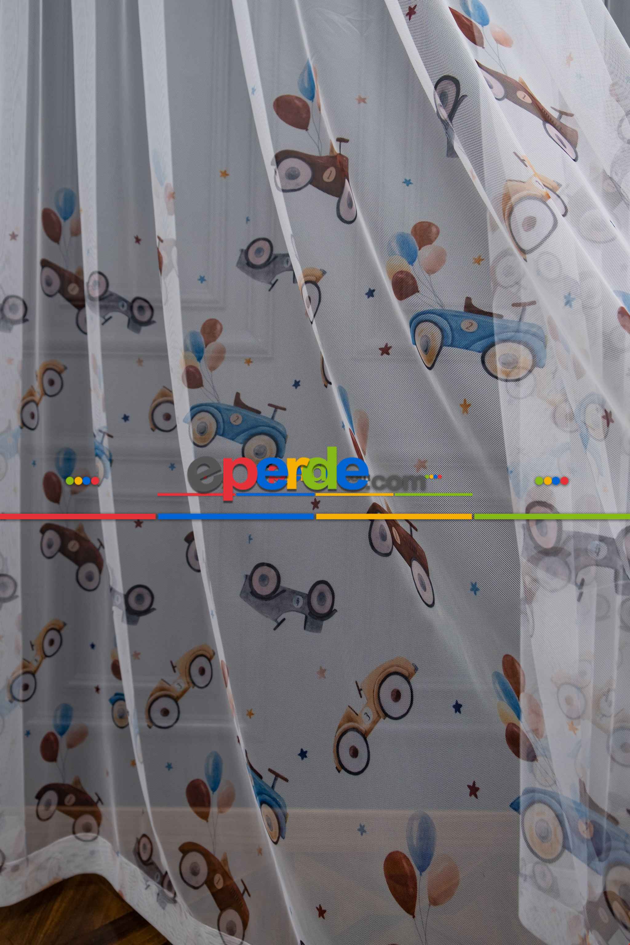 Hazır Ölçülü Petek Zemin Kahverengi Ve Mavi Renkli Araba Ve Balon Desenli Grek Baskılı Tül Perde Ödeme Seçenekleri