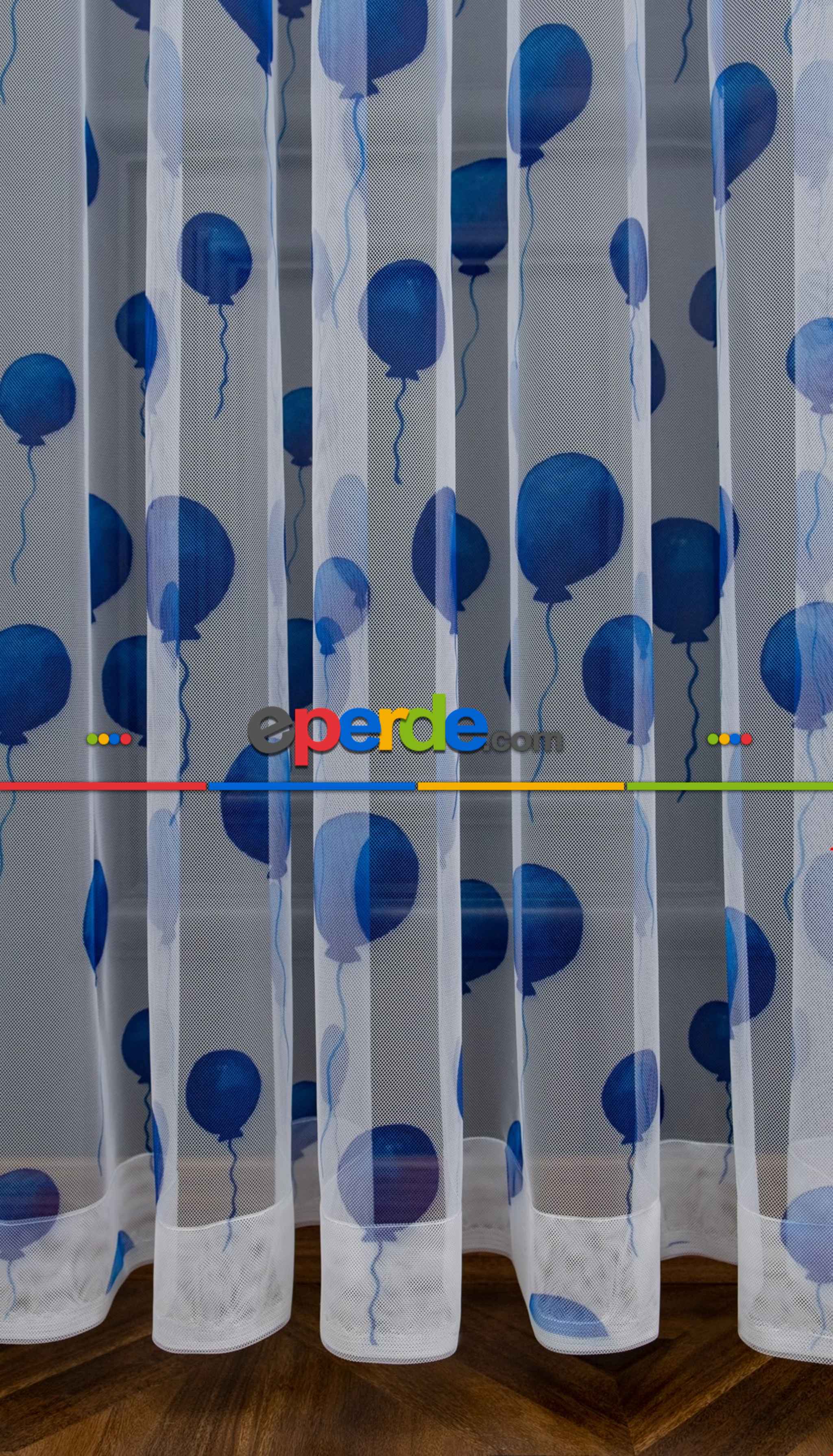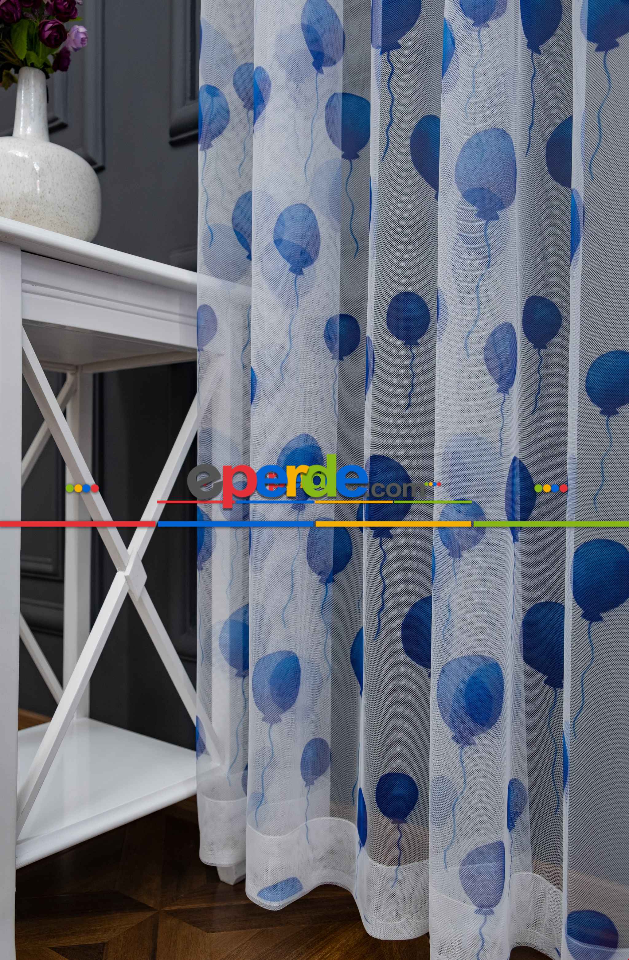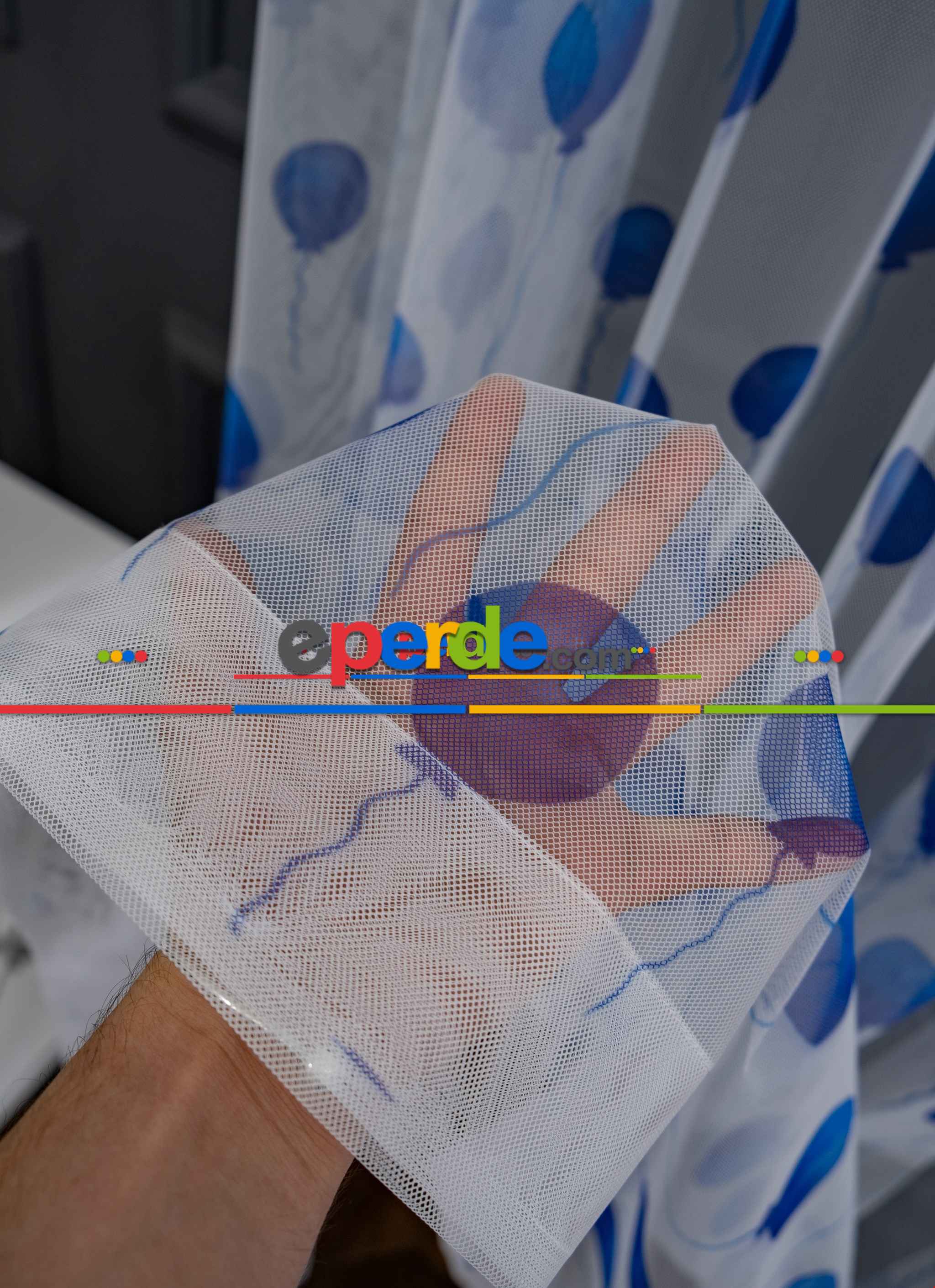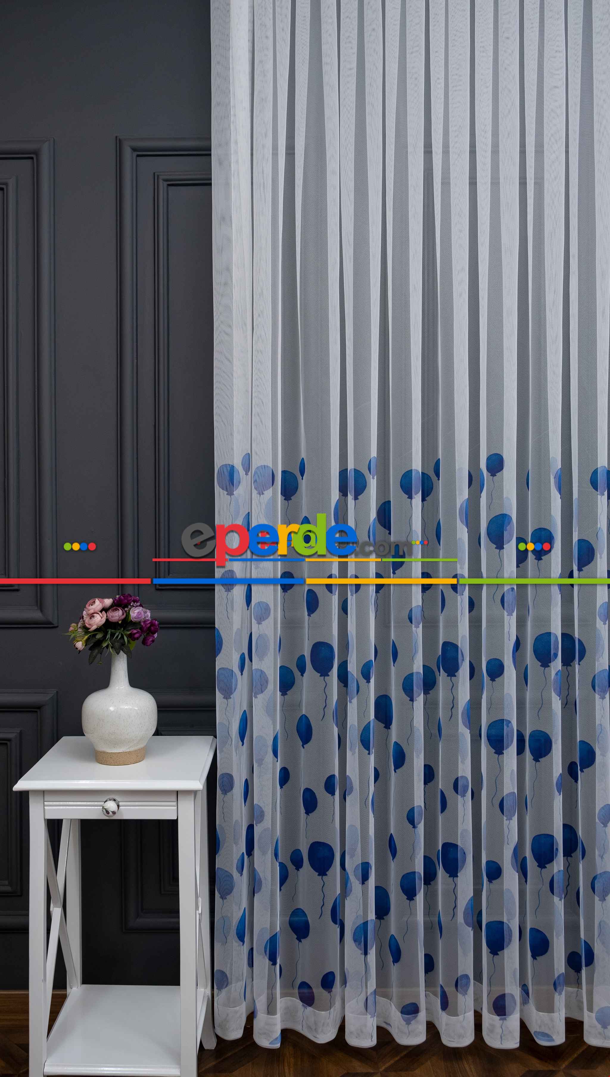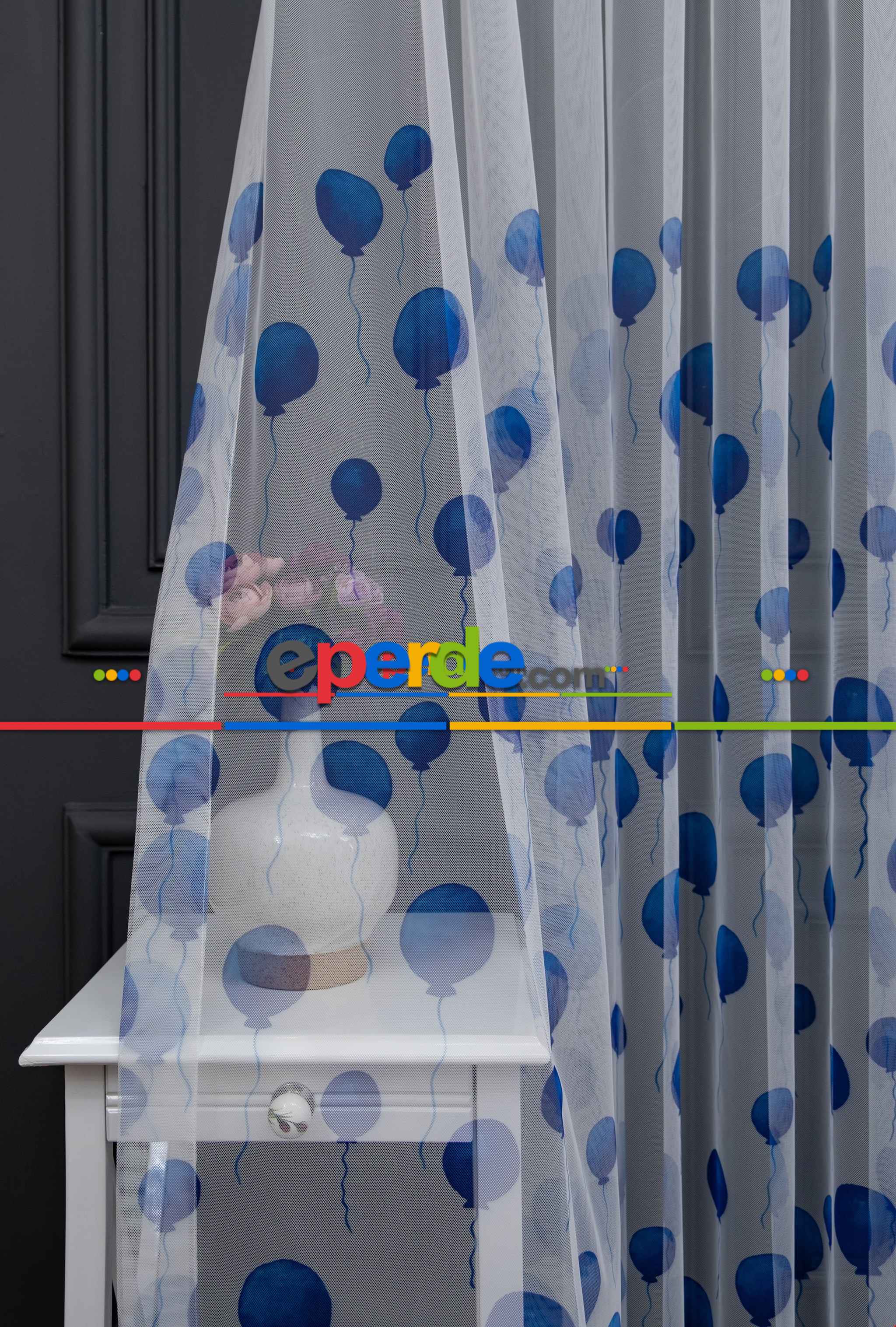Hazır Ölçülü Petek Zemin Koyu Mavi Renkli Balonlar Desenli Grek Baskılı Tül Perde Ödeme Seçenekleri