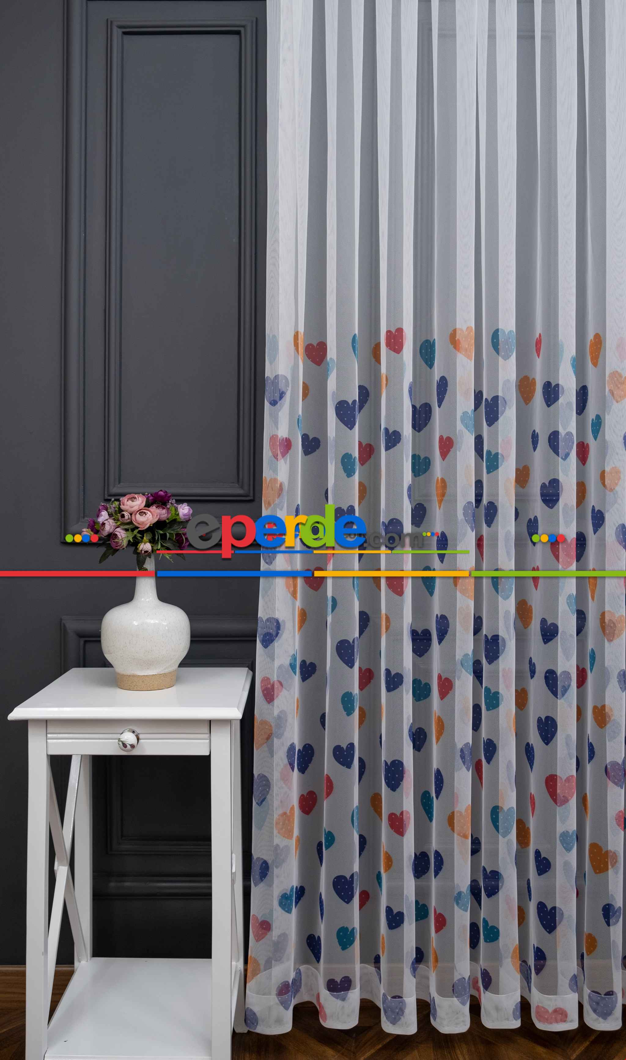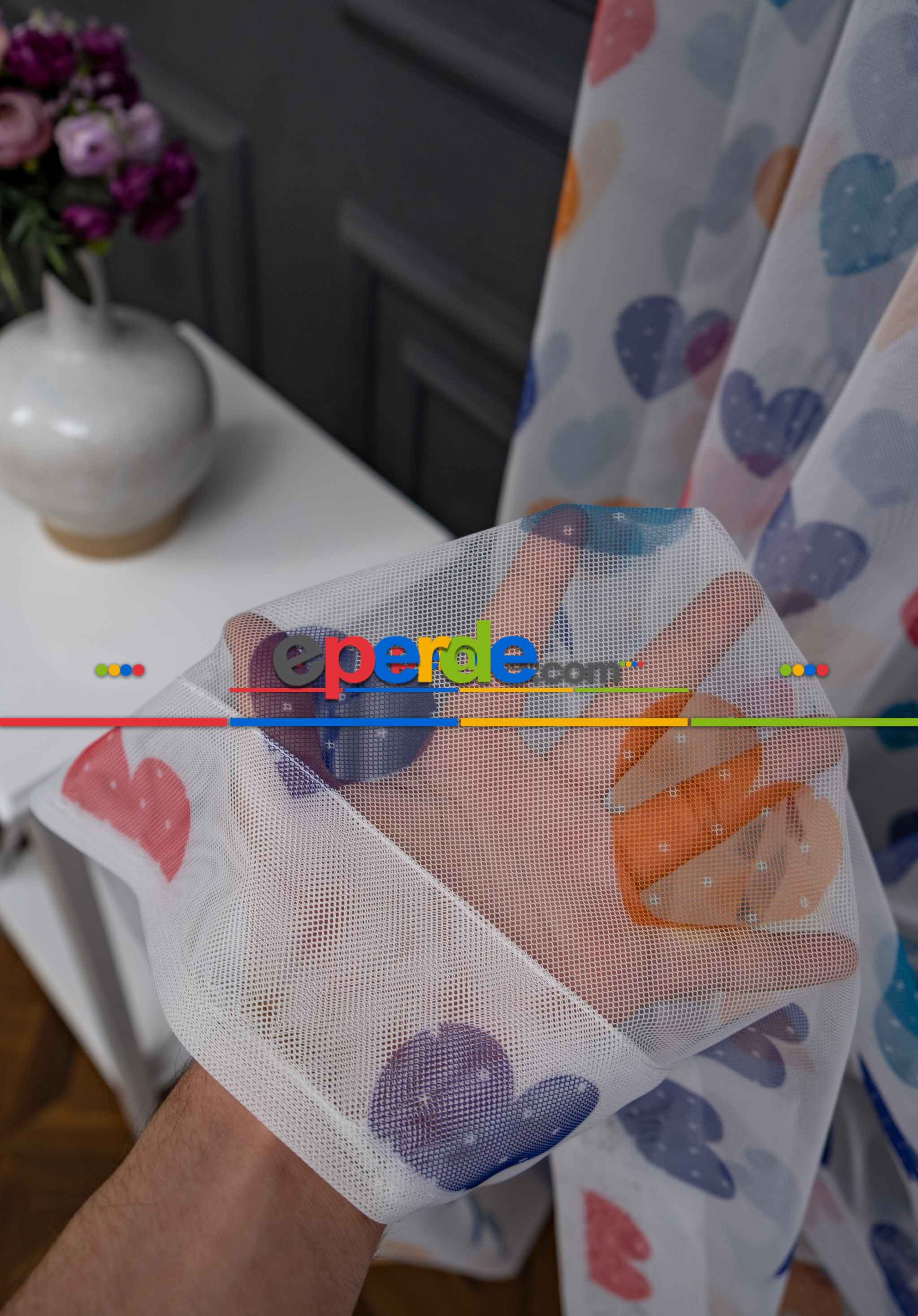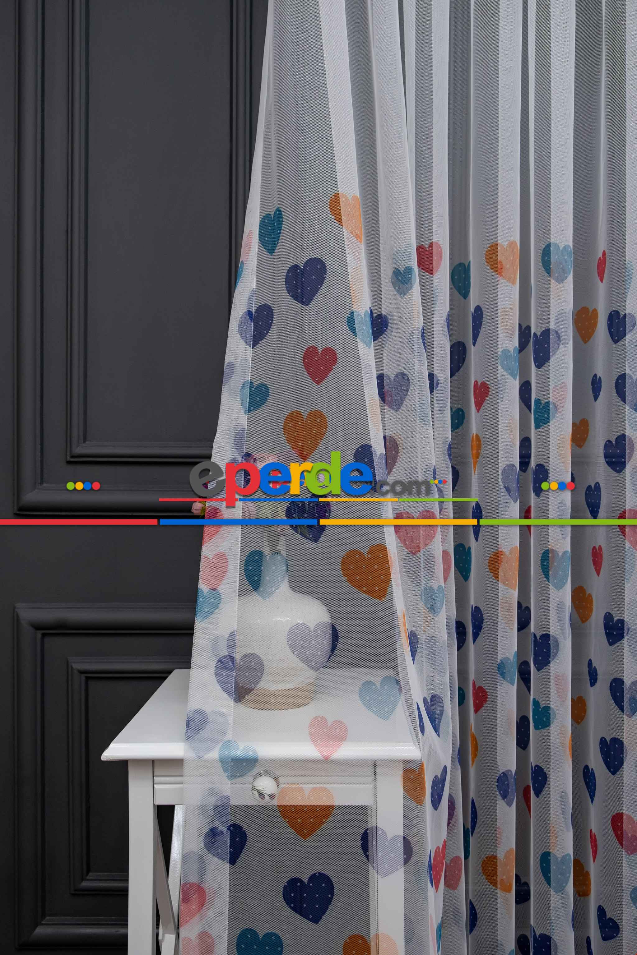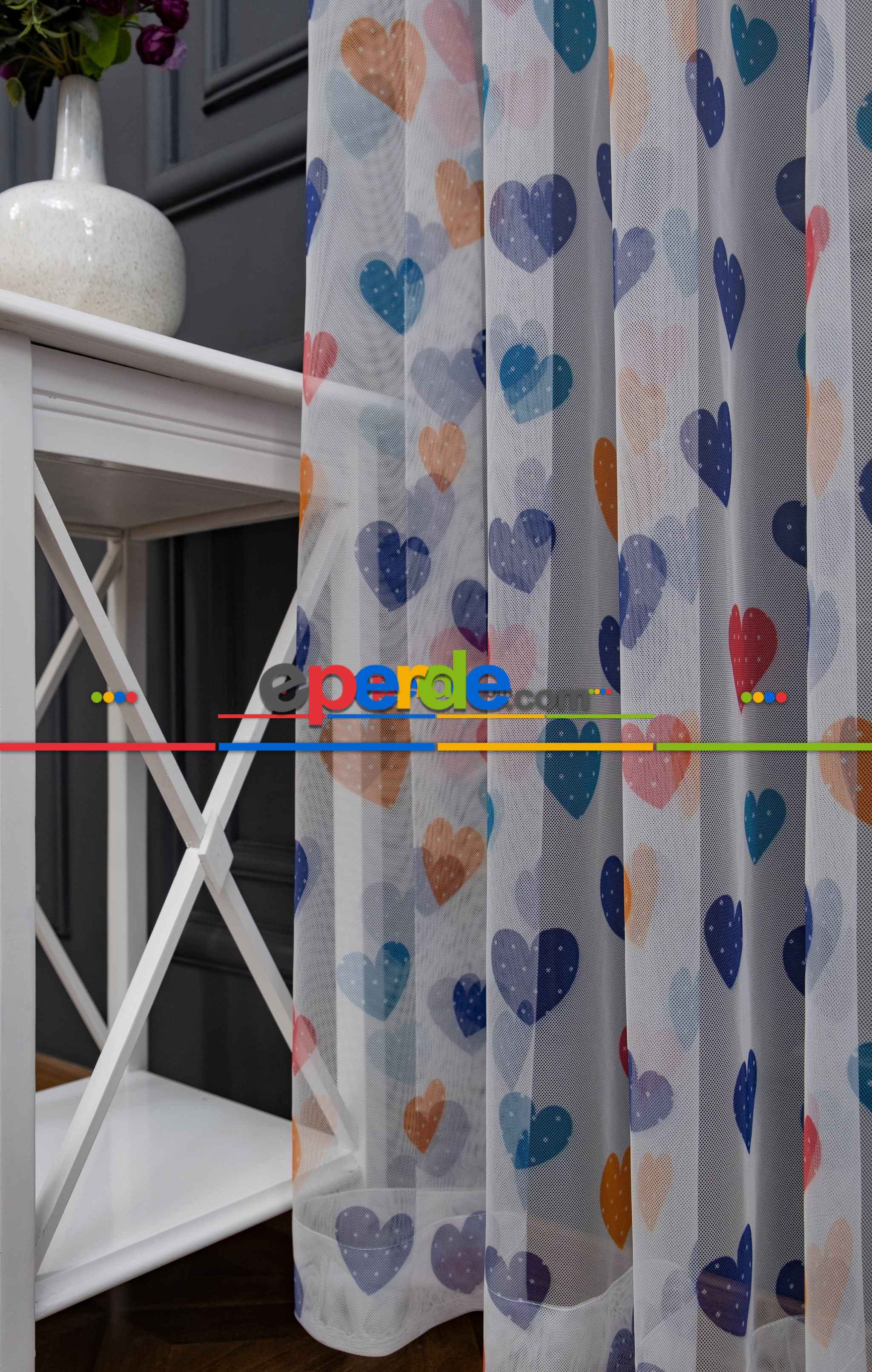 Hazır Ölçülü Petek Zemin Lacivert - Mavi Ve Turuncu Renkli Kalp Desenli Grek Baskılı Tül Perde » Eperde