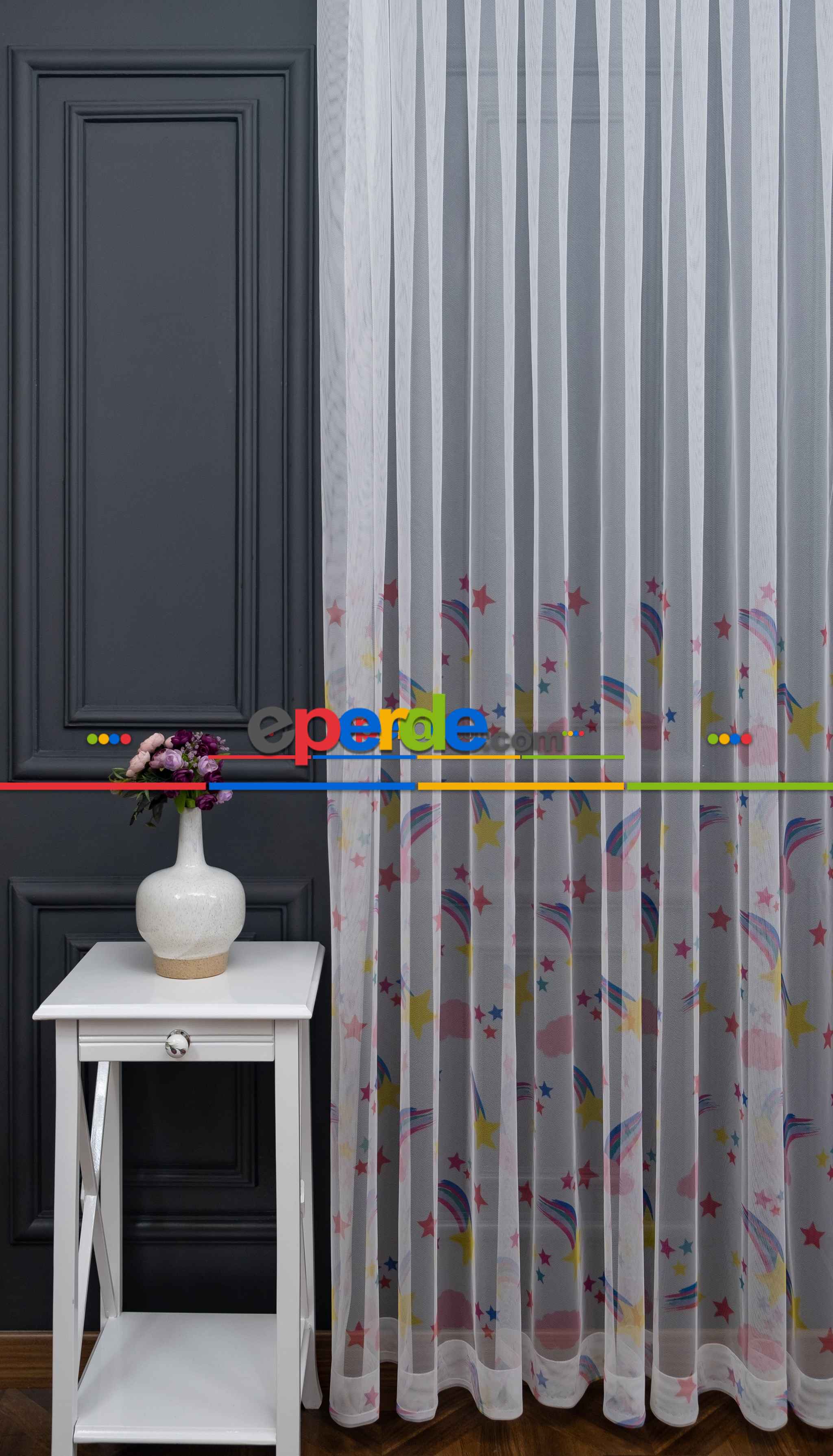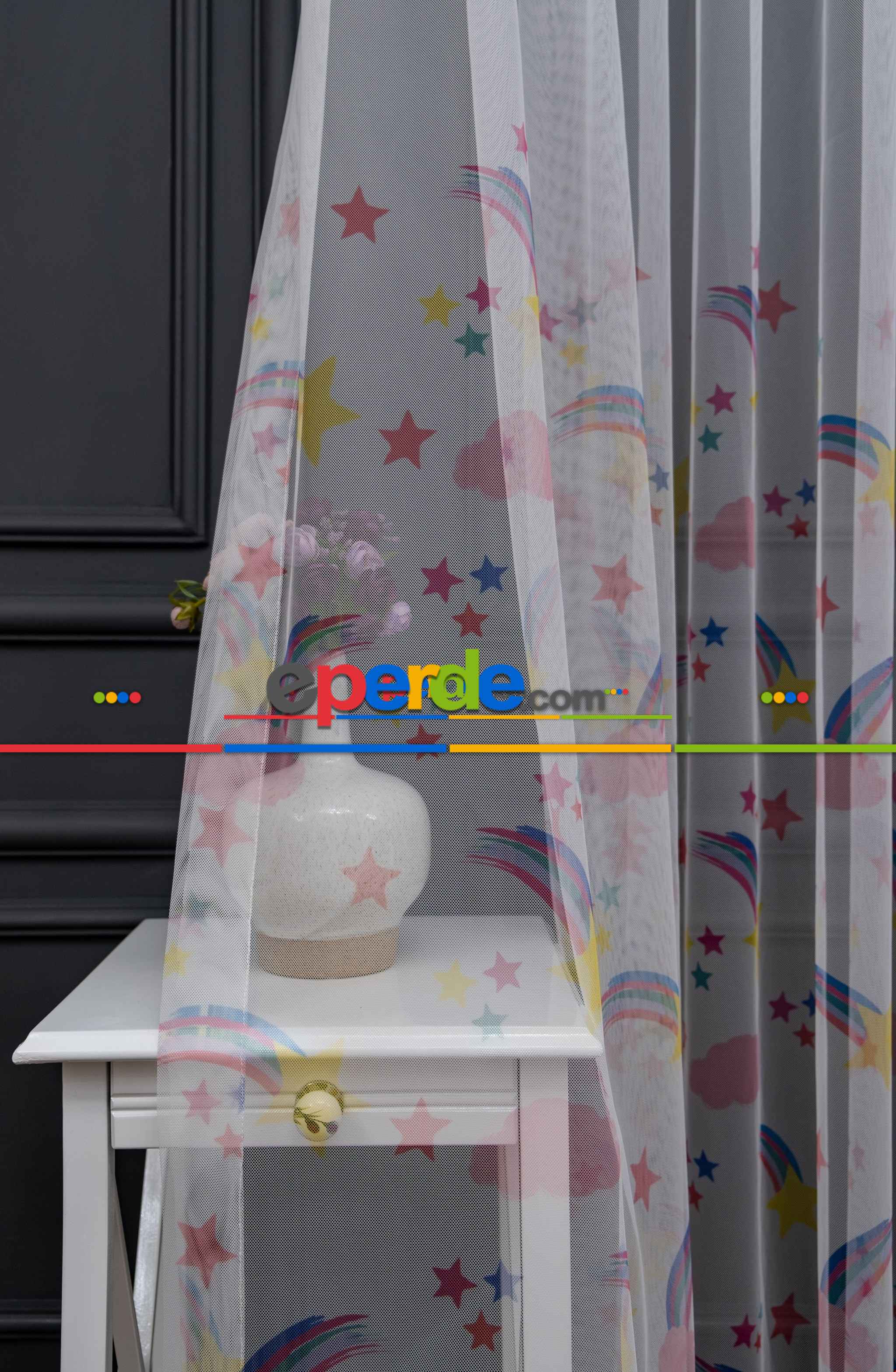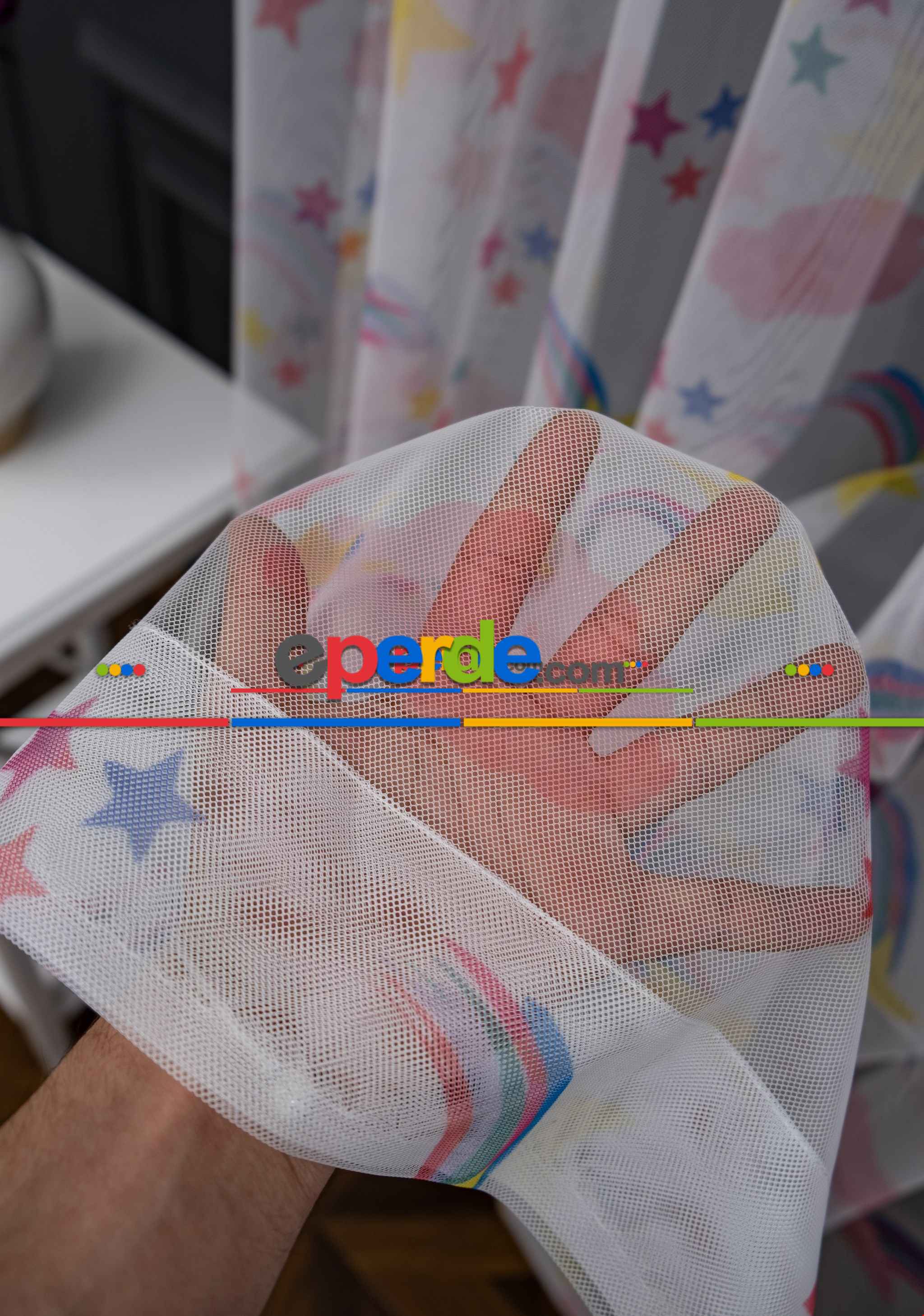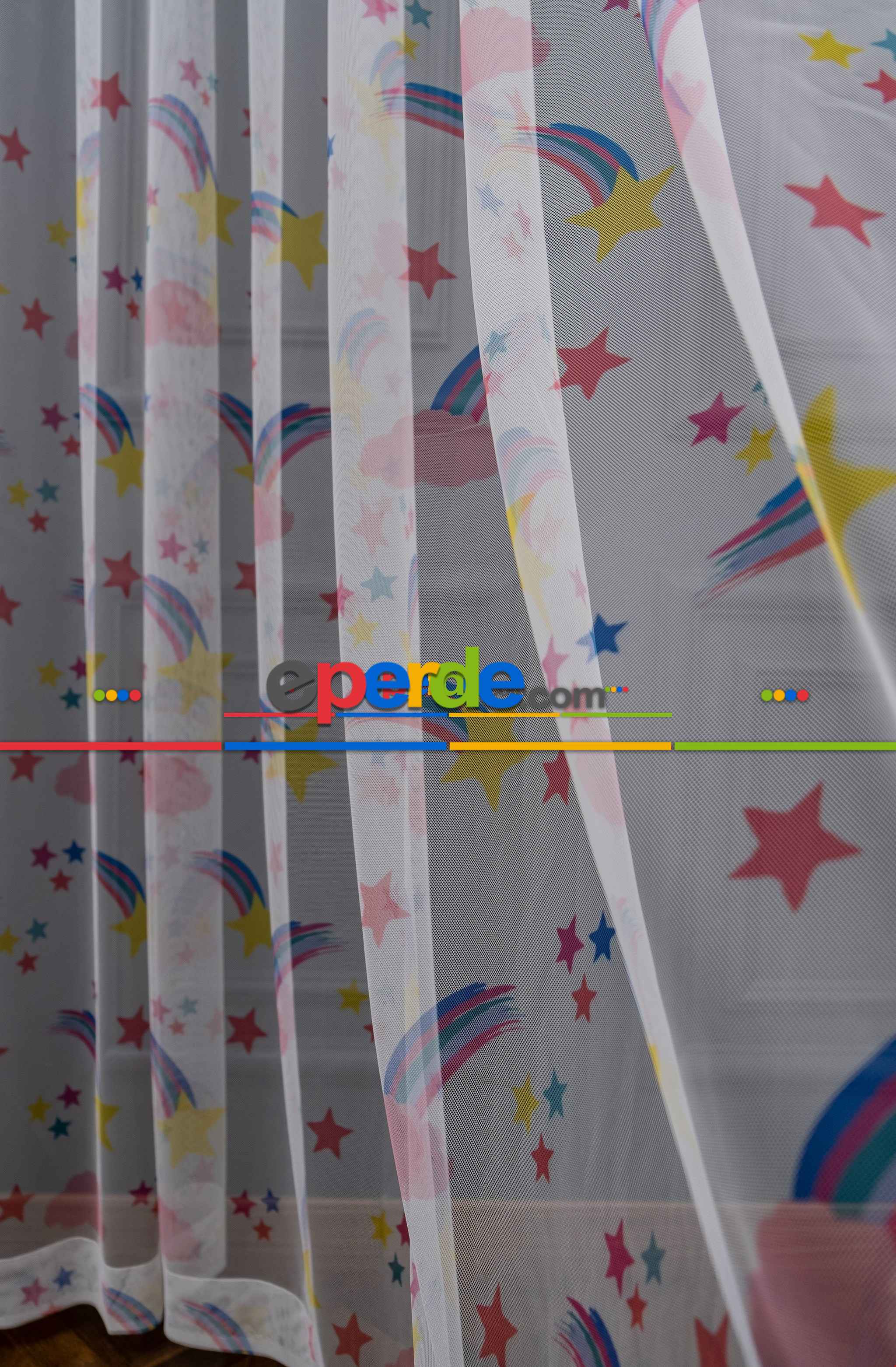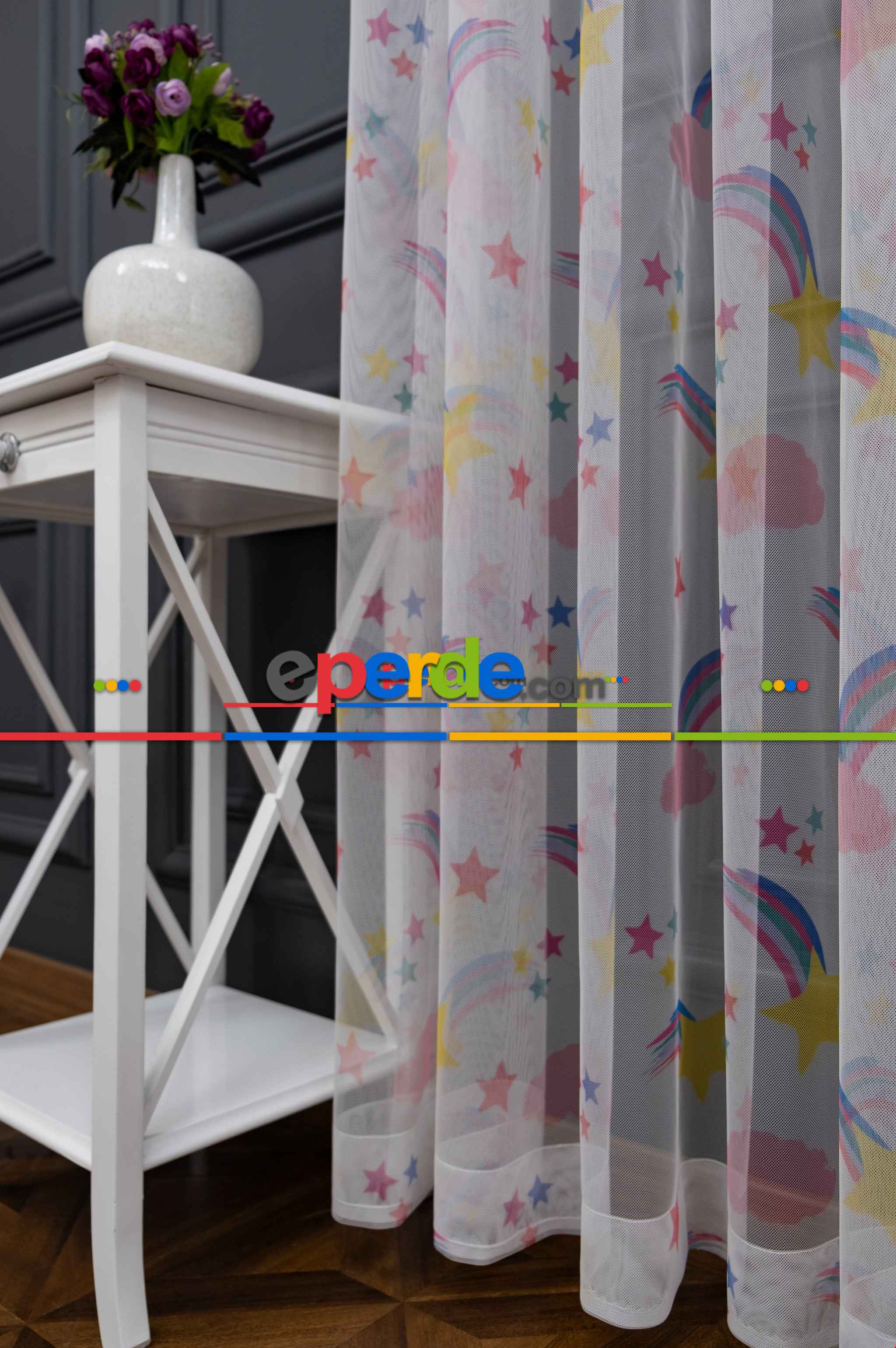 Hazır Ölçülü Petek Zemin Mavi Ve Yeşil Renkli Gökkuşağı Desenli Grek Baskılı Tül Perde Ödeme Seçenekleri