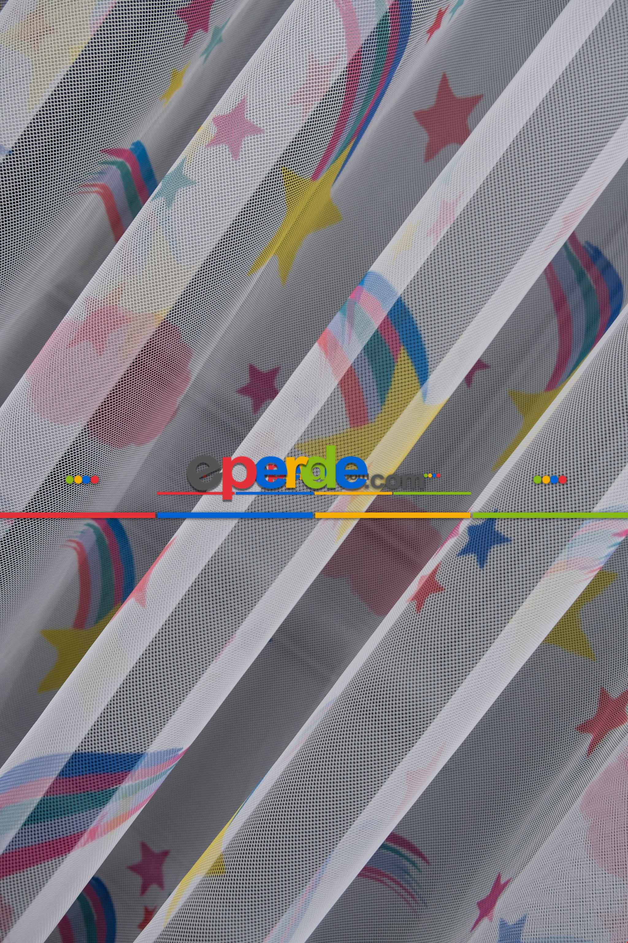 Hazır Ölçülü Petek Zemin Mavi Ve Yeşil Renkli Gökkuşağı Desenli Grek Baskılı Tül Perde » Eperde