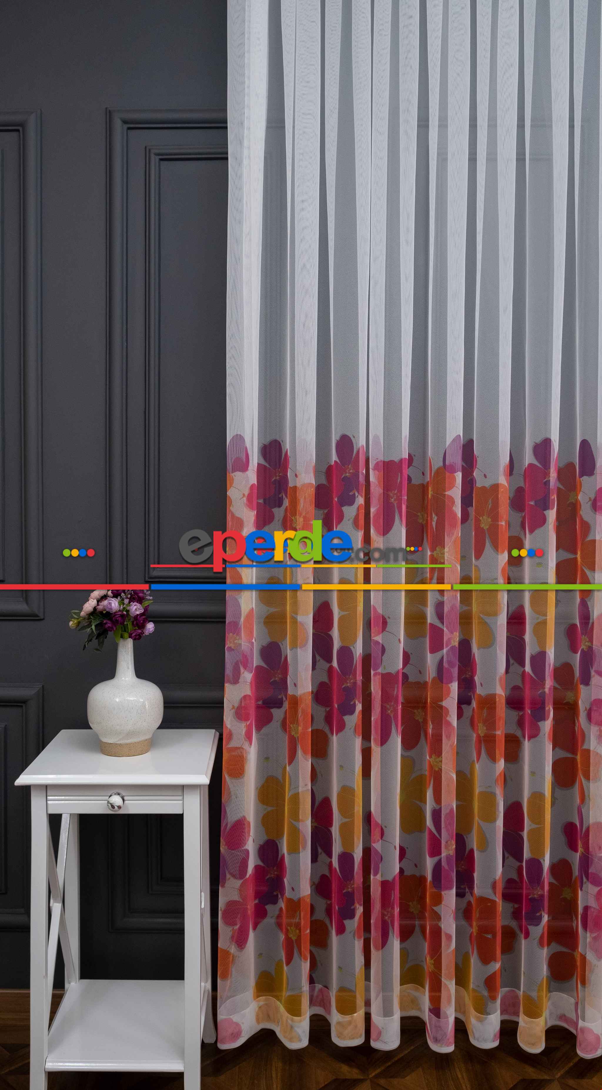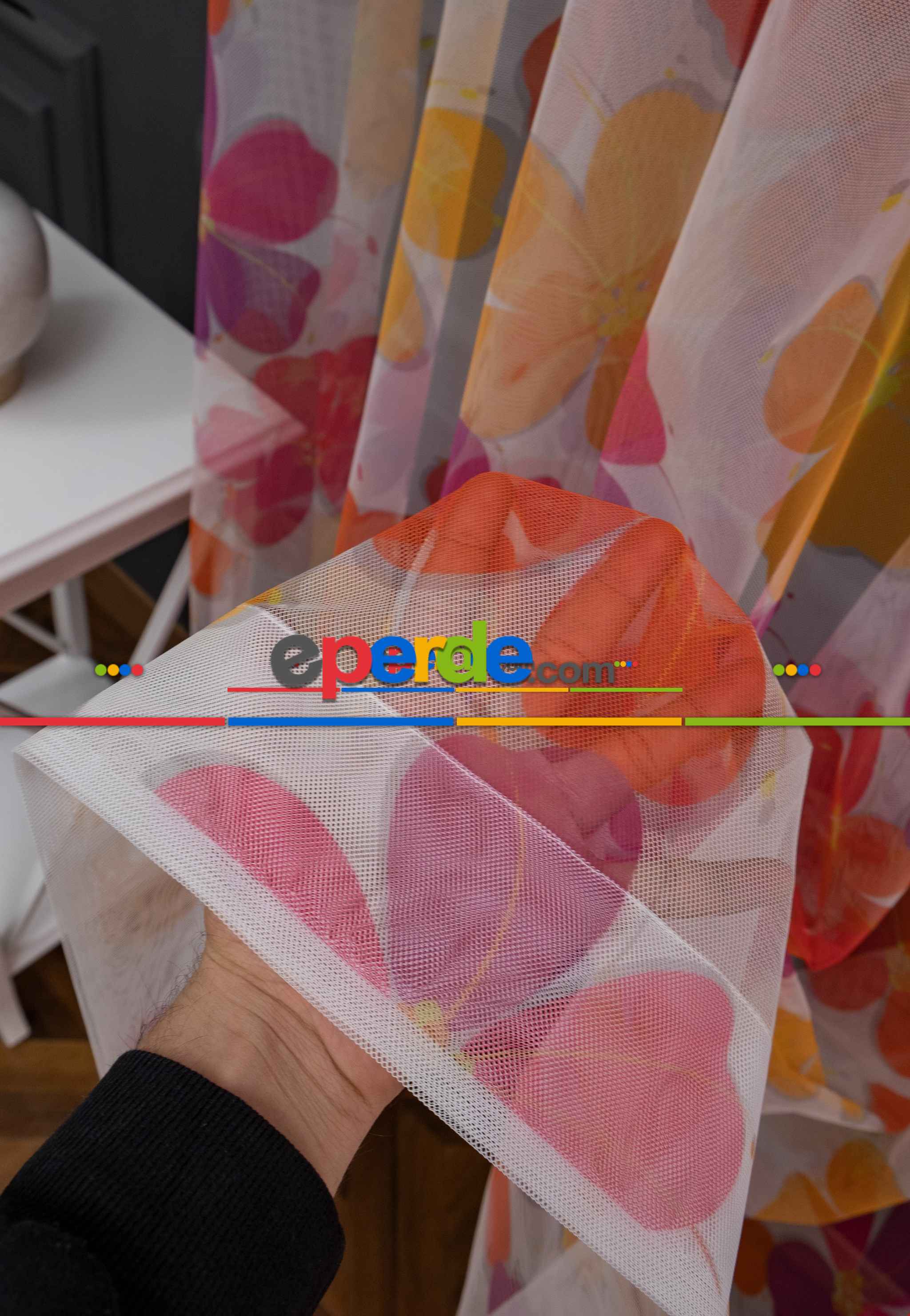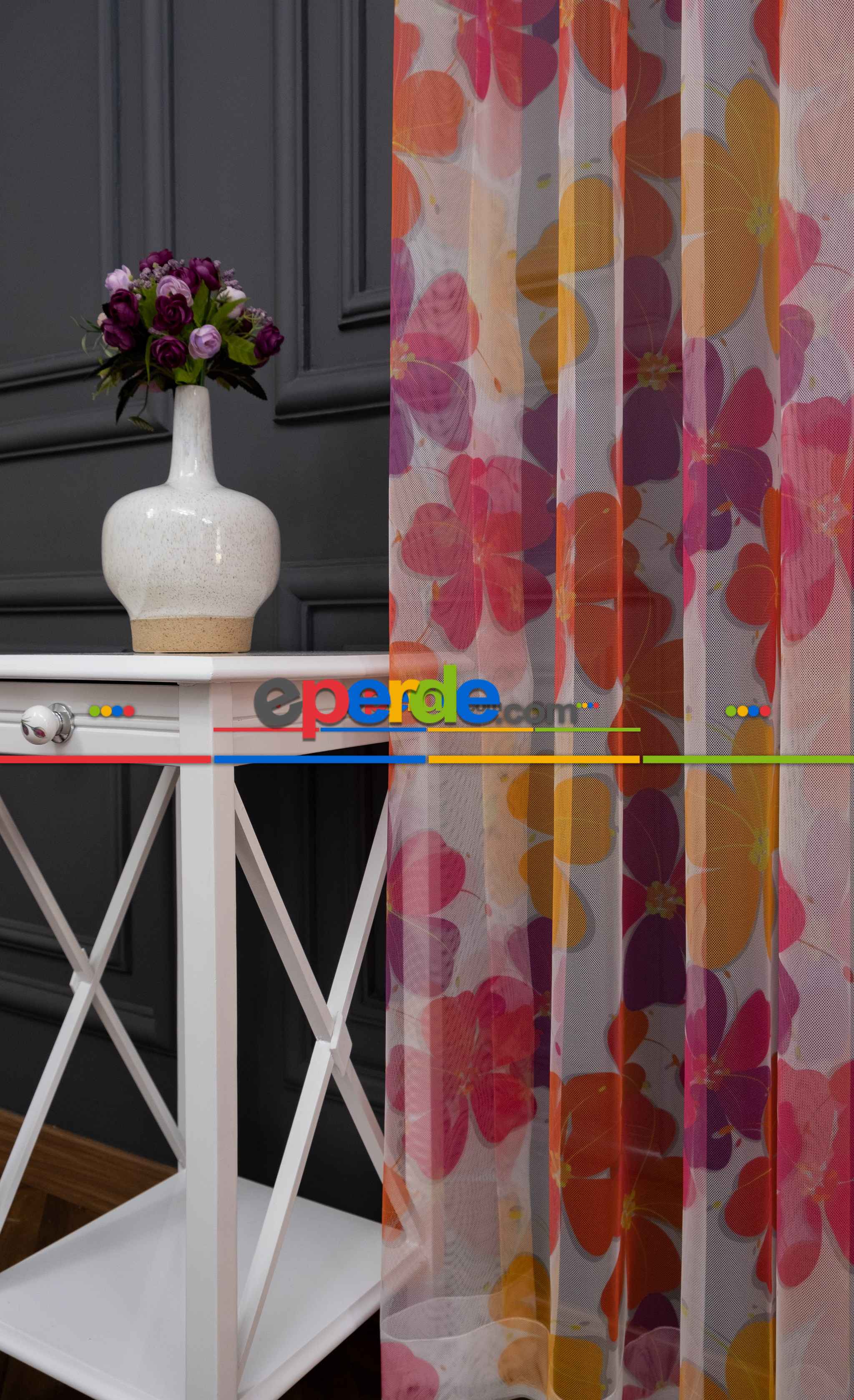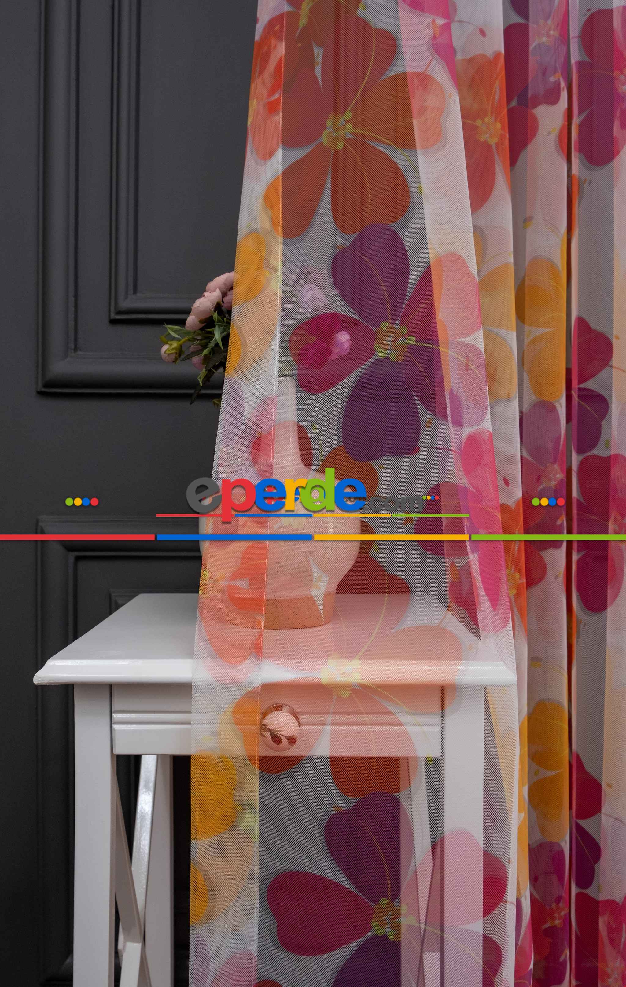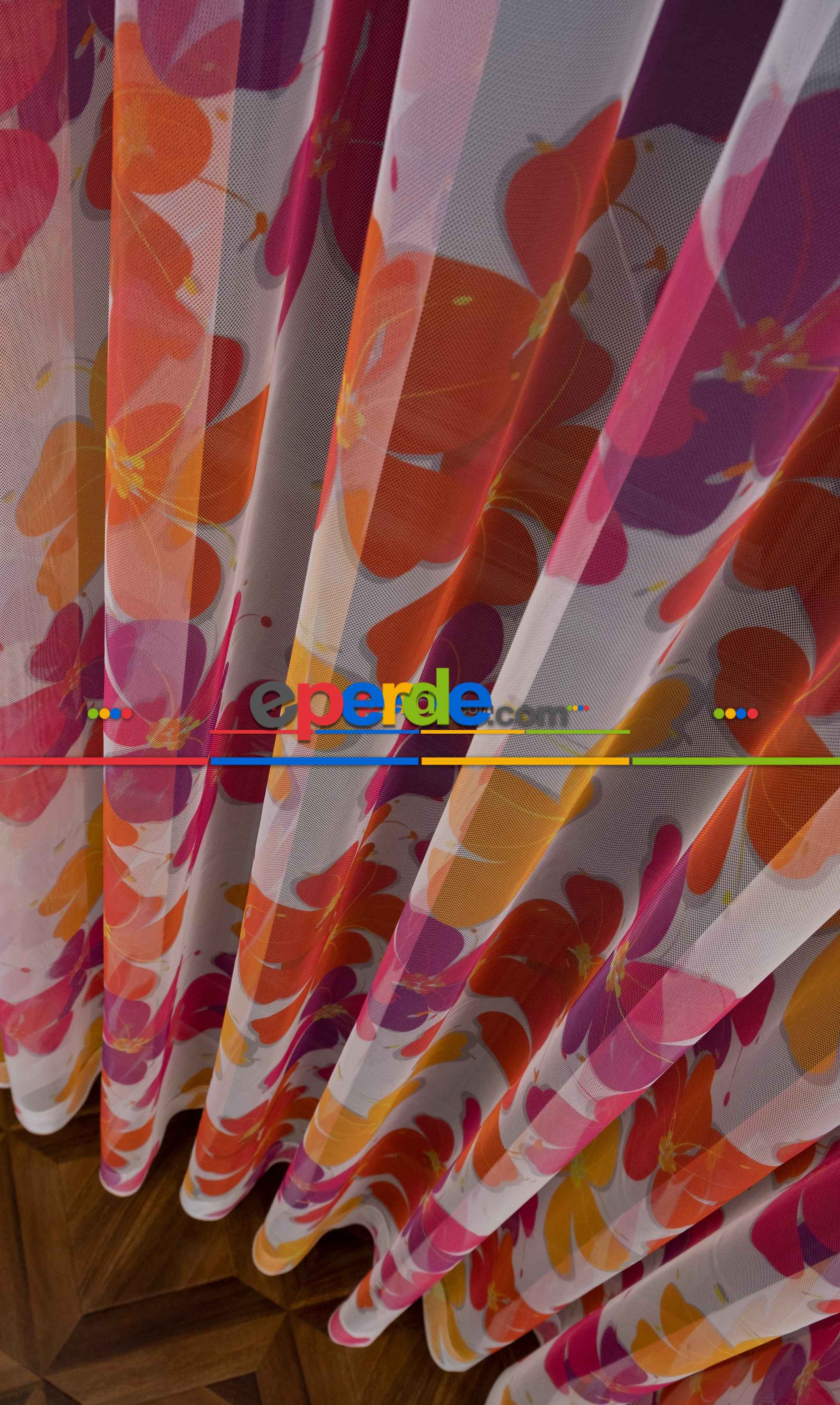 Hazır Ölçülü Petek Zemin Mor Ve Turuncu Renkli Çiçek Desenli Grek Baskılı Tül Perde Ödeme Seçenekleri