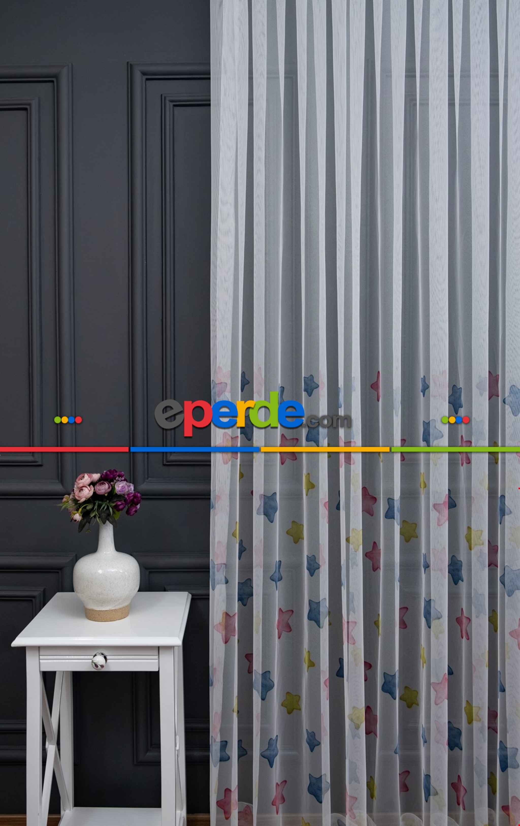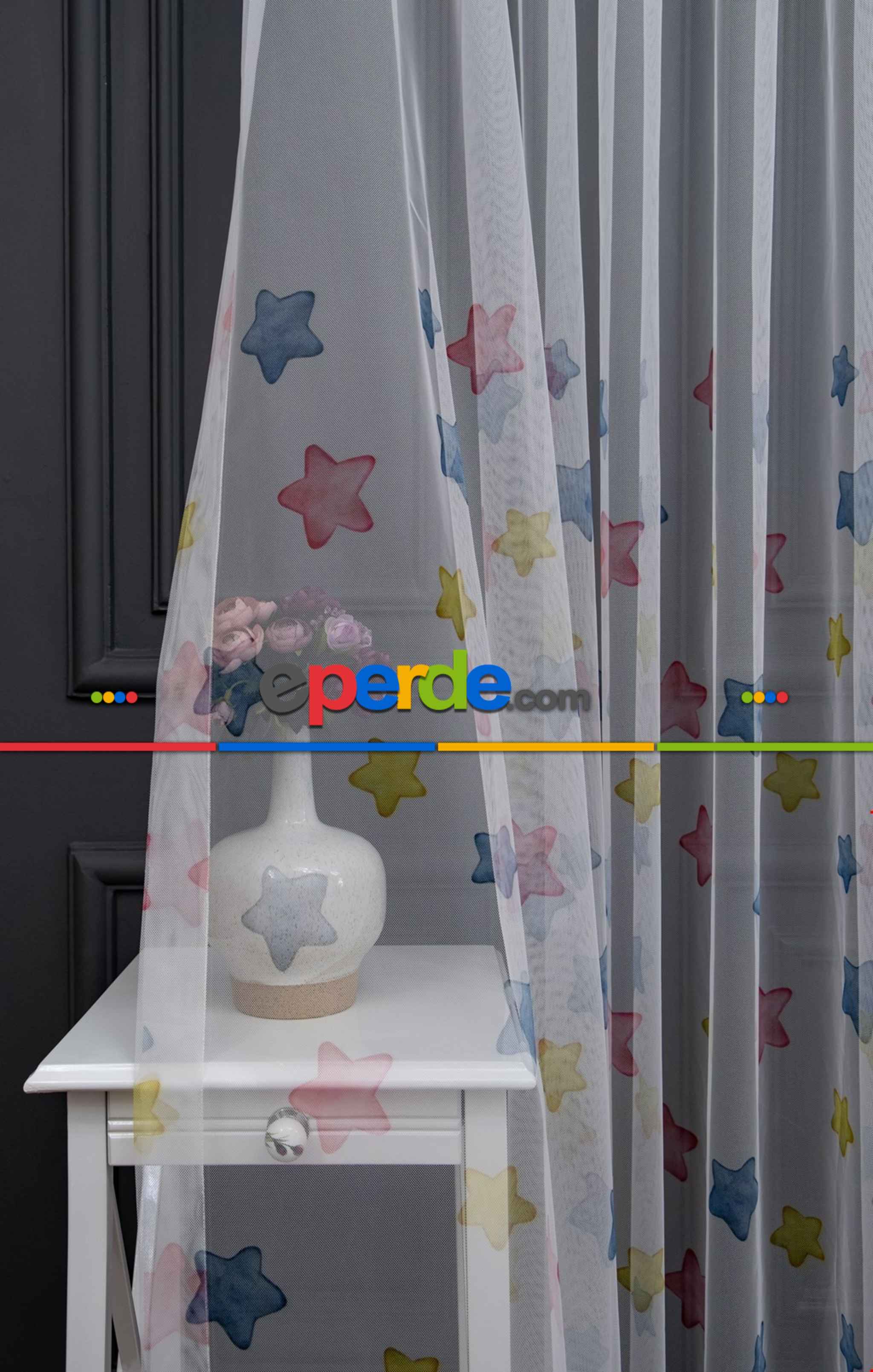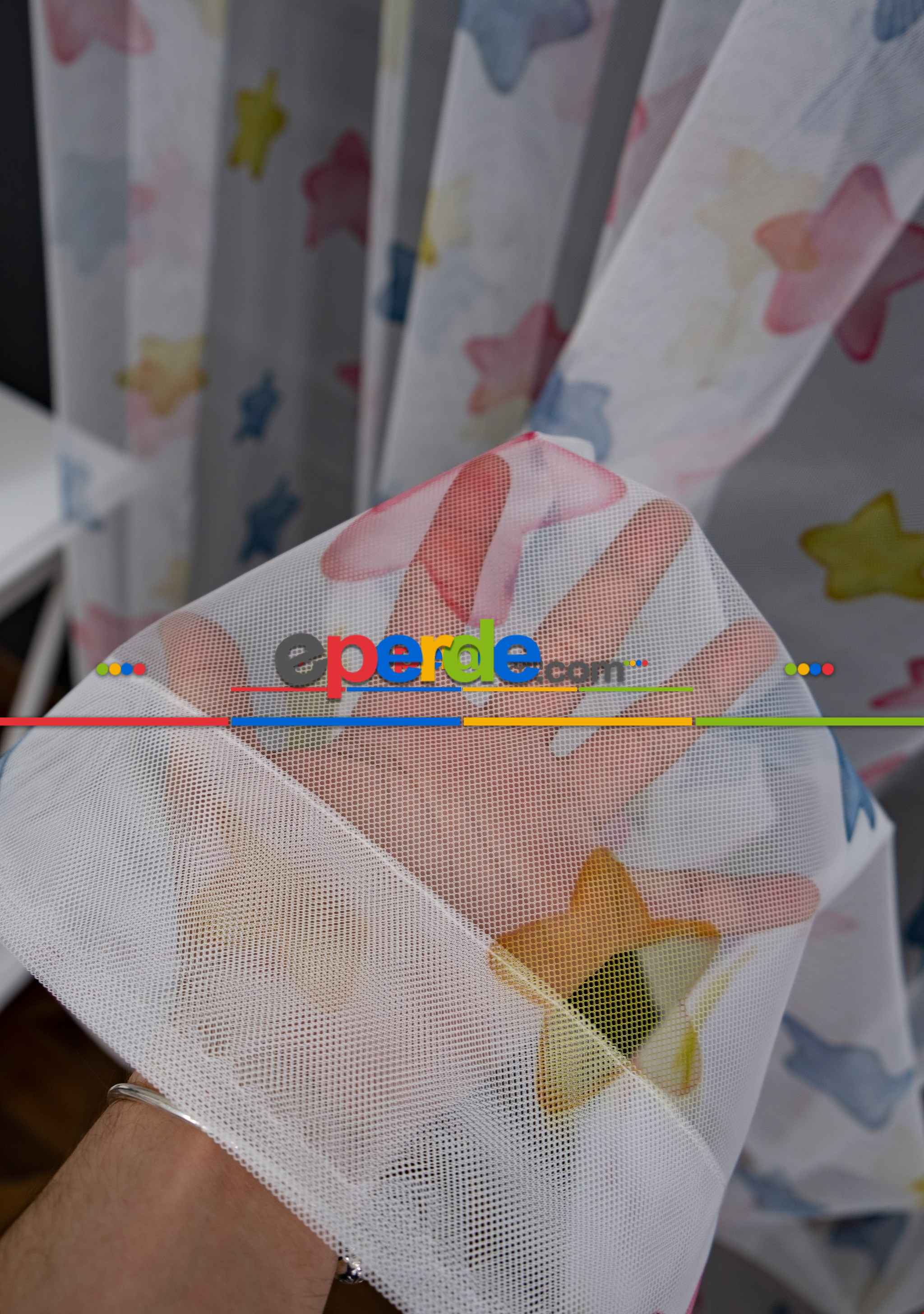 Hazır Ölçülü Petek Zemin Pembe Mavi Ve Sarı Renkli Yıldız Desenli Grek Baskılı Tül Perde » Eperde