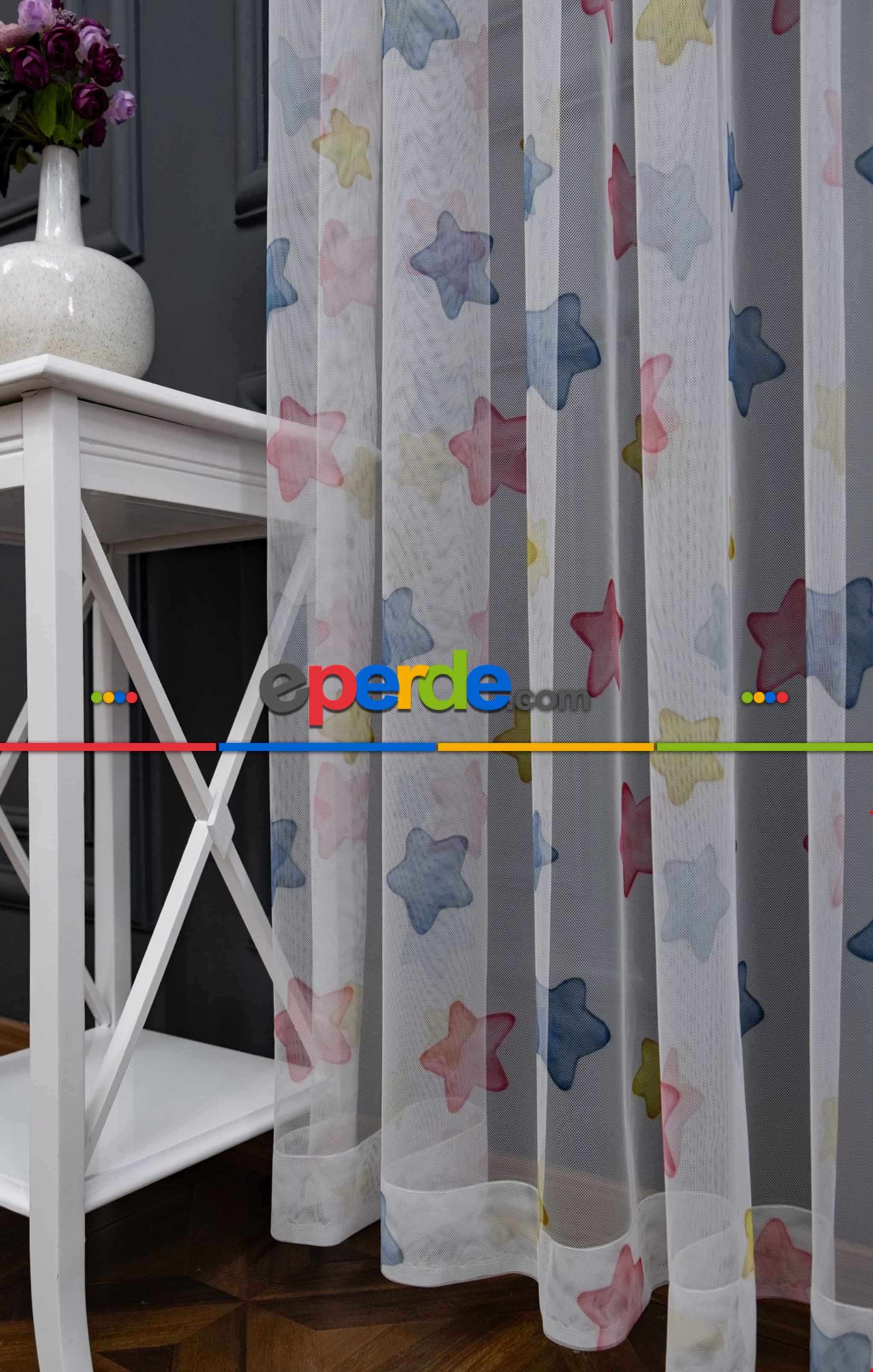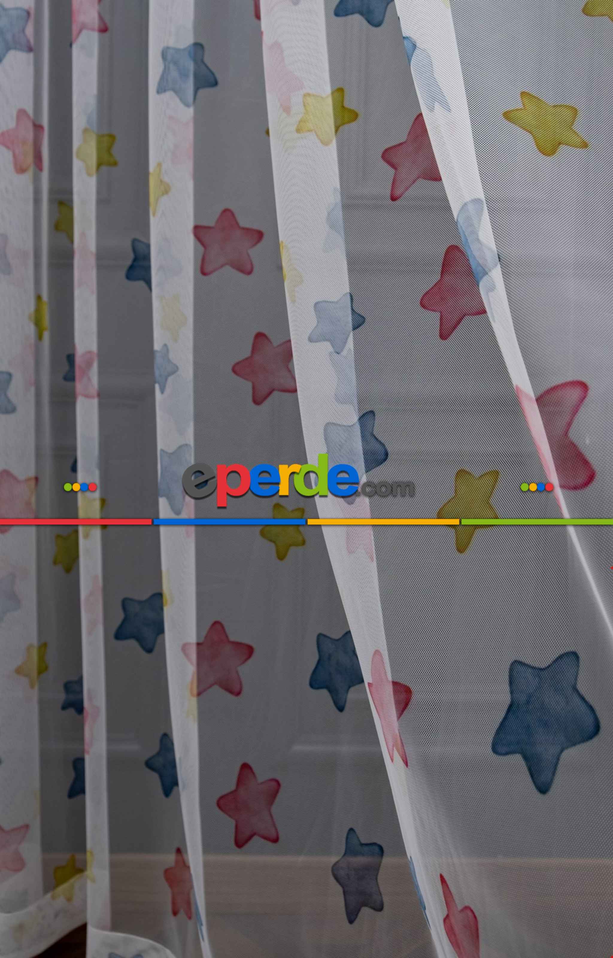Hazır Ölçülü Petek Zemin Pembe Mavi Ve Sarı Renkli Yıldız Desenli Grek Baskılı Tül Perde Ödeme Seçenekleri
