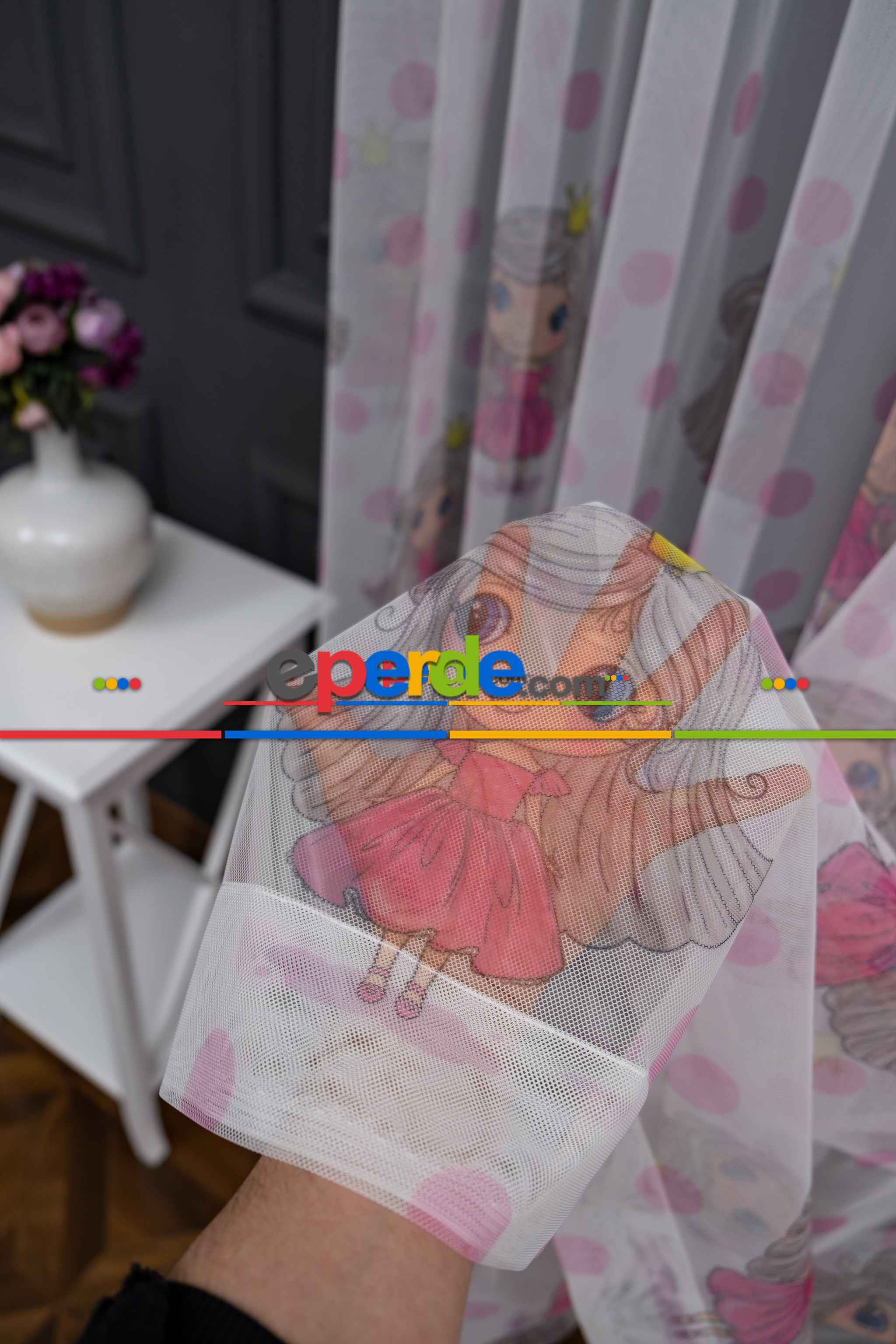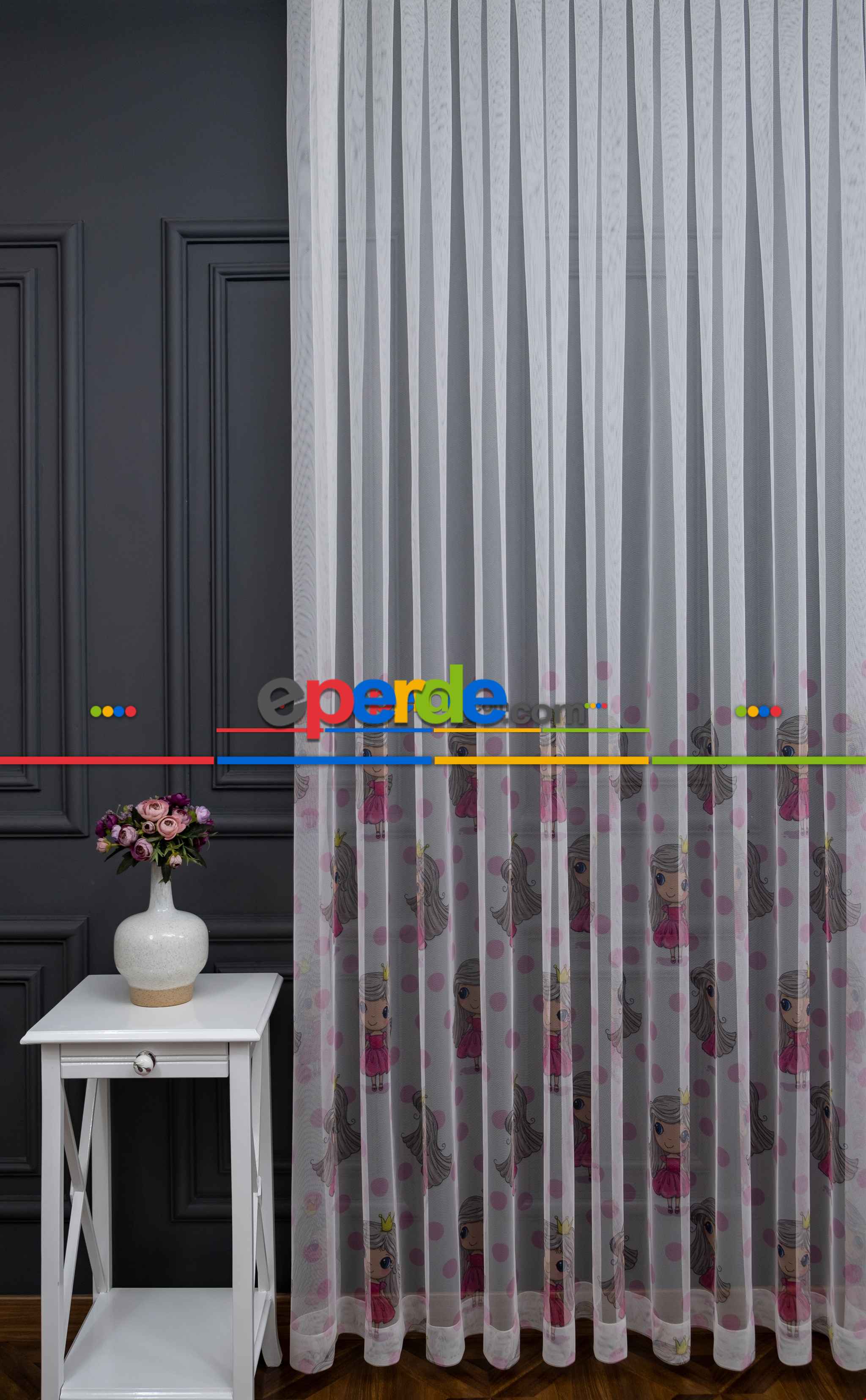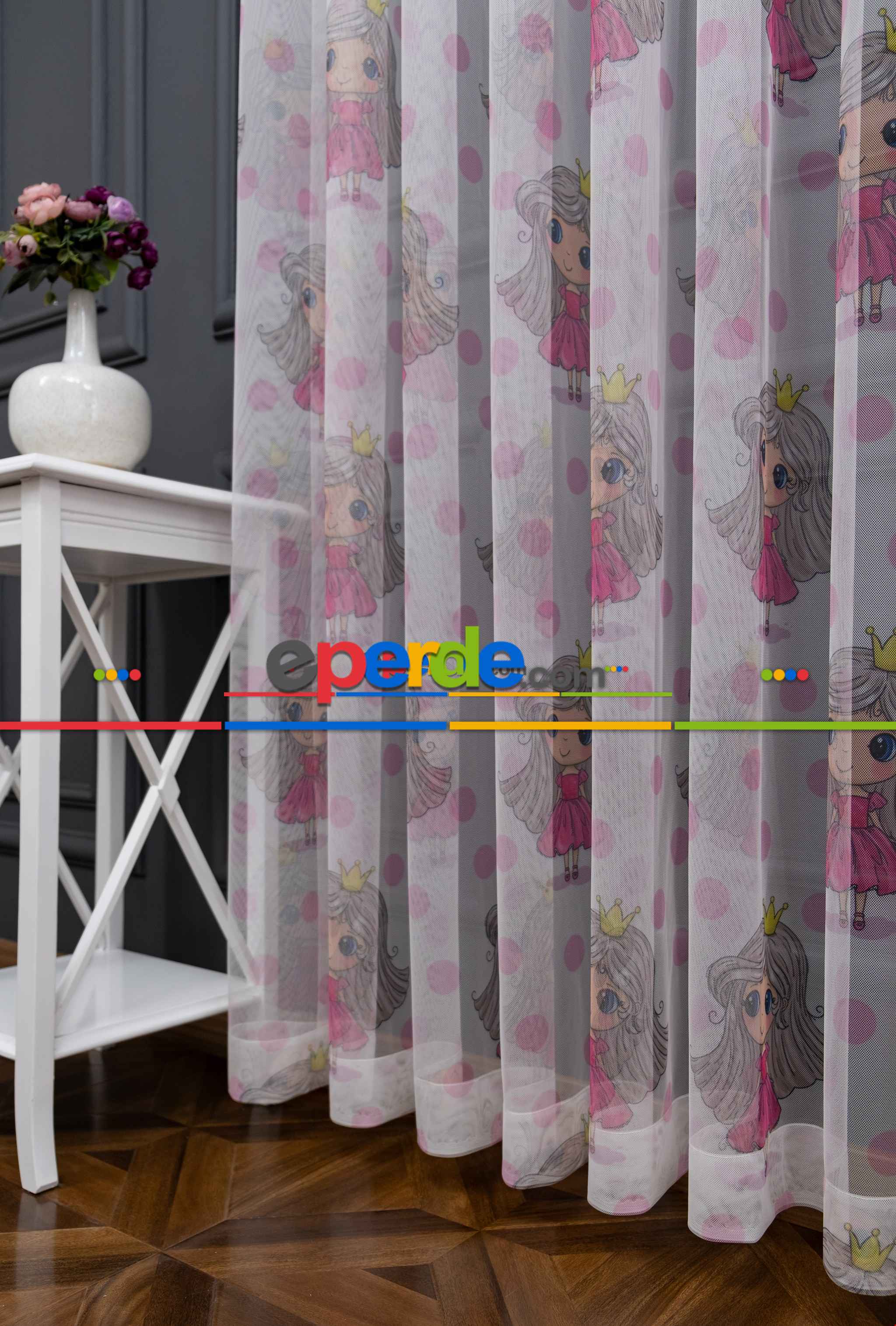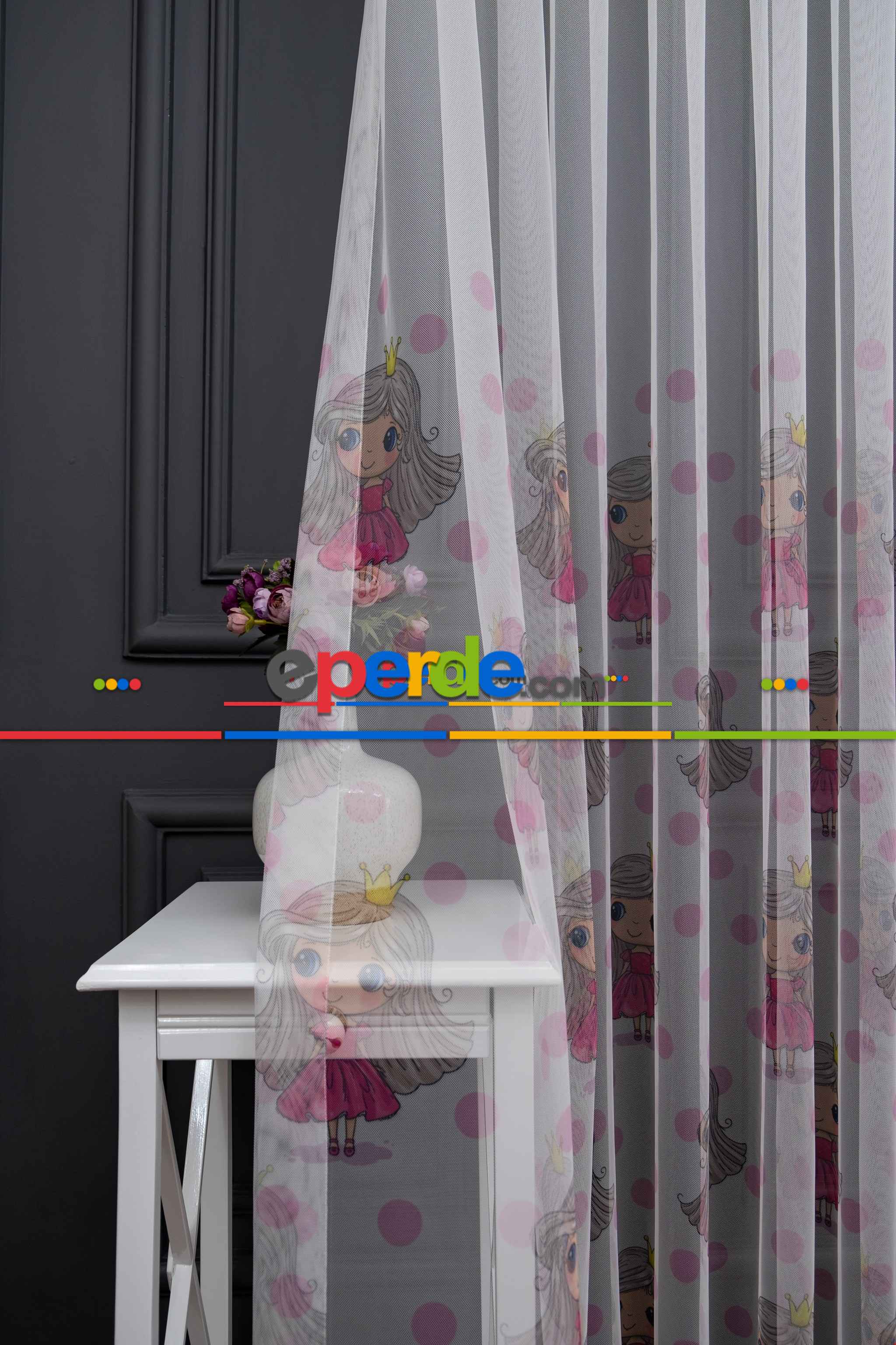 Hazır Ölçülü Petek Zemin Pembe Renkli Prenses Desenli Grek Baskılı Tül Perde