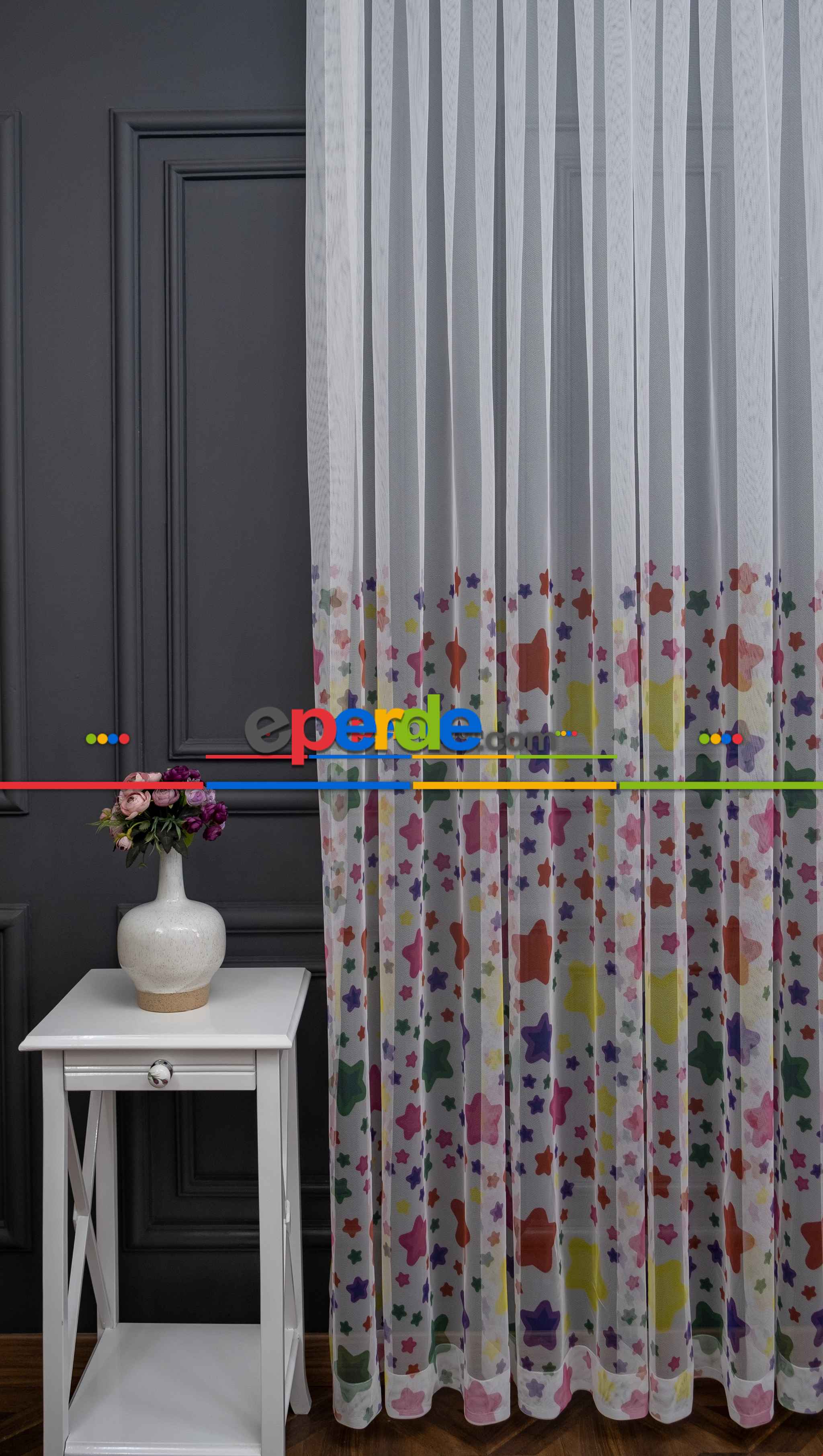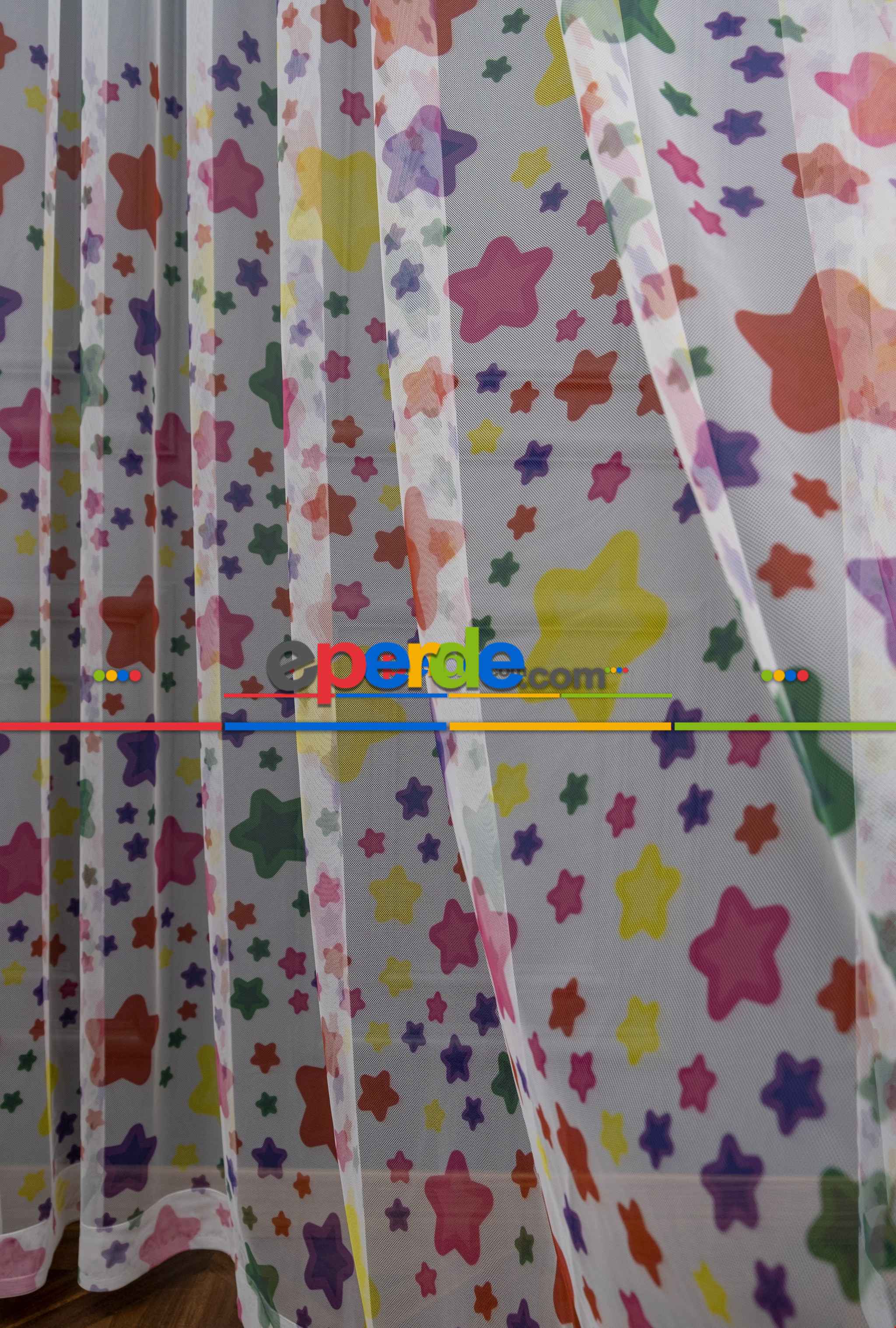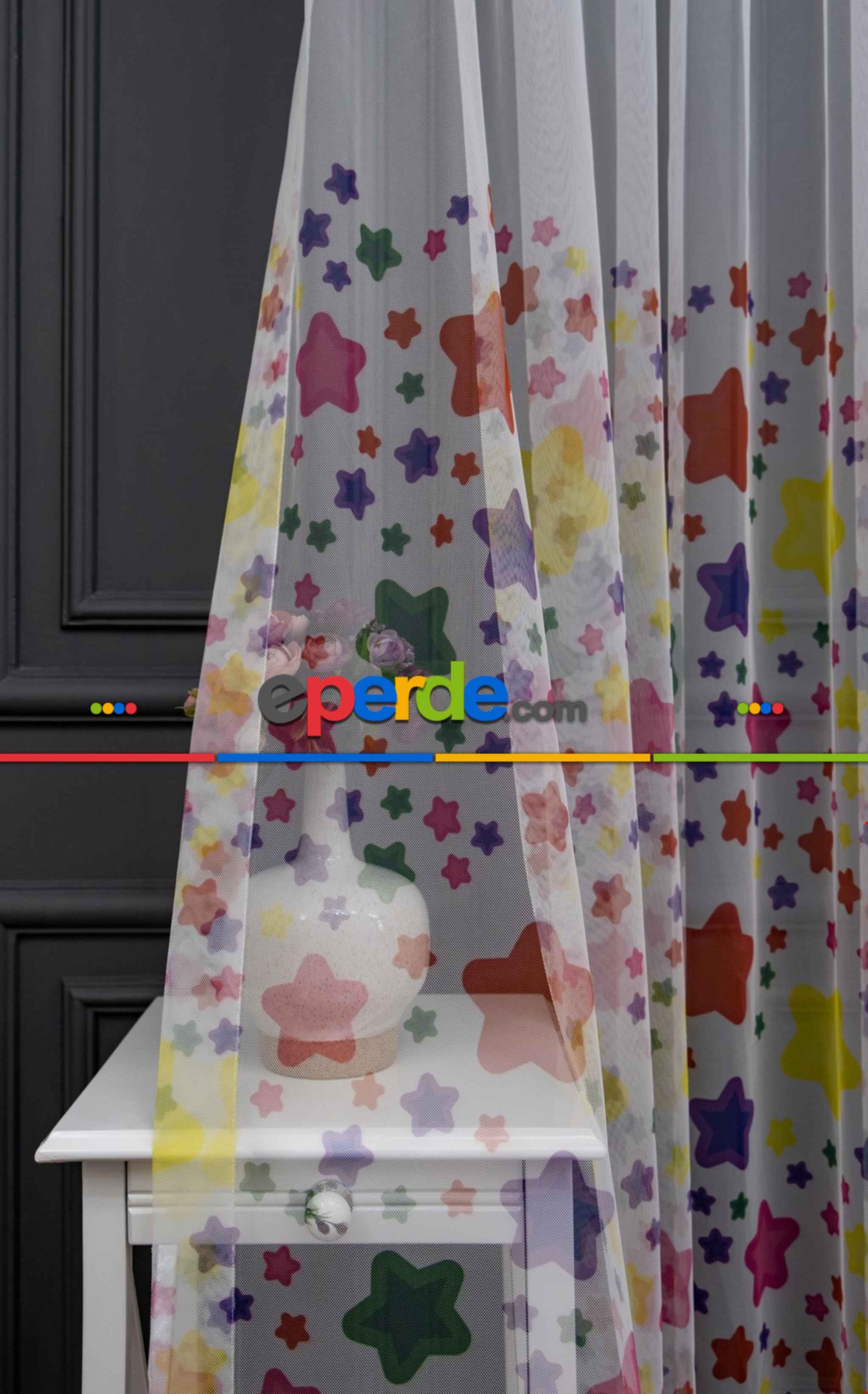 Hazır Ölçülü Petek Zemin Renkli Yıldızlar Desenli Grek Baskılı Tül Perde Ödeme Seçenekleri