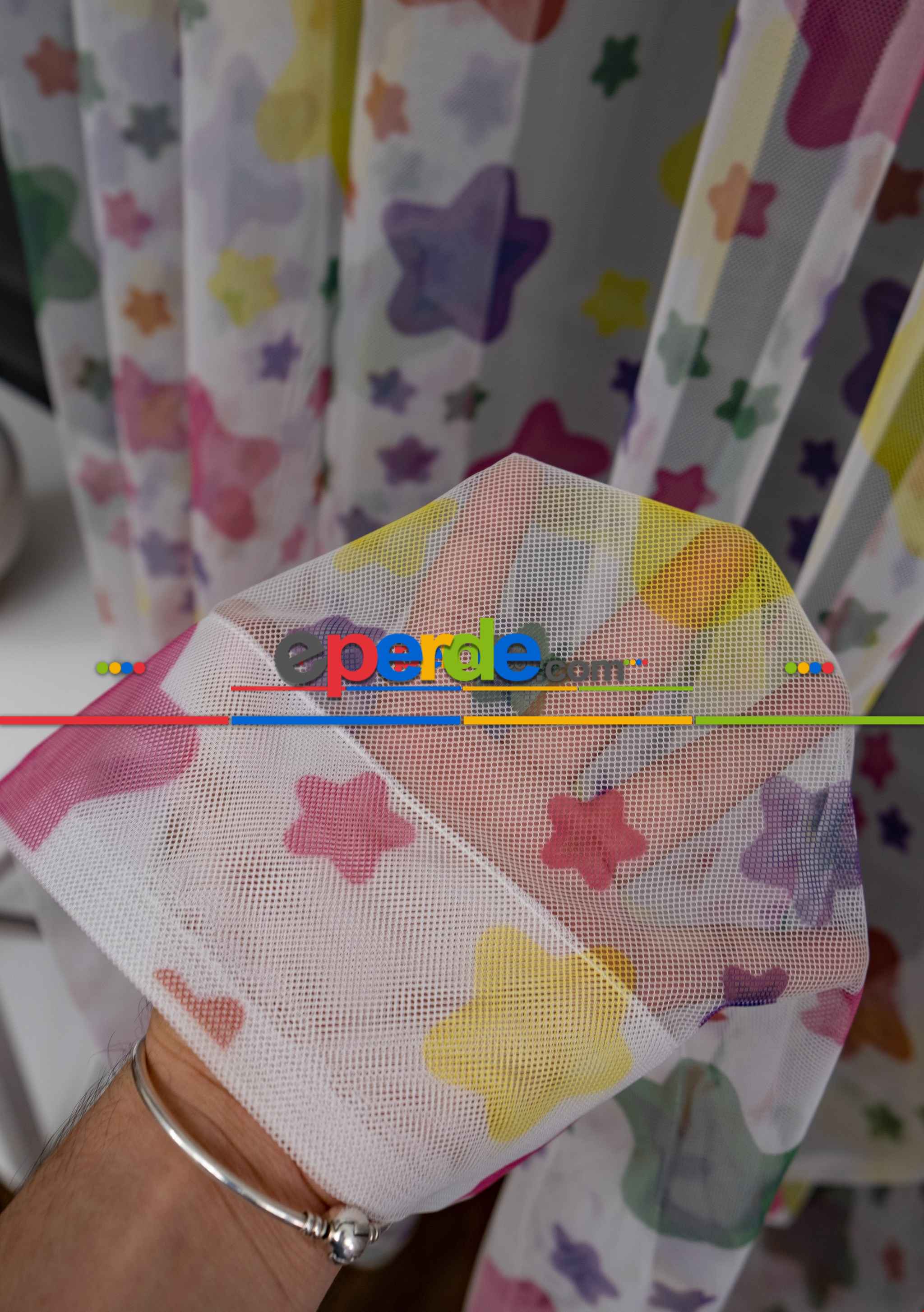 Hazır Ölçülü Petek Zemin Renkli Yıldızlar Desenli Grek Baskılı Tül Perde