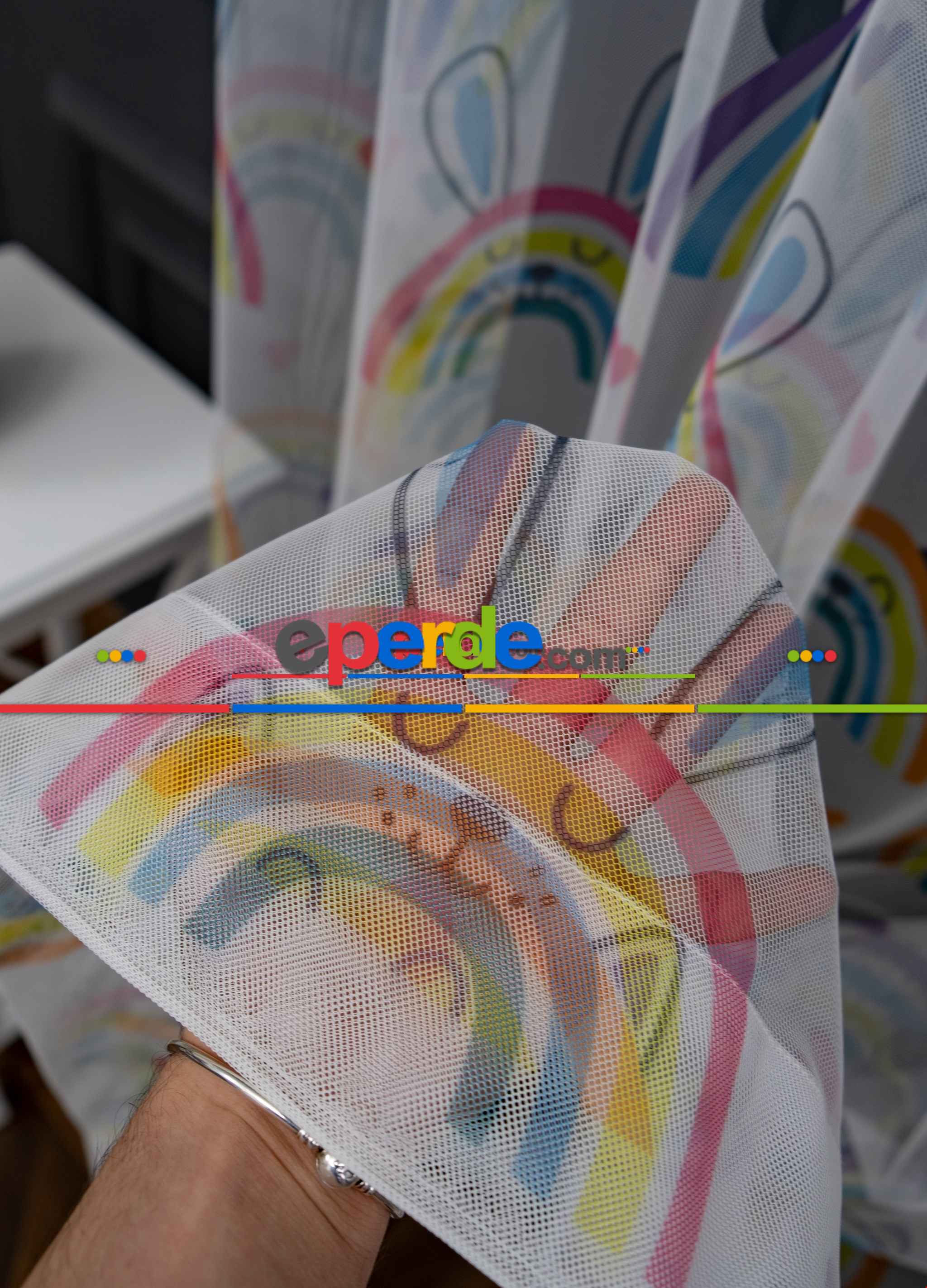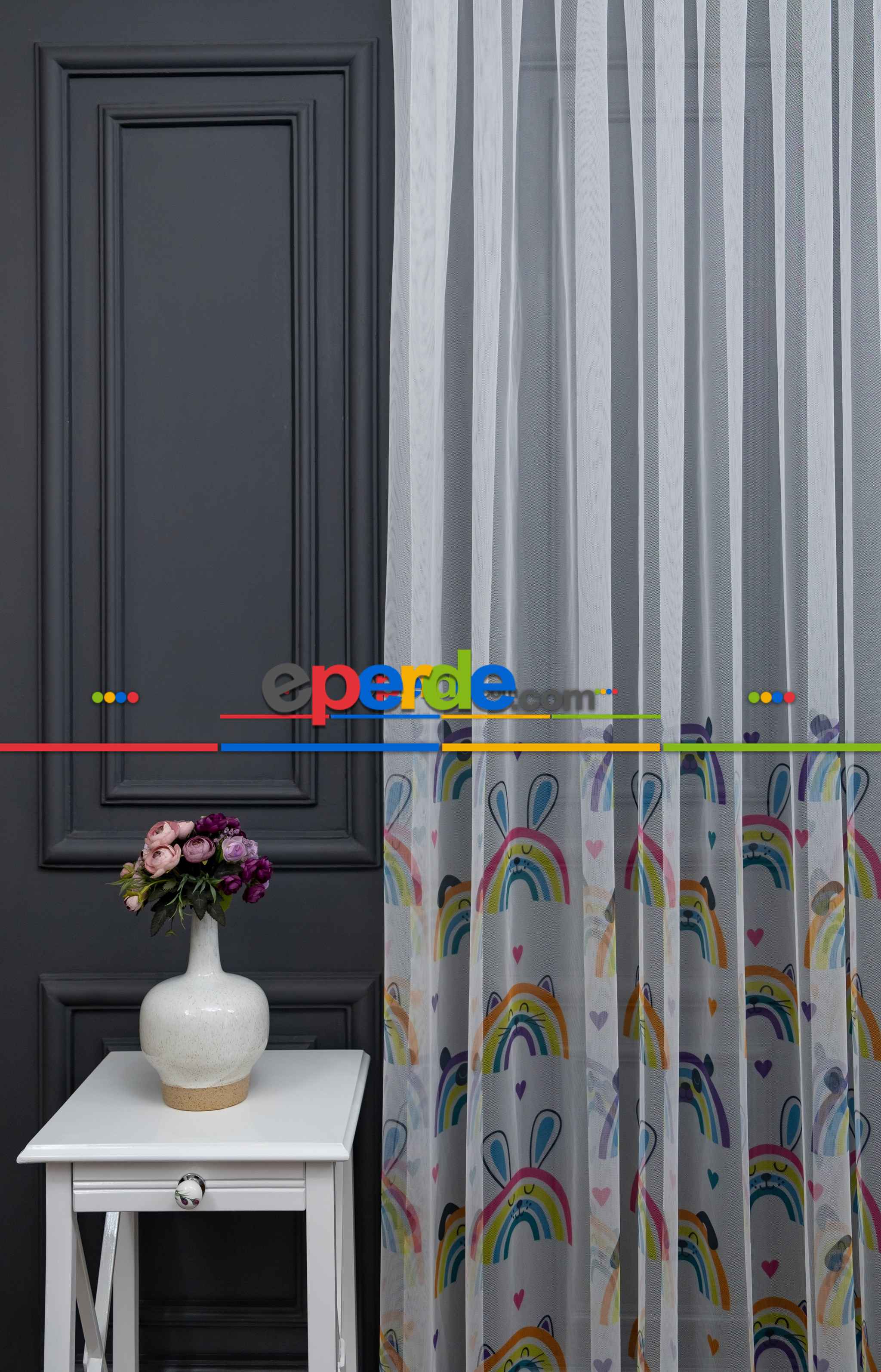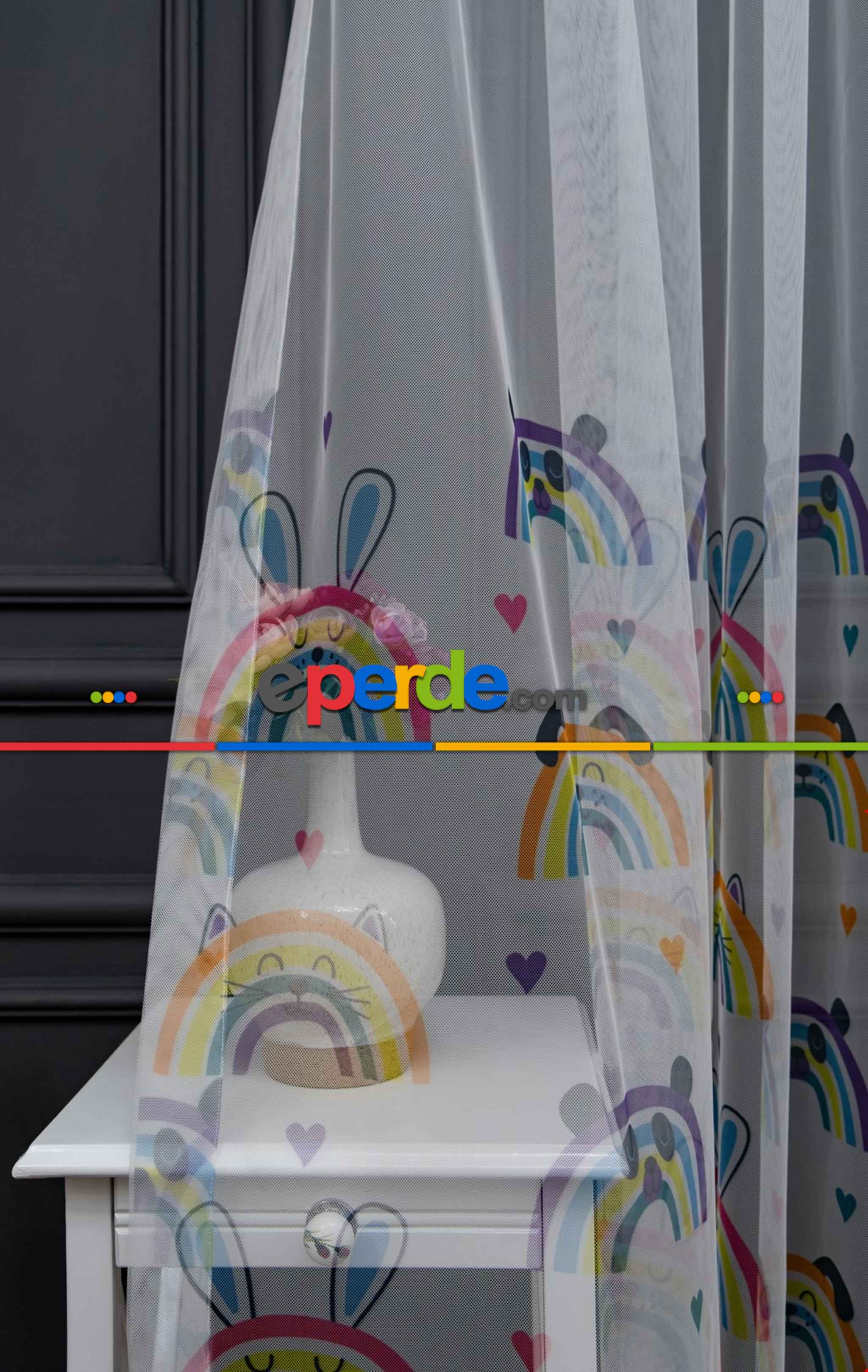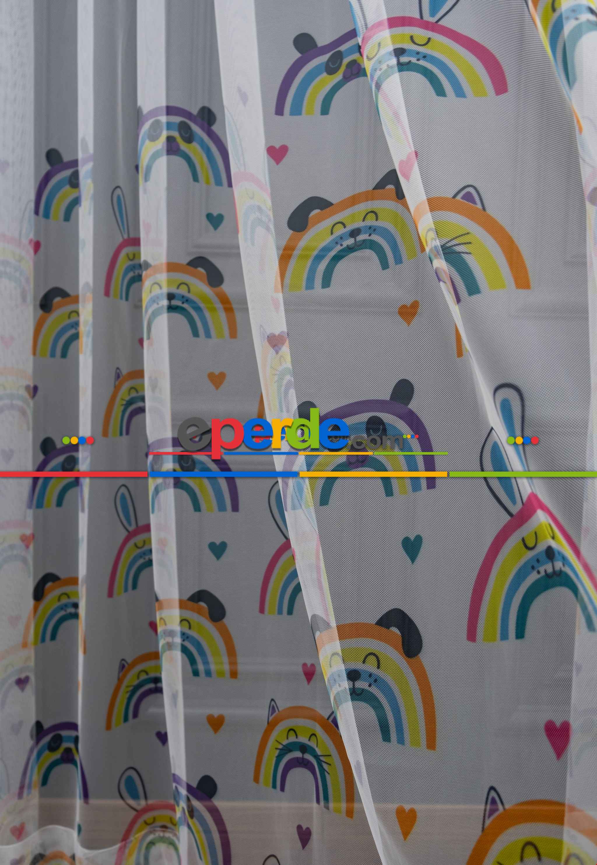 Hazır Ölçülü Petek Zemin Sarı - Pembe Renkli Gökkuşağı Ve Sevimli Hayvanlar Desenli Grek Baskılı Tül Perde Ödeme Seçenekleri
