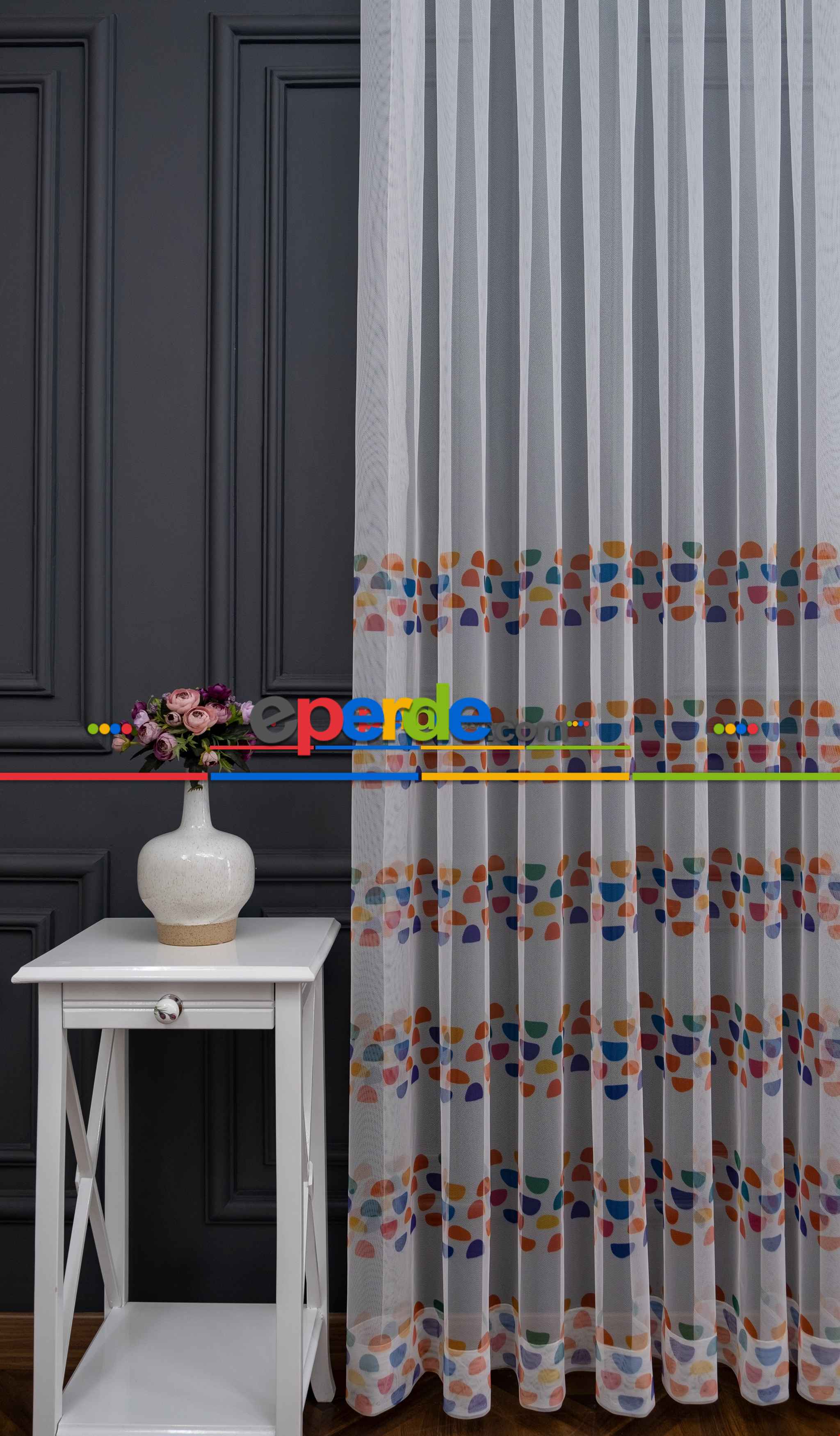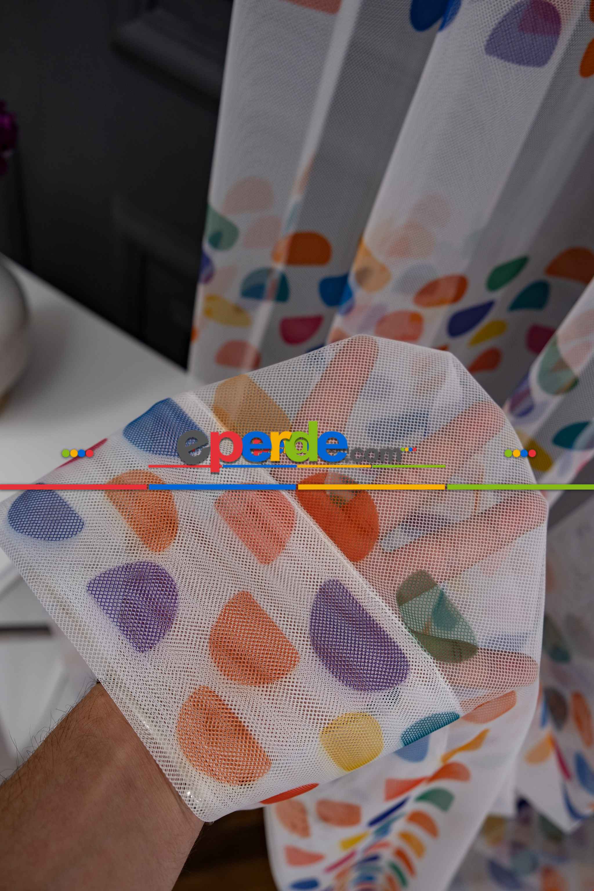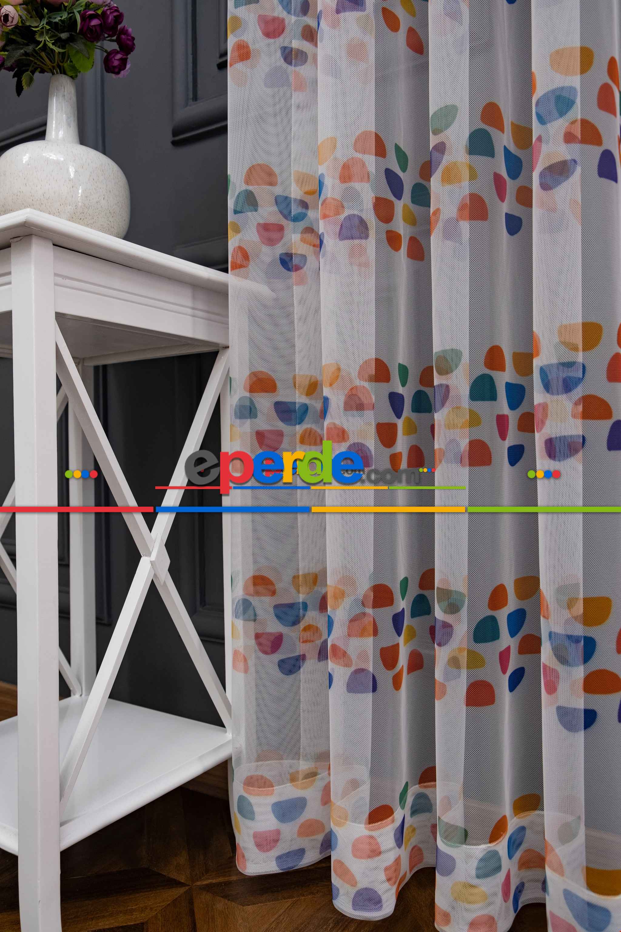 Petek Zemin Mavi Pembe Renkli Gökkuşağı Desenli Grek Baskılı Tül Perde Petek Zemin Mavi Pembe Renkli Gökkuşağı Desenli Grek Baskılı Tül Perde