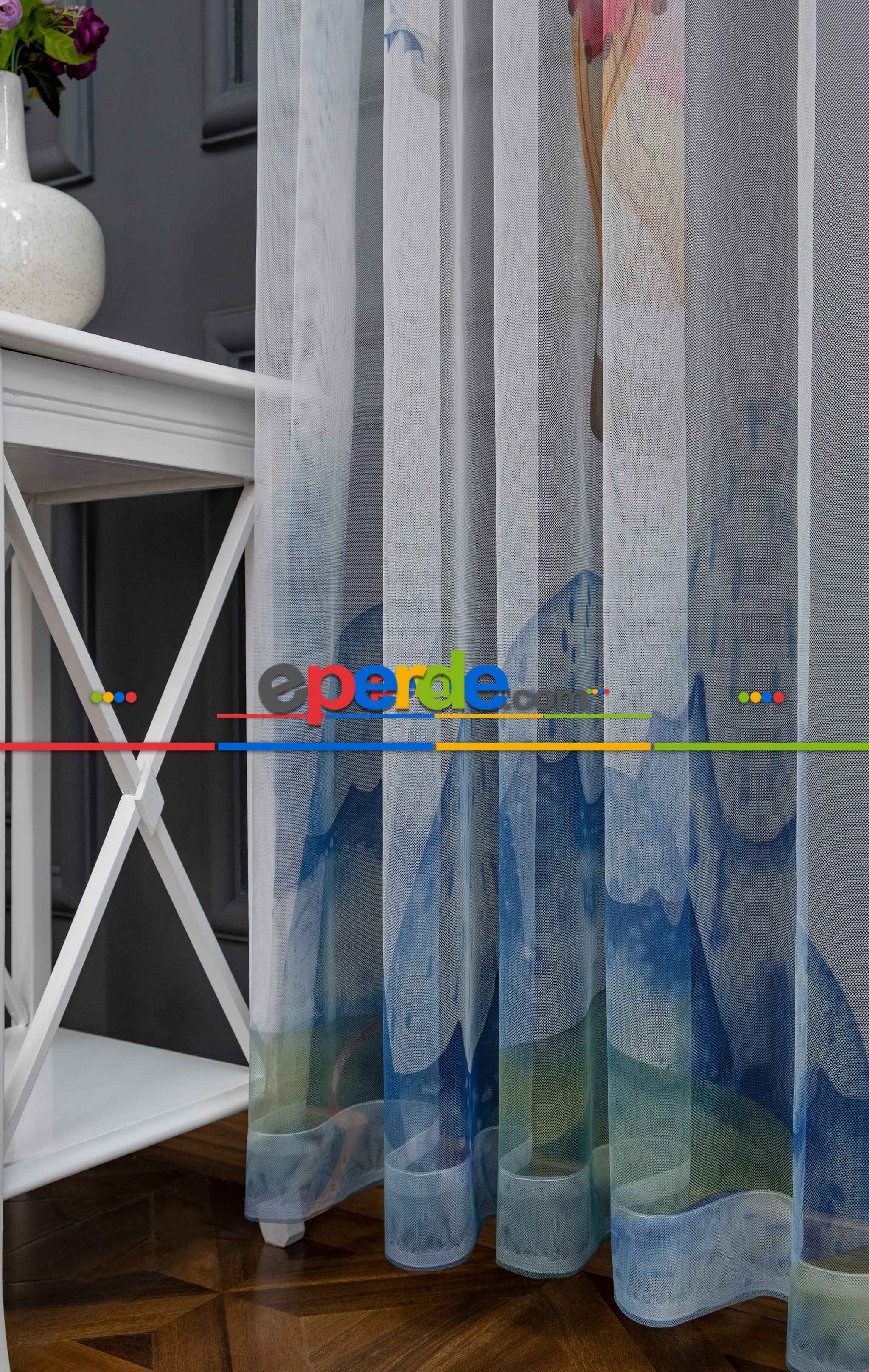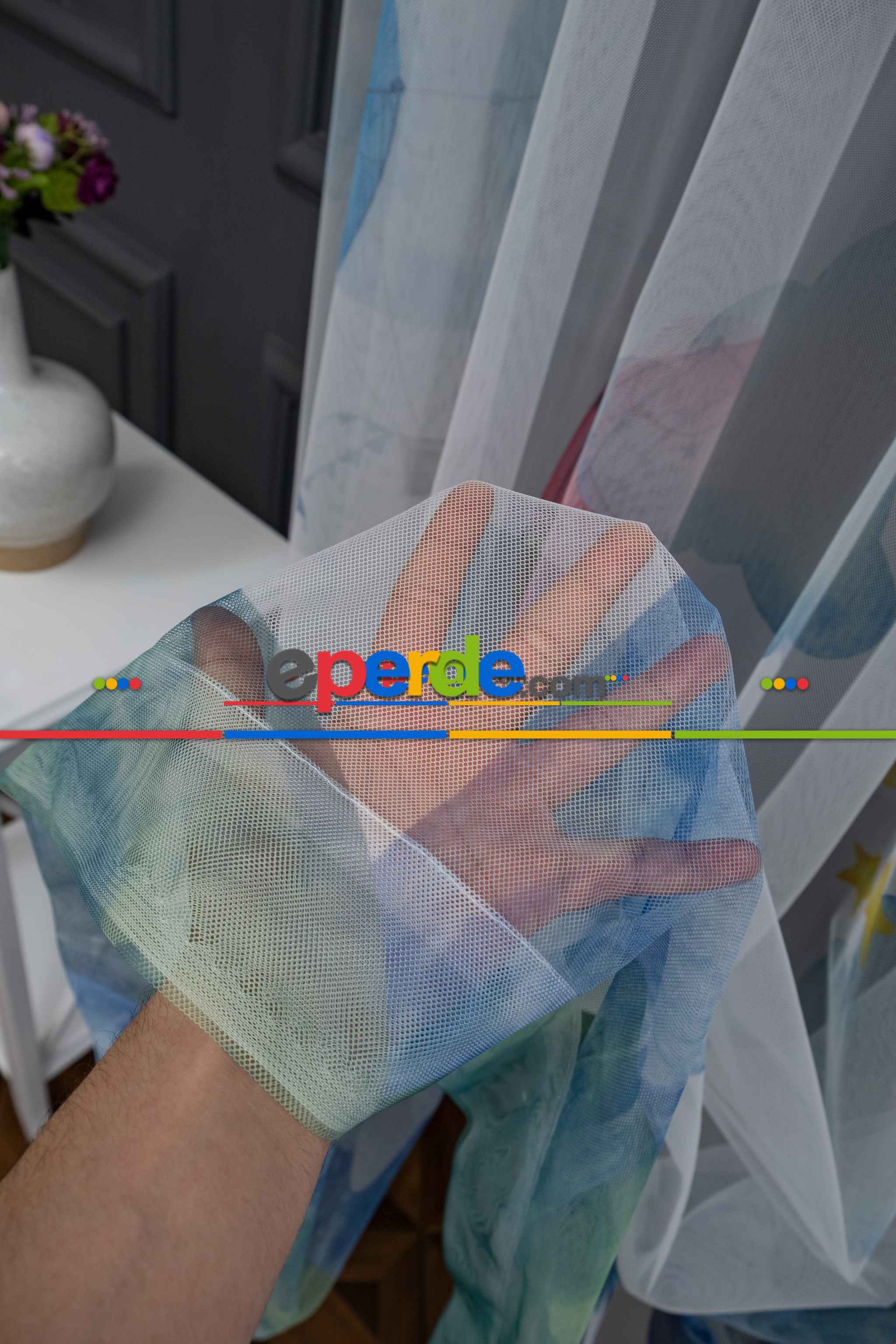 Hazır Ölçülü Petek Zemin Turuncu Ve Mavi Renkli Balon Ve Manzara Desenli Grek Baskılı Tül Perde » Eperde