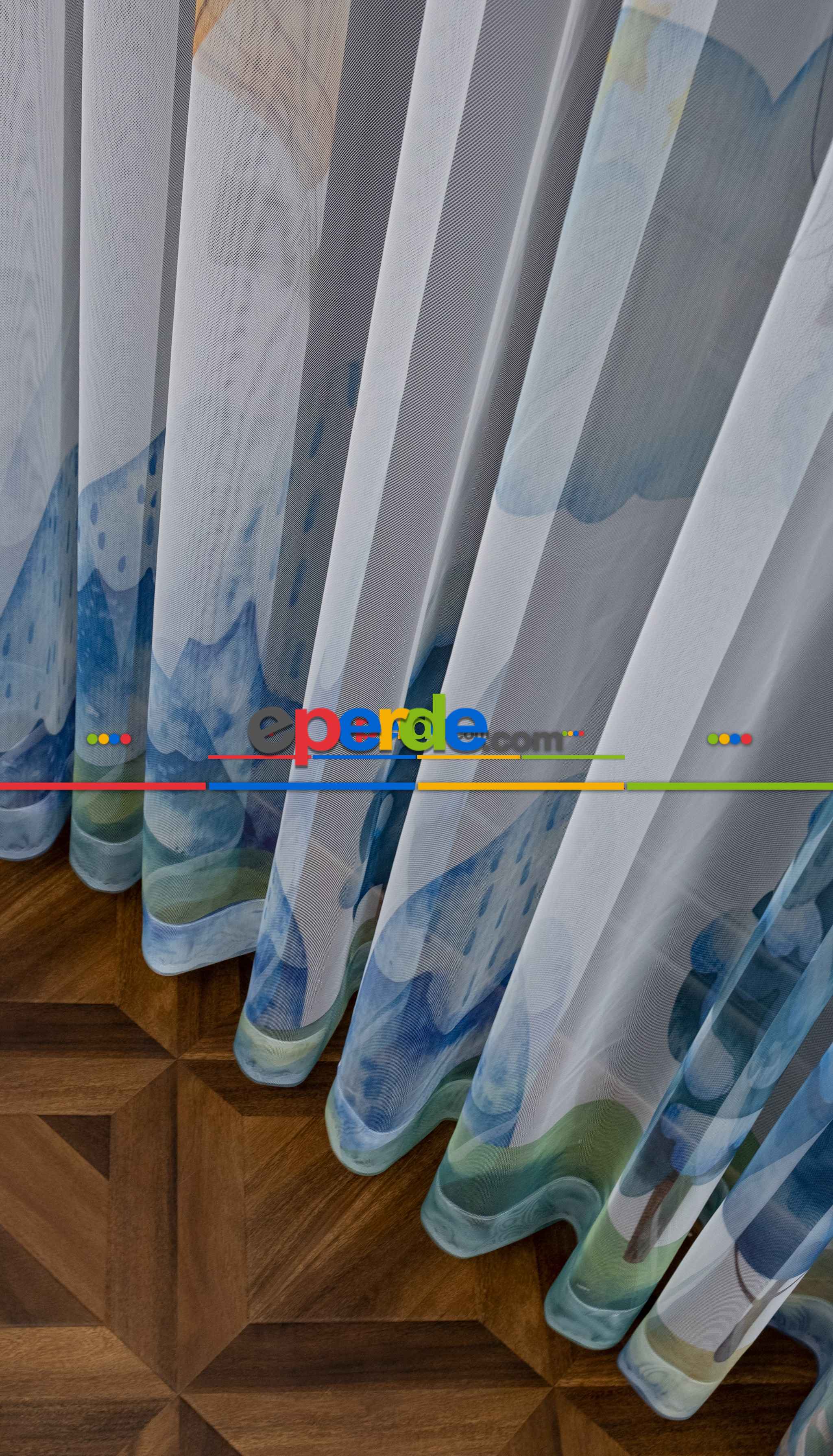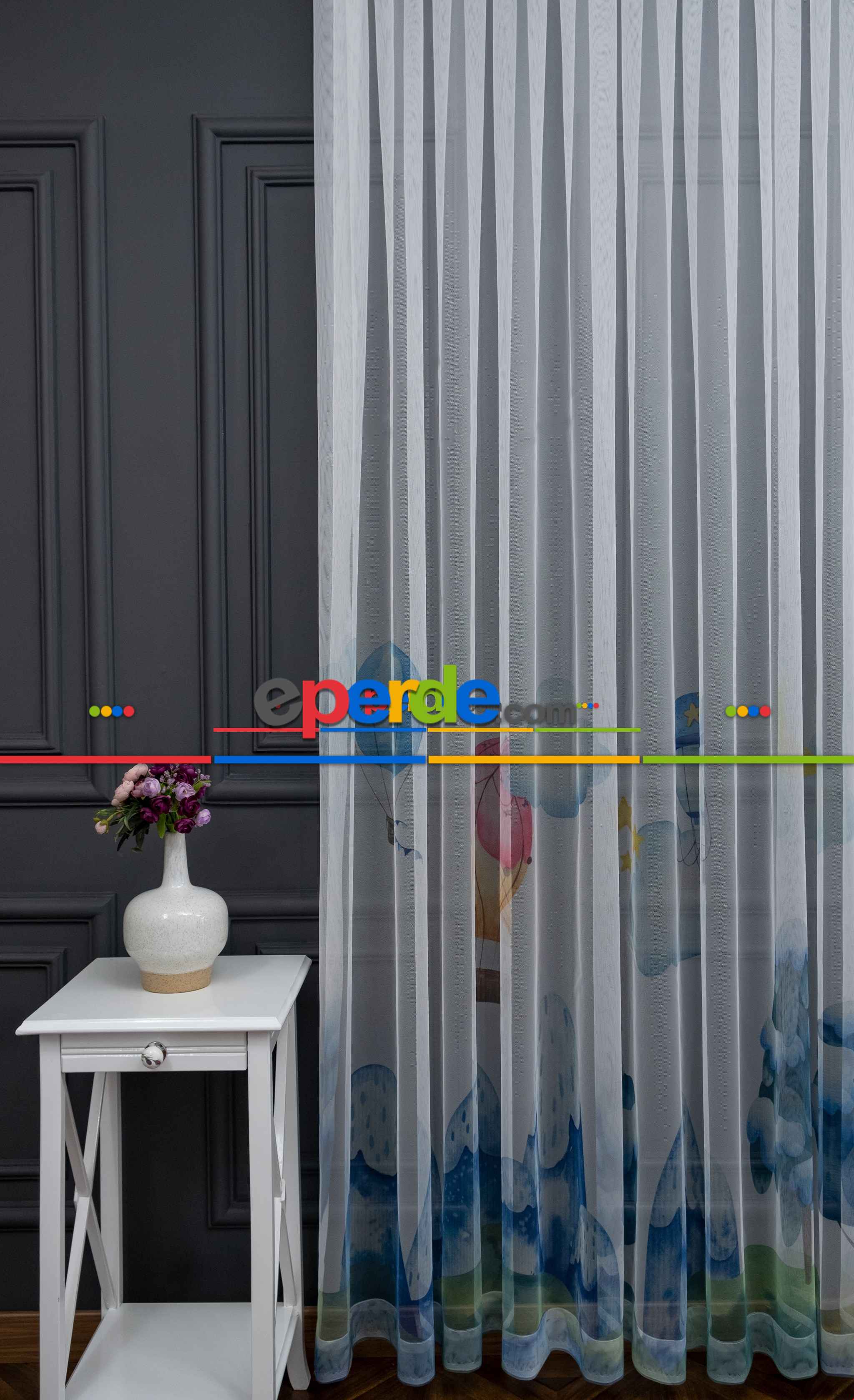 Hazır Ölçülü Petek Zemin Turuncu Ve Mavi Renkli Balon Ve Manzara Desenli Grek Baskılı Tül Perde Ödeme Seçenekleri