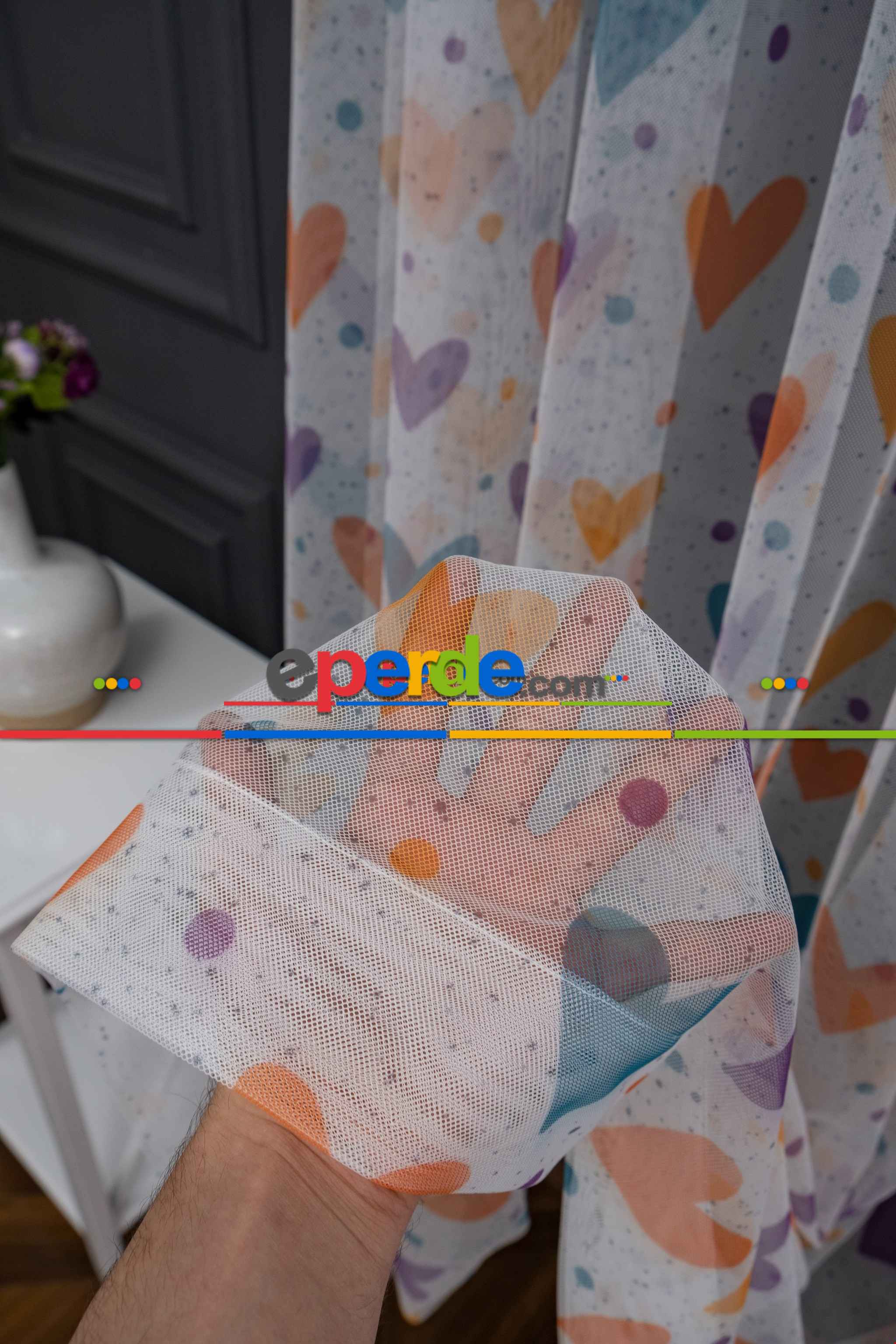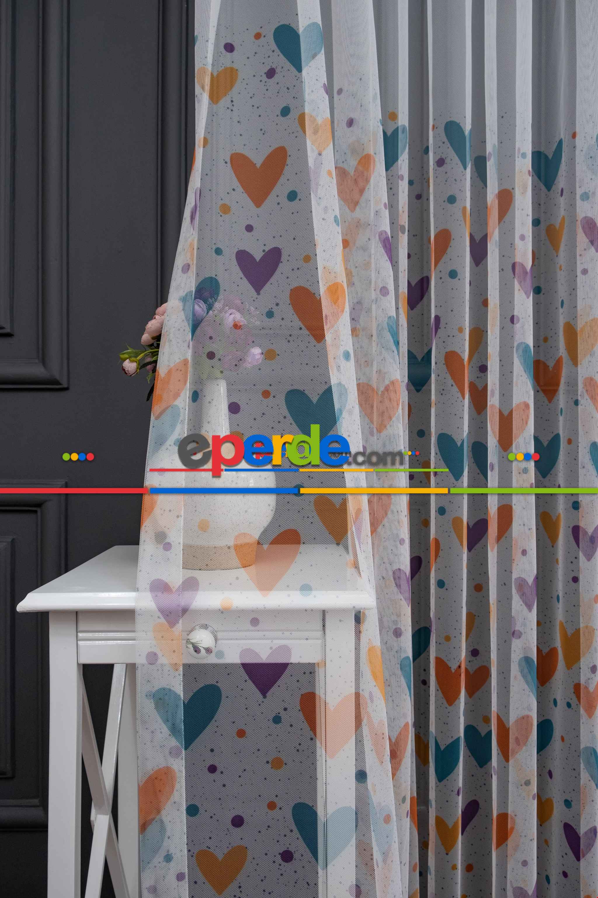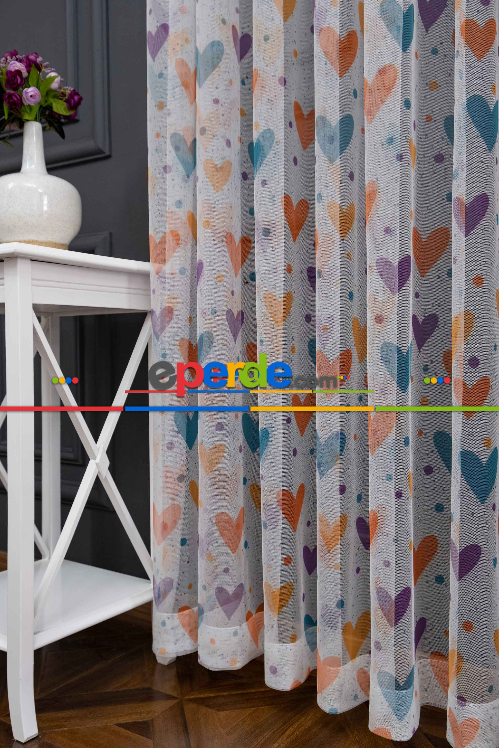 Hazır Ölçülü Petek Zemin Turuncu Ve Mavi Renkli Kalpler - Puantiye Desenli Grek Baskılı Tül Perde » Eperde