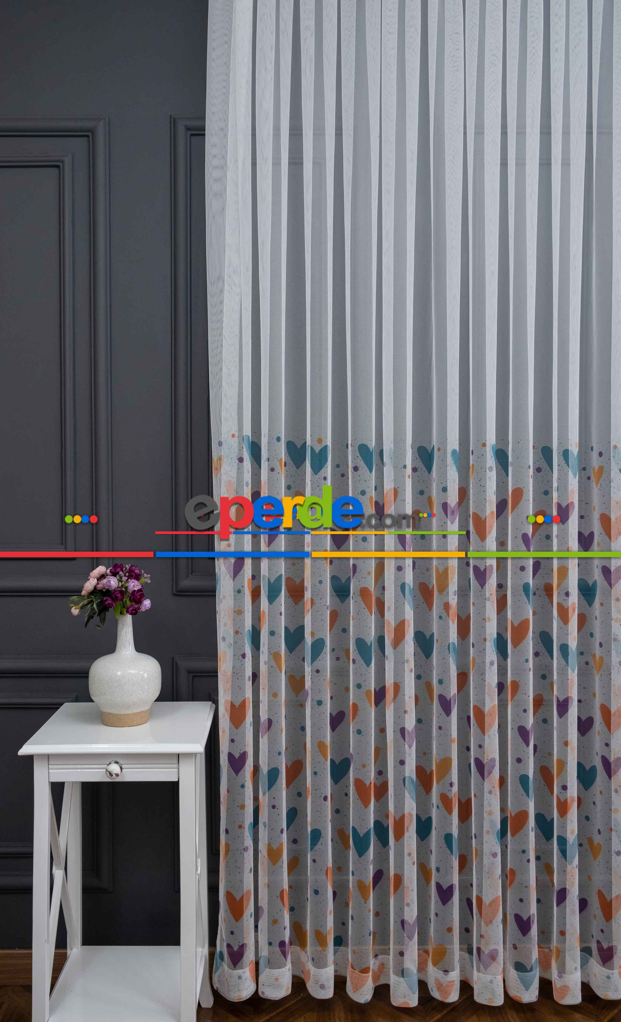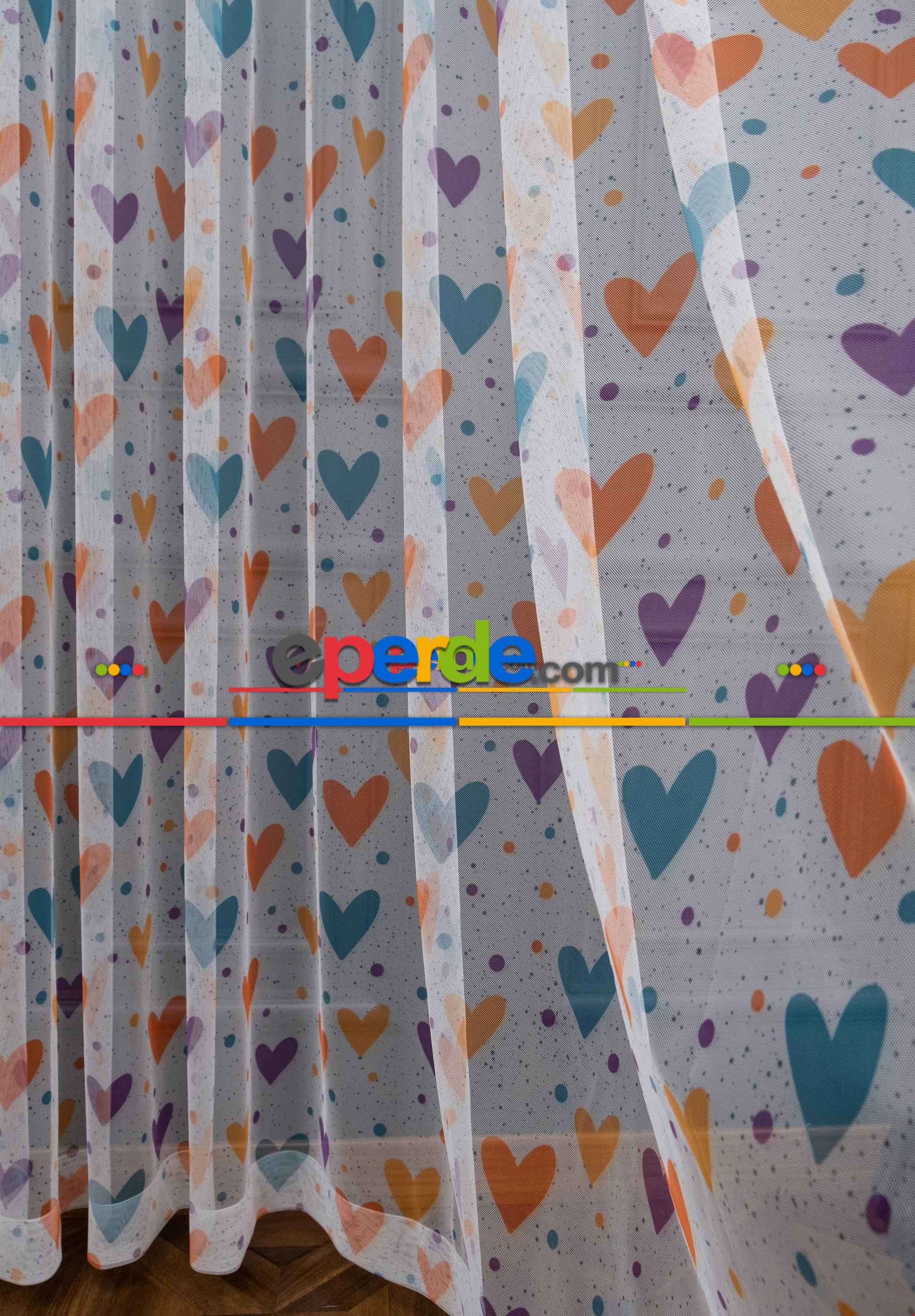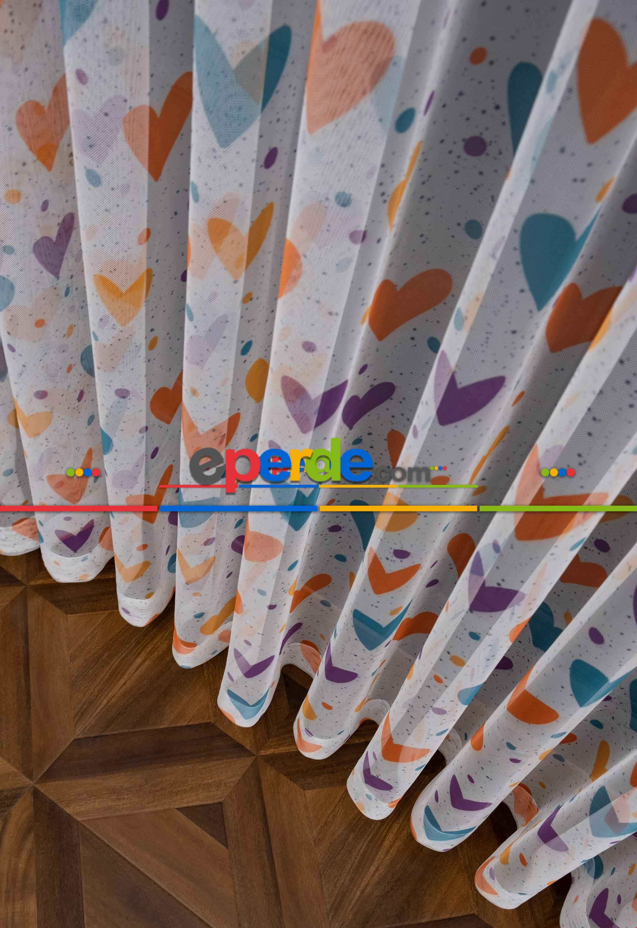 Hazır Ölçülü Petek Zemin Turuncu Ve Mavi Renkli Kalpler - Puantiye Desenli Grek Baskılı Tül Perde » Eperde