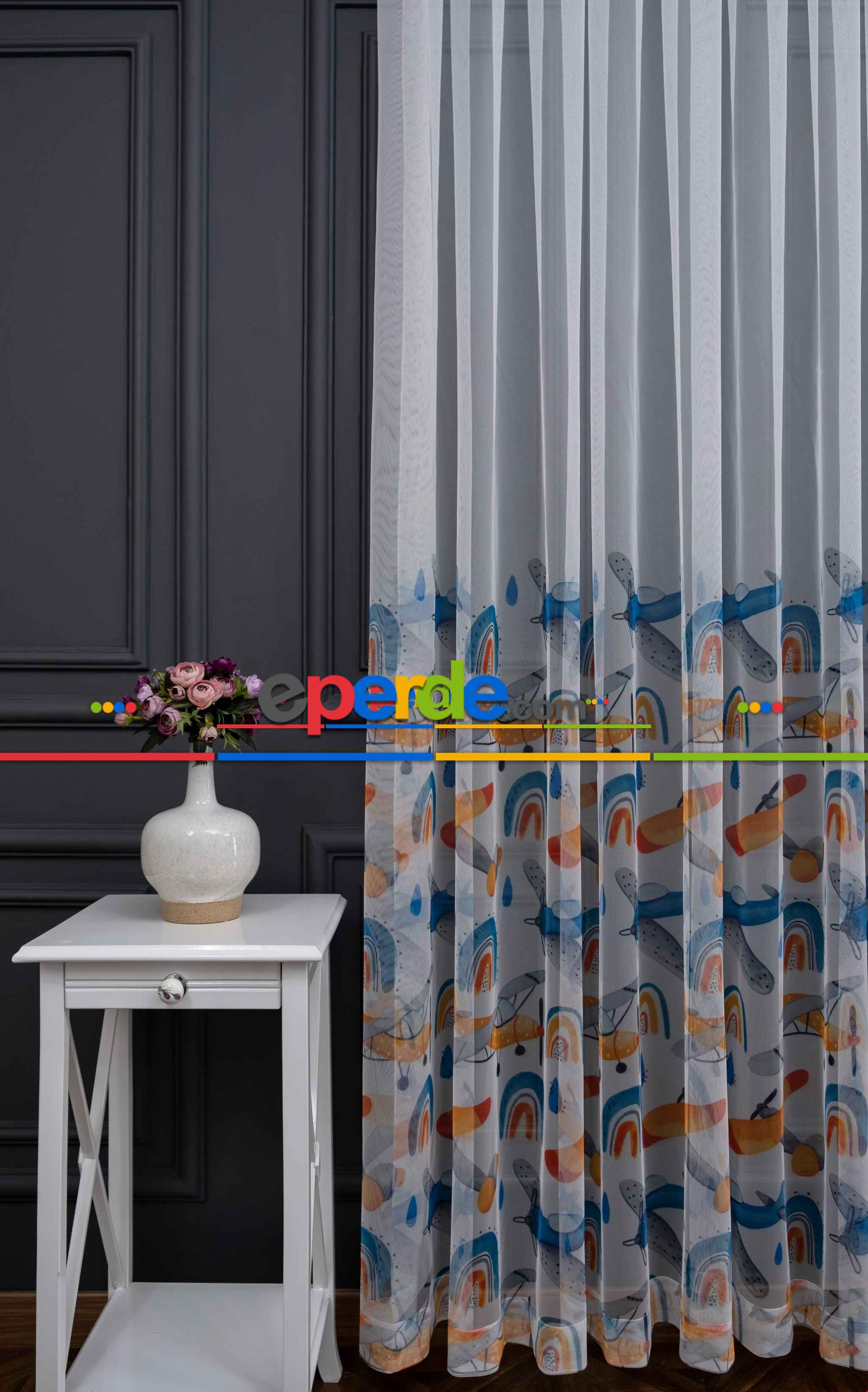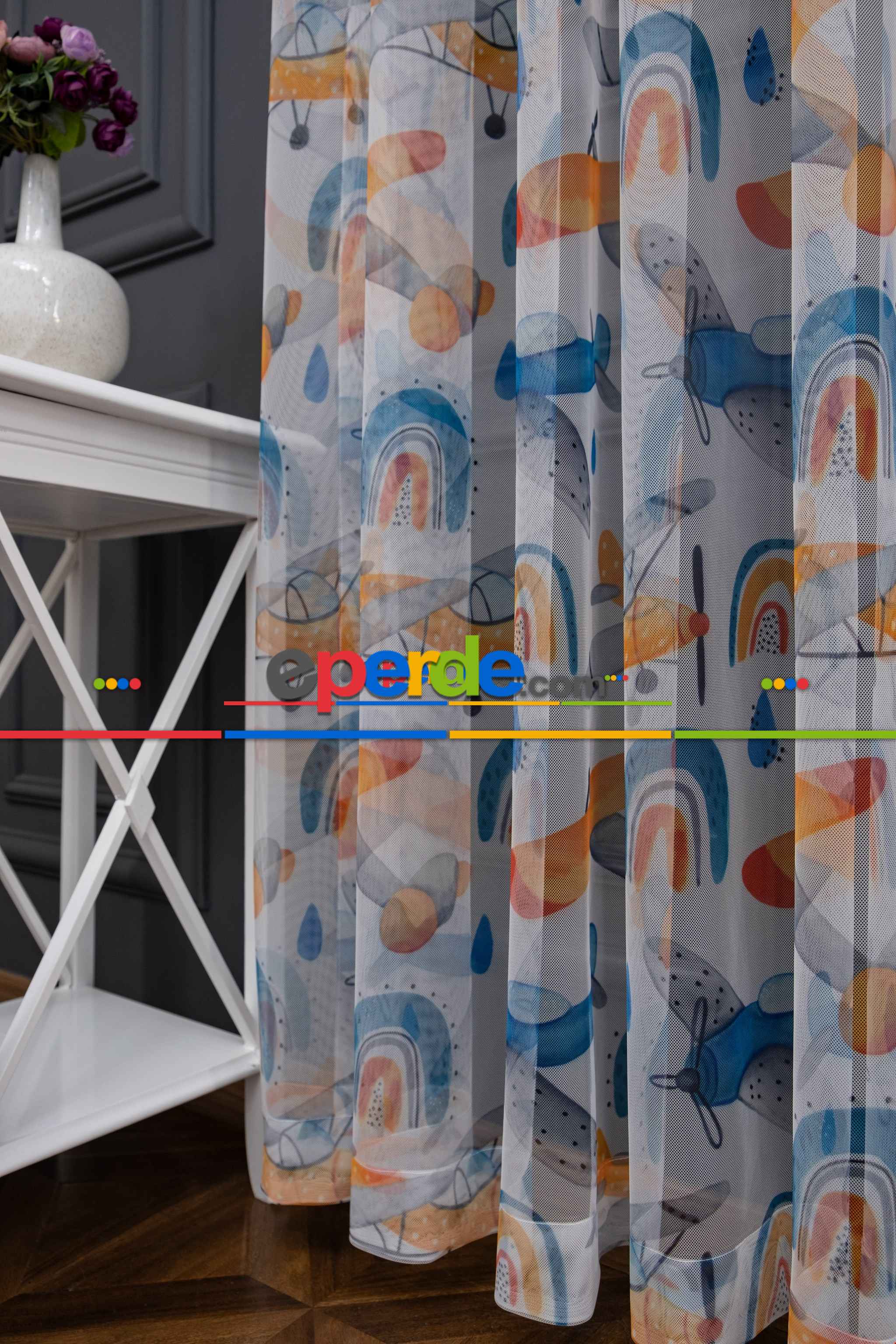 Hazır Ölçülü Petek Zemin Turuncu Ve Mavi Renkli Planör Uçak Desenli Grek Baskılı Tül Perde Ödeme Seçenekleri