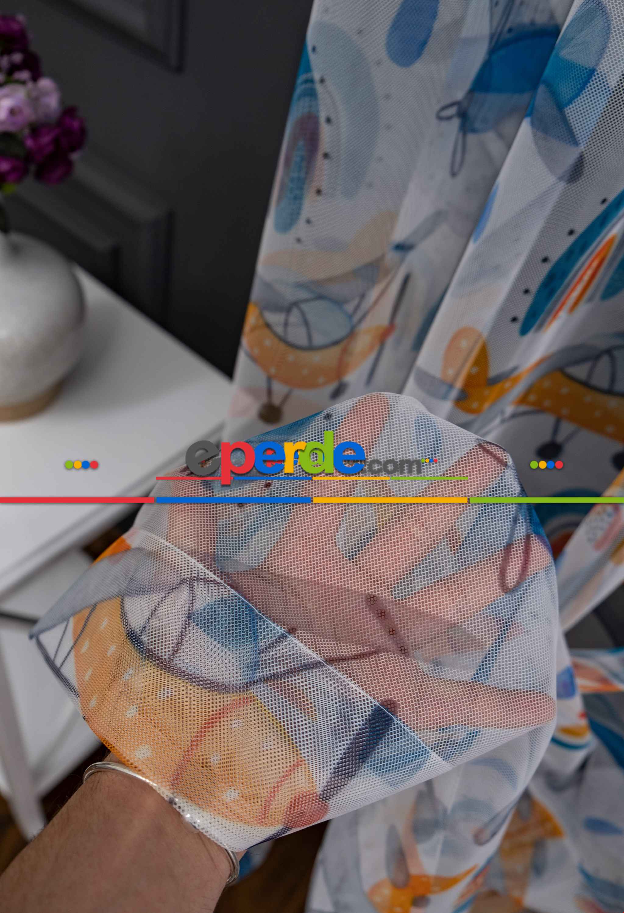 Hazır Ölçülü Petek Zemin Turuncu Ve Mavi Renkli Planör Uçak Desenli Grek Baskılı Tül Perde