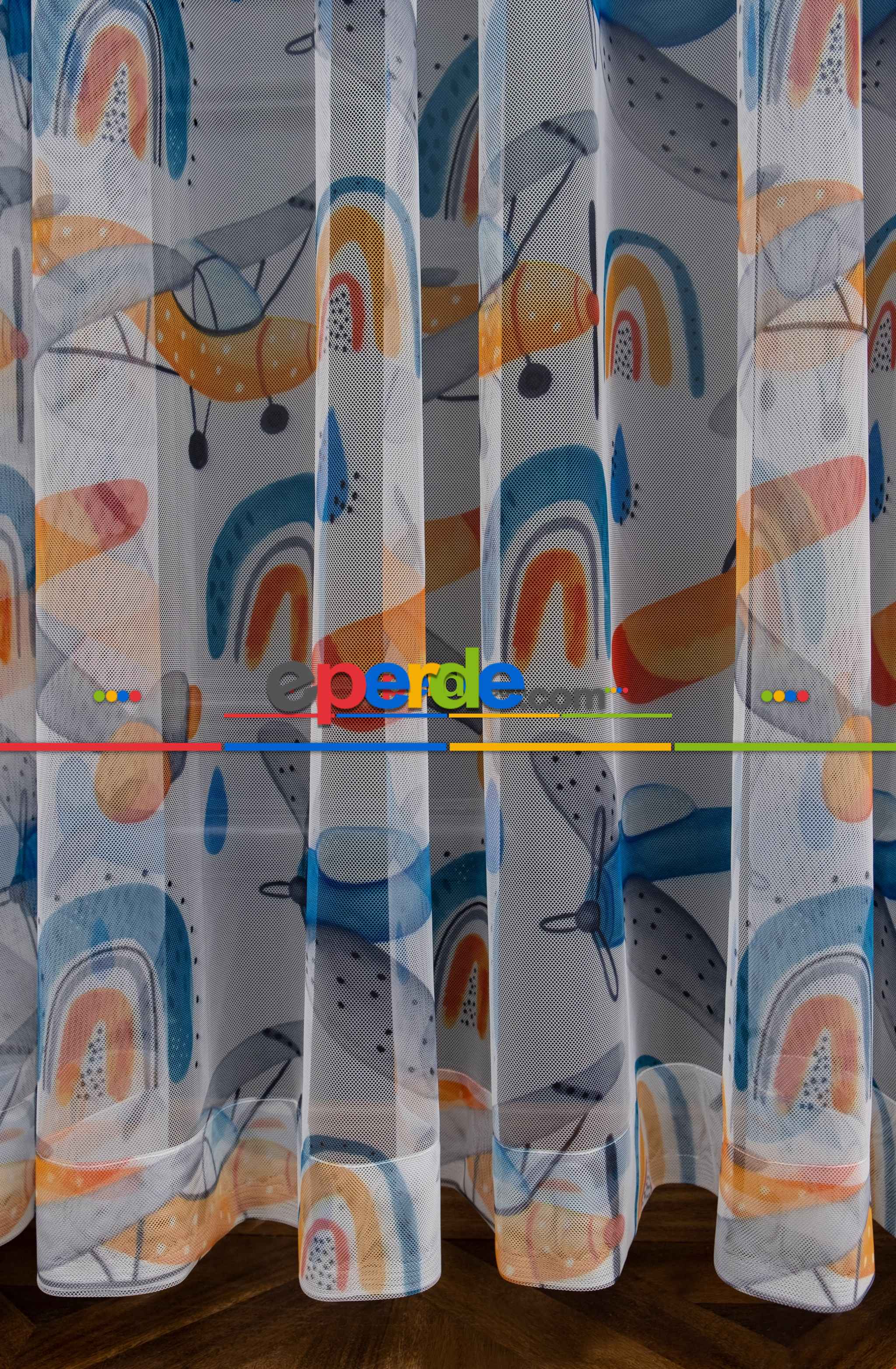 Hazır Ölçülü Petek Zemin Turuncu Ve Mavi Renkli Planör Uçak Desenli Grek Baskılı Tül Perde » Eperde