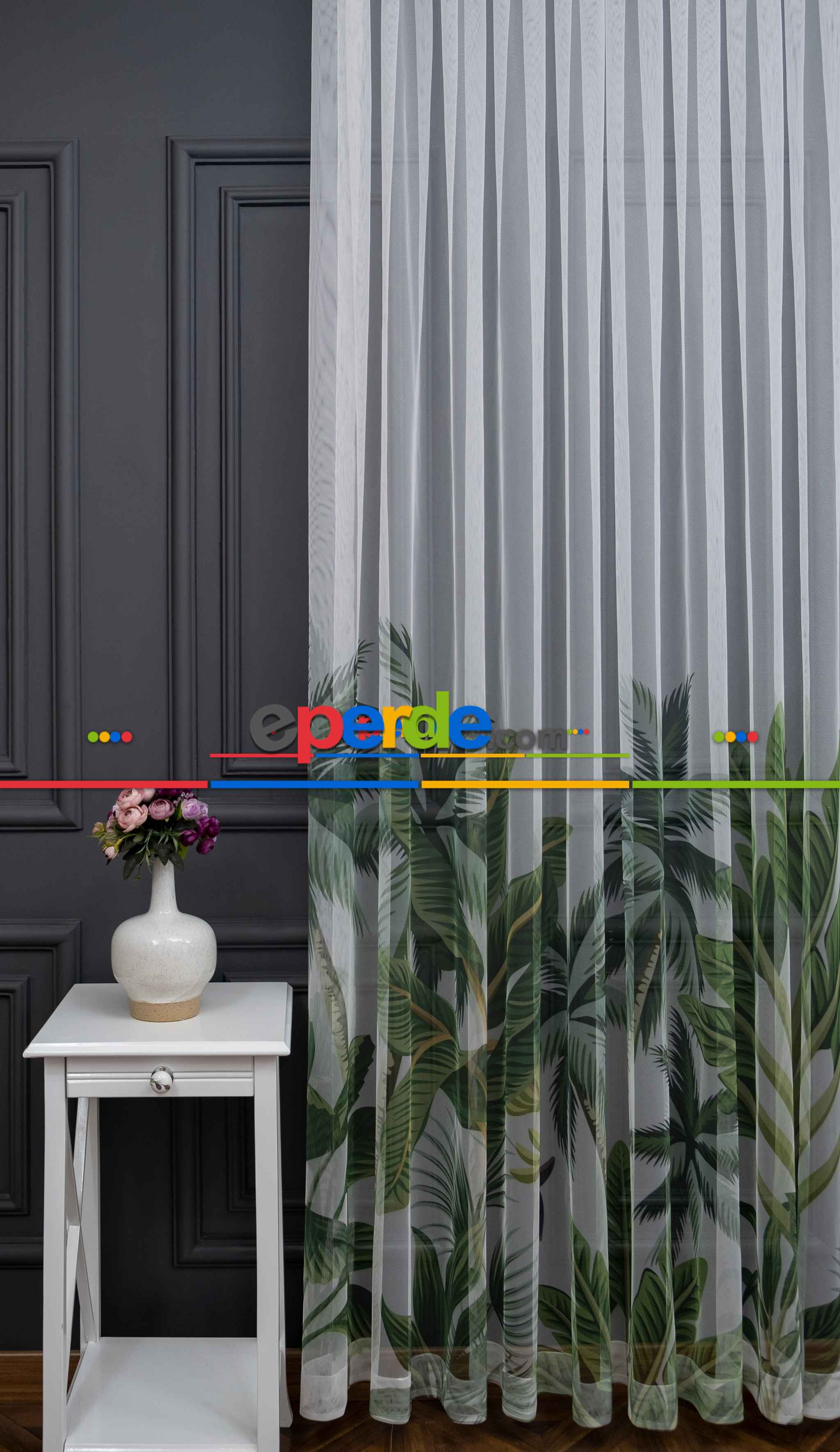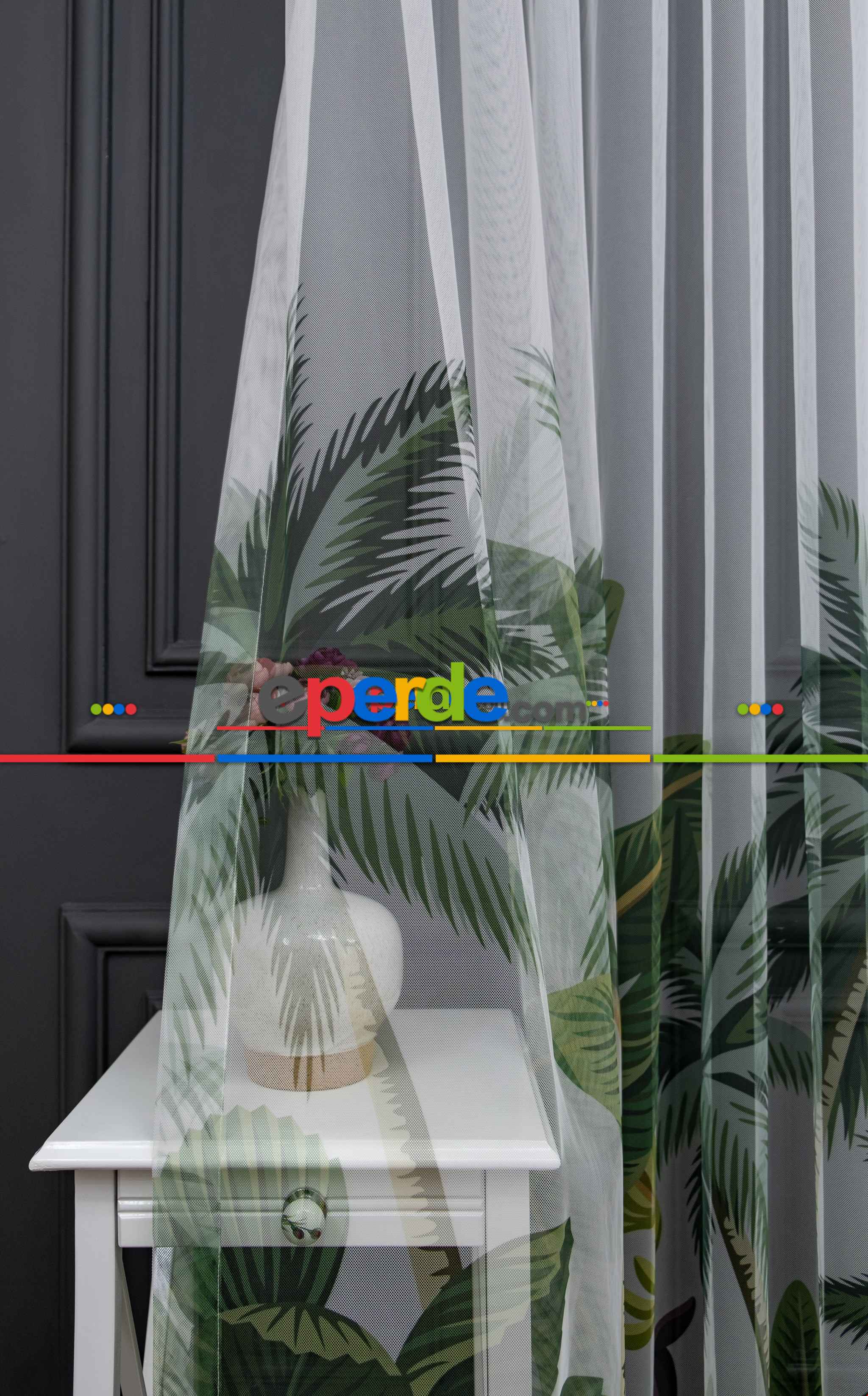 Hazır Ölçülü Petek Zemin Yeşil Renkli Yapraklar Desenli Grek Baskılı Tül Perde