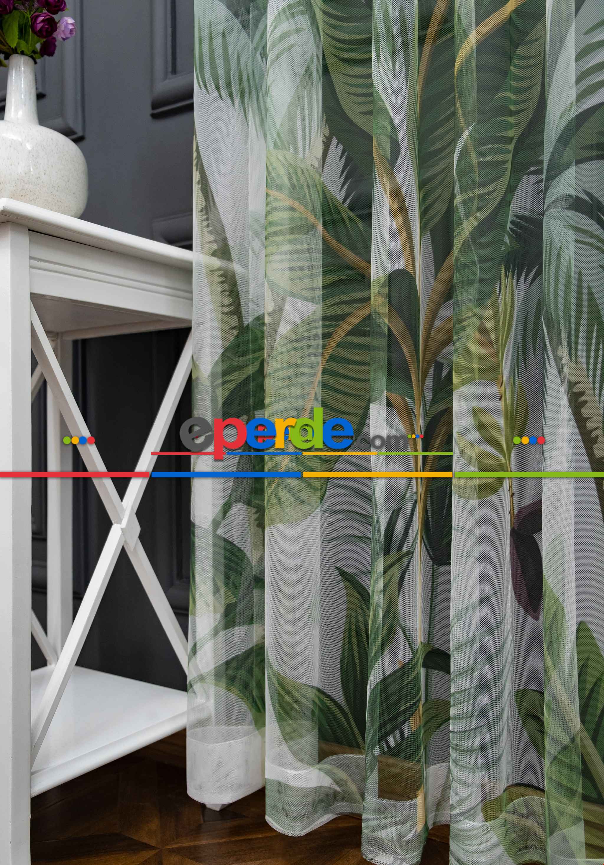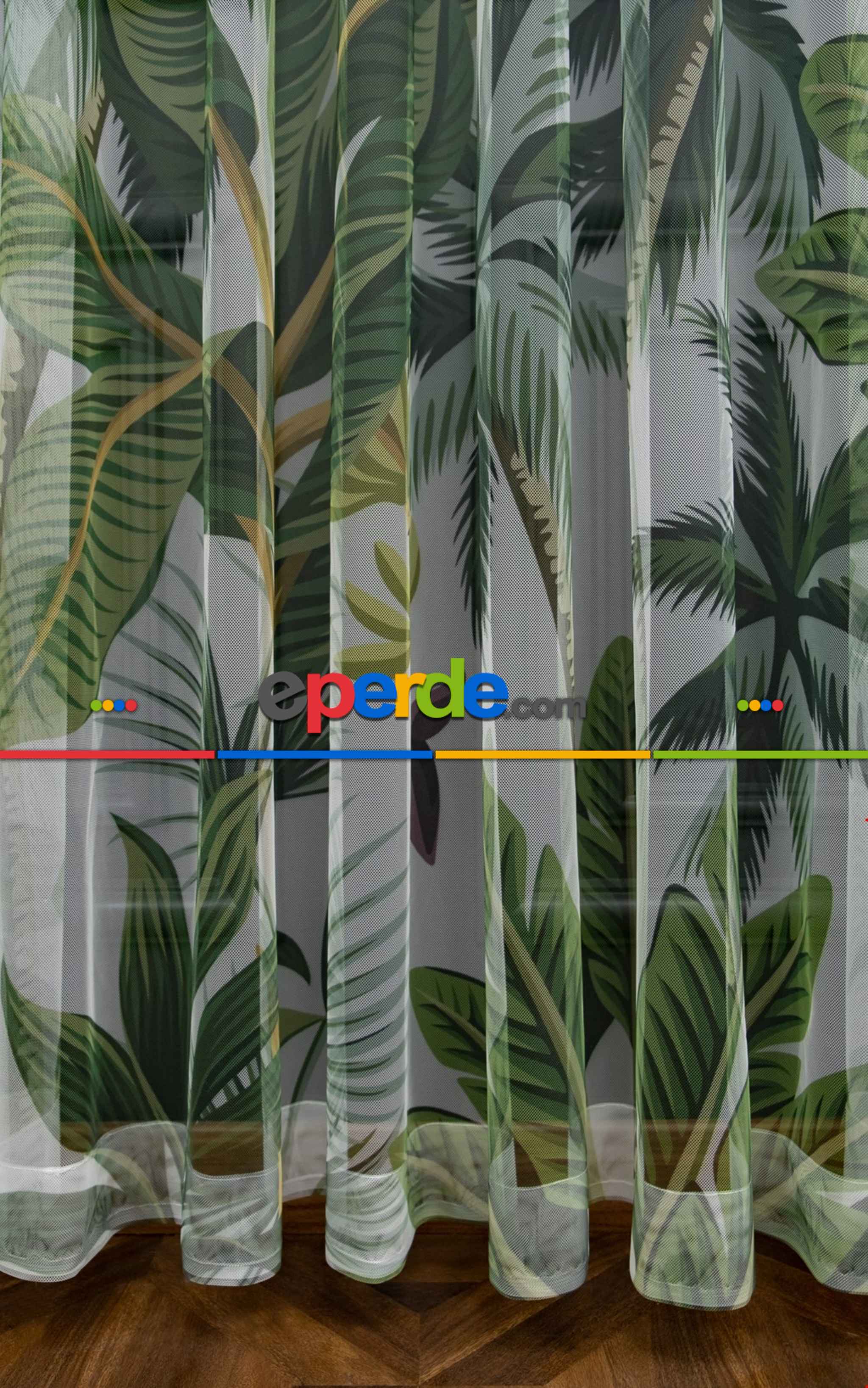 Hazır Ölçülü Petek Zemin Yeşil Renkli Yapraklar Desenli Grek Baskılı Tül Perde Ödeme Seçenekleri