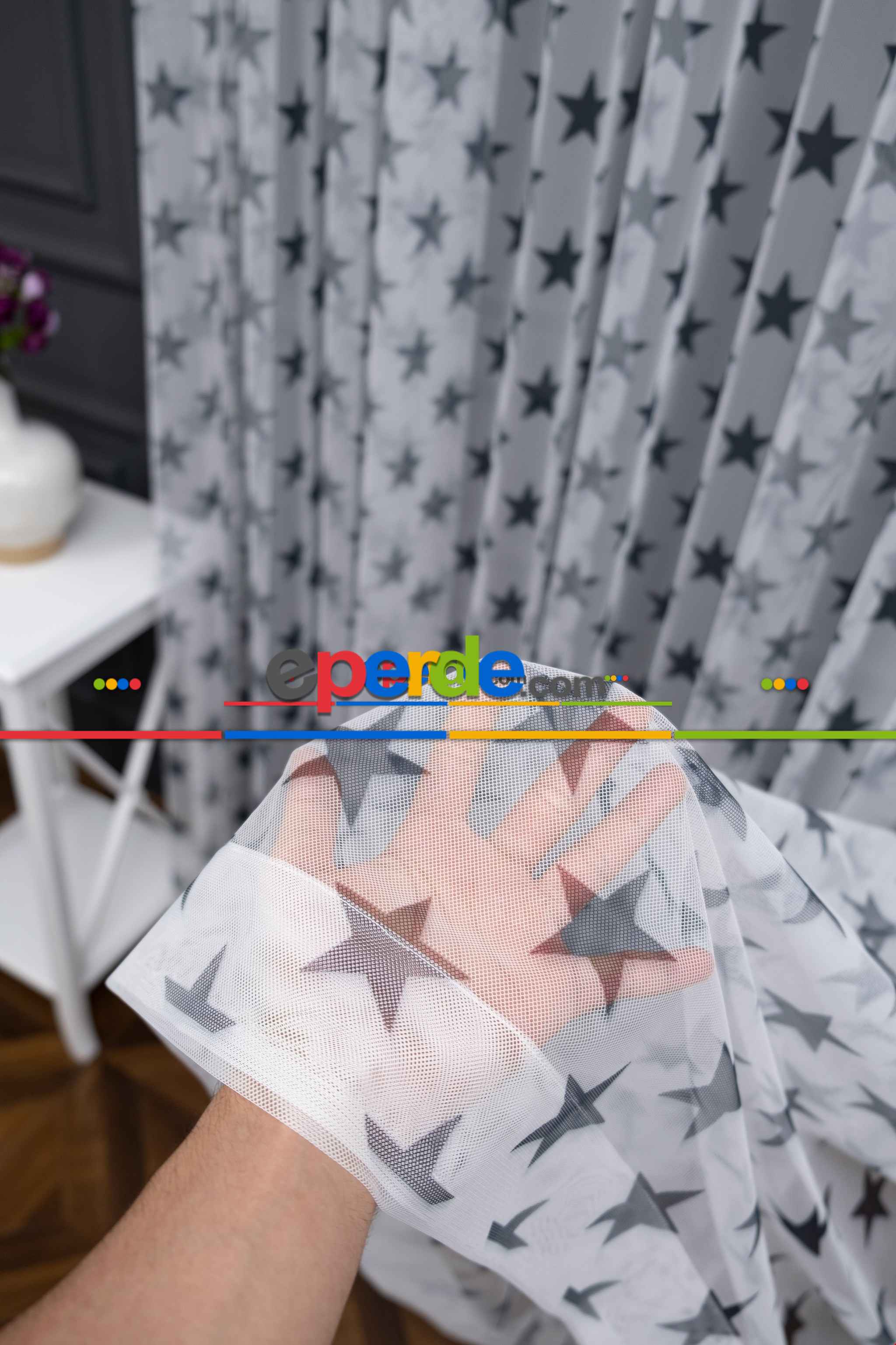 Fransa | İndirimli Fiyat!! Petek Zemin Koyu Antrasit Renkli Sık Pileli Yıldız Desenli Grek Baskılı Tül Perde » Eperde