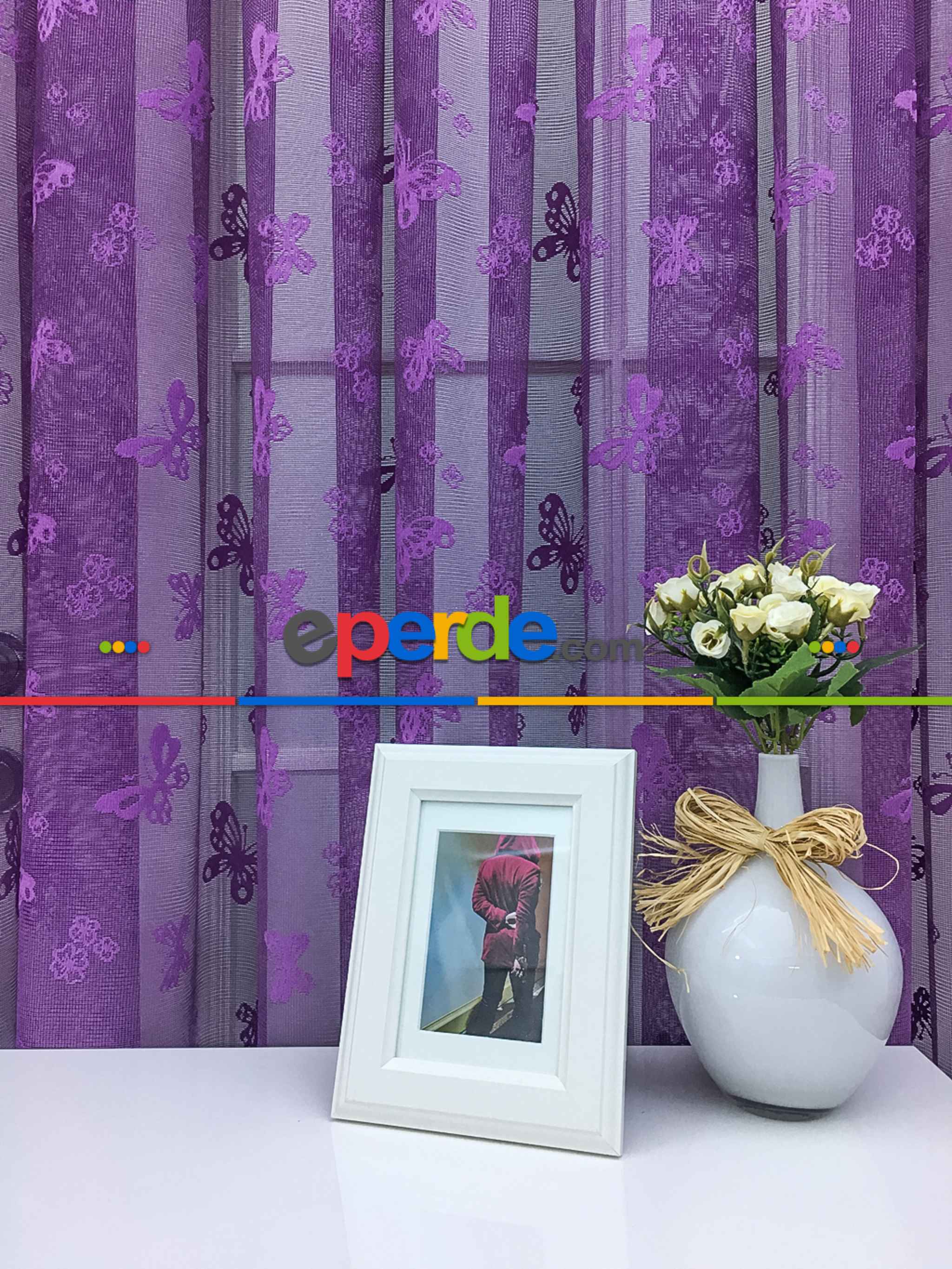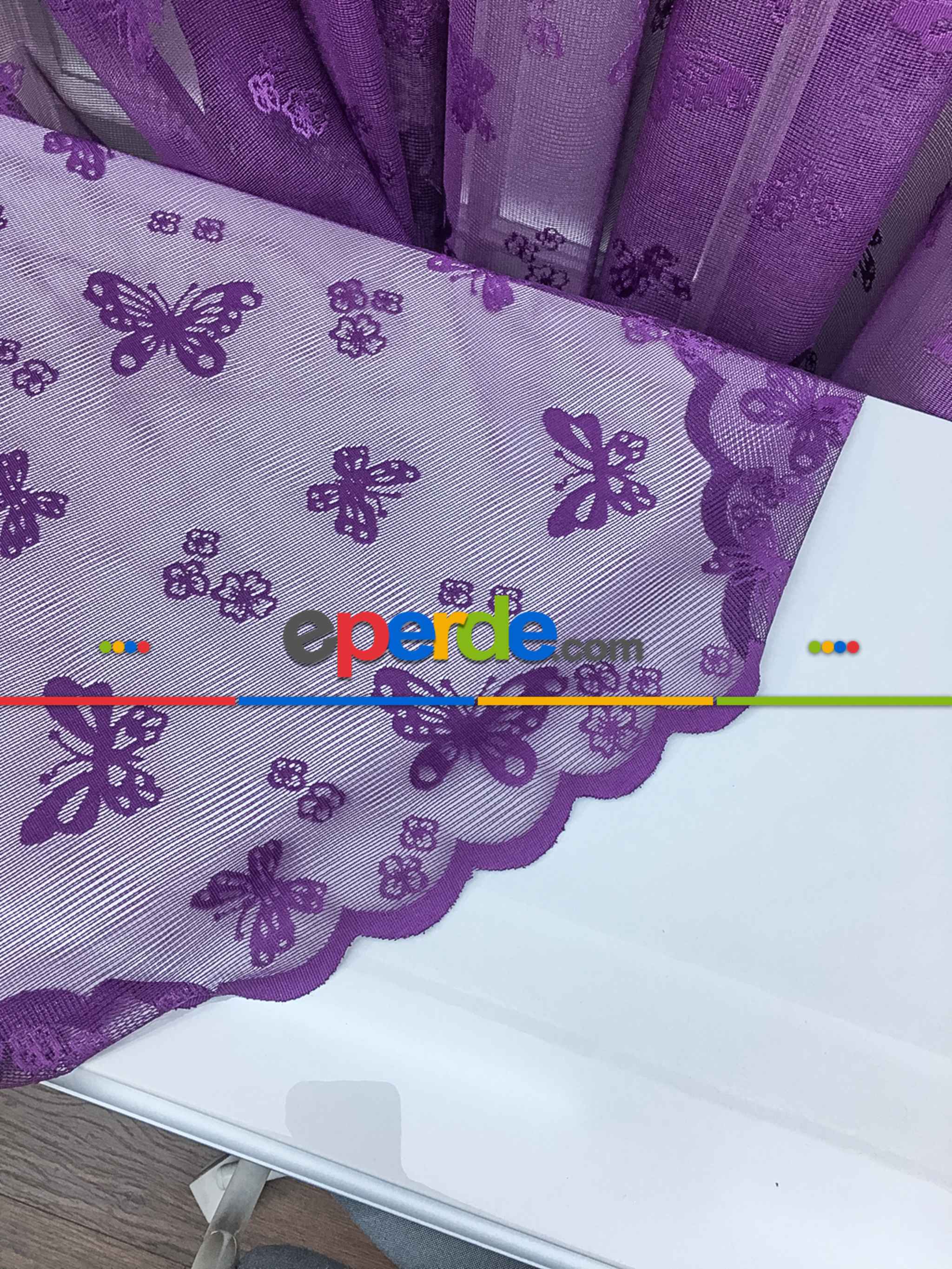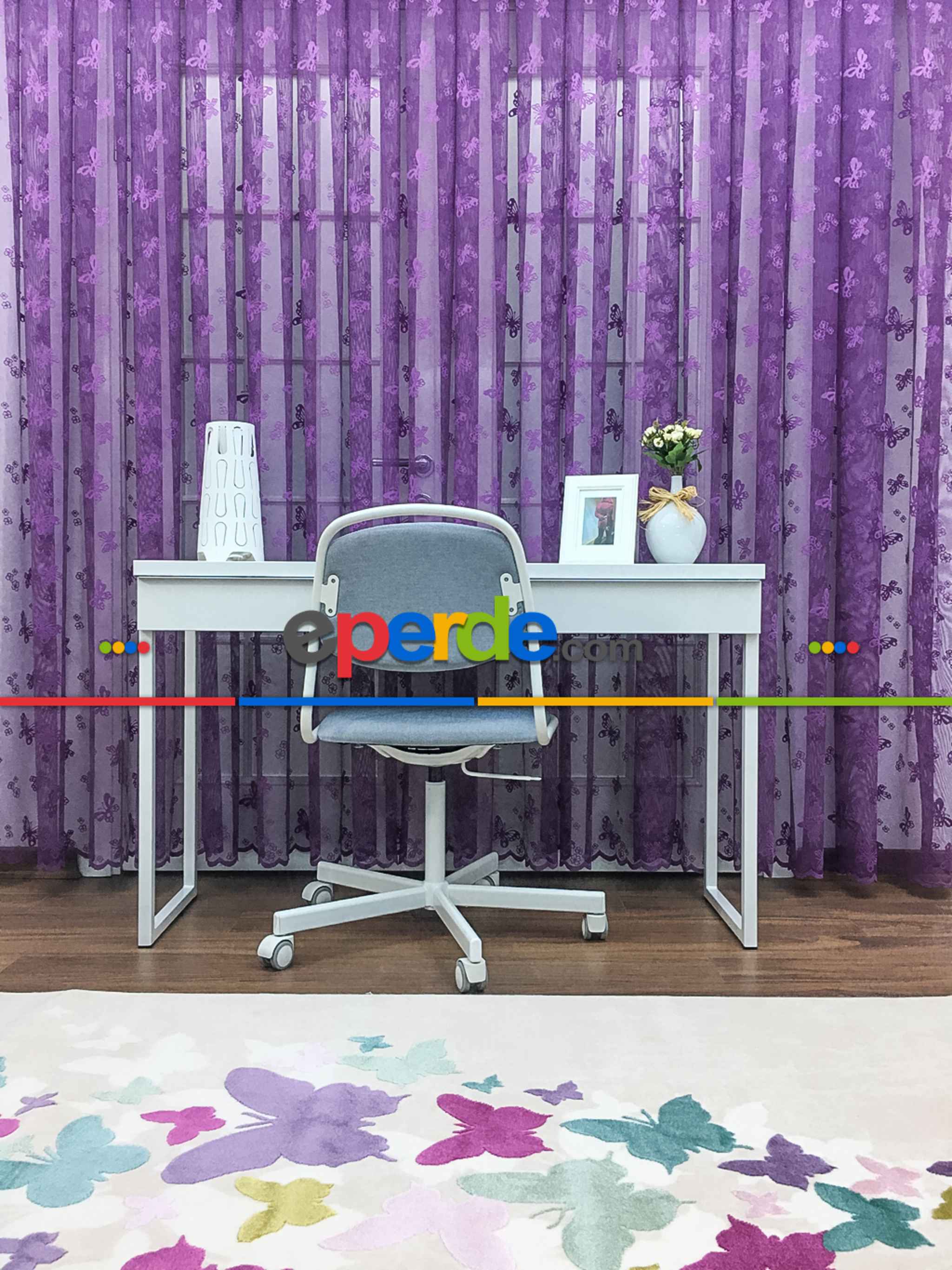 Kelebek Desenli Kız Çocuk Odası İçin Tül Perde - Mor- Mor Ürün Açıklaması