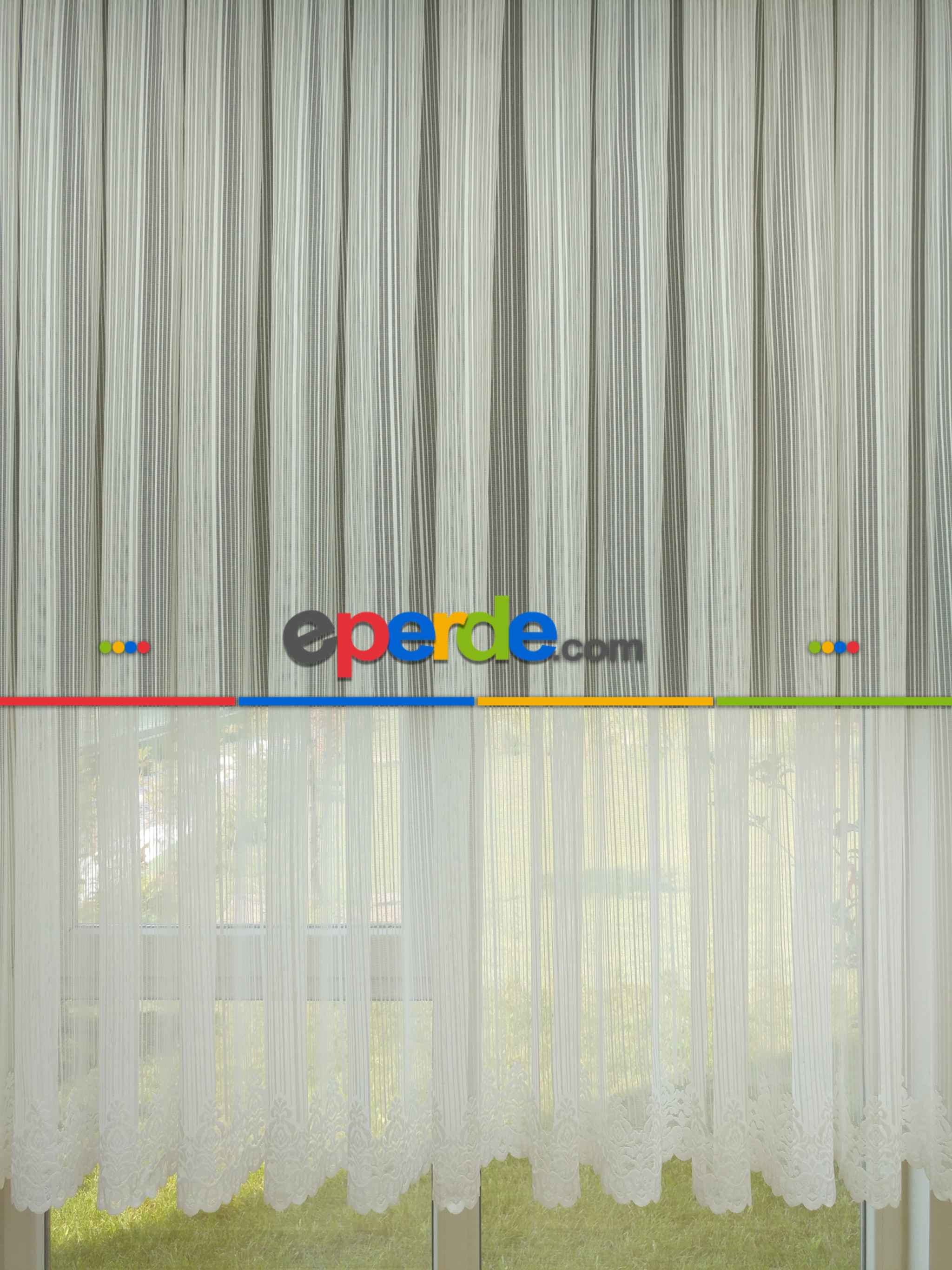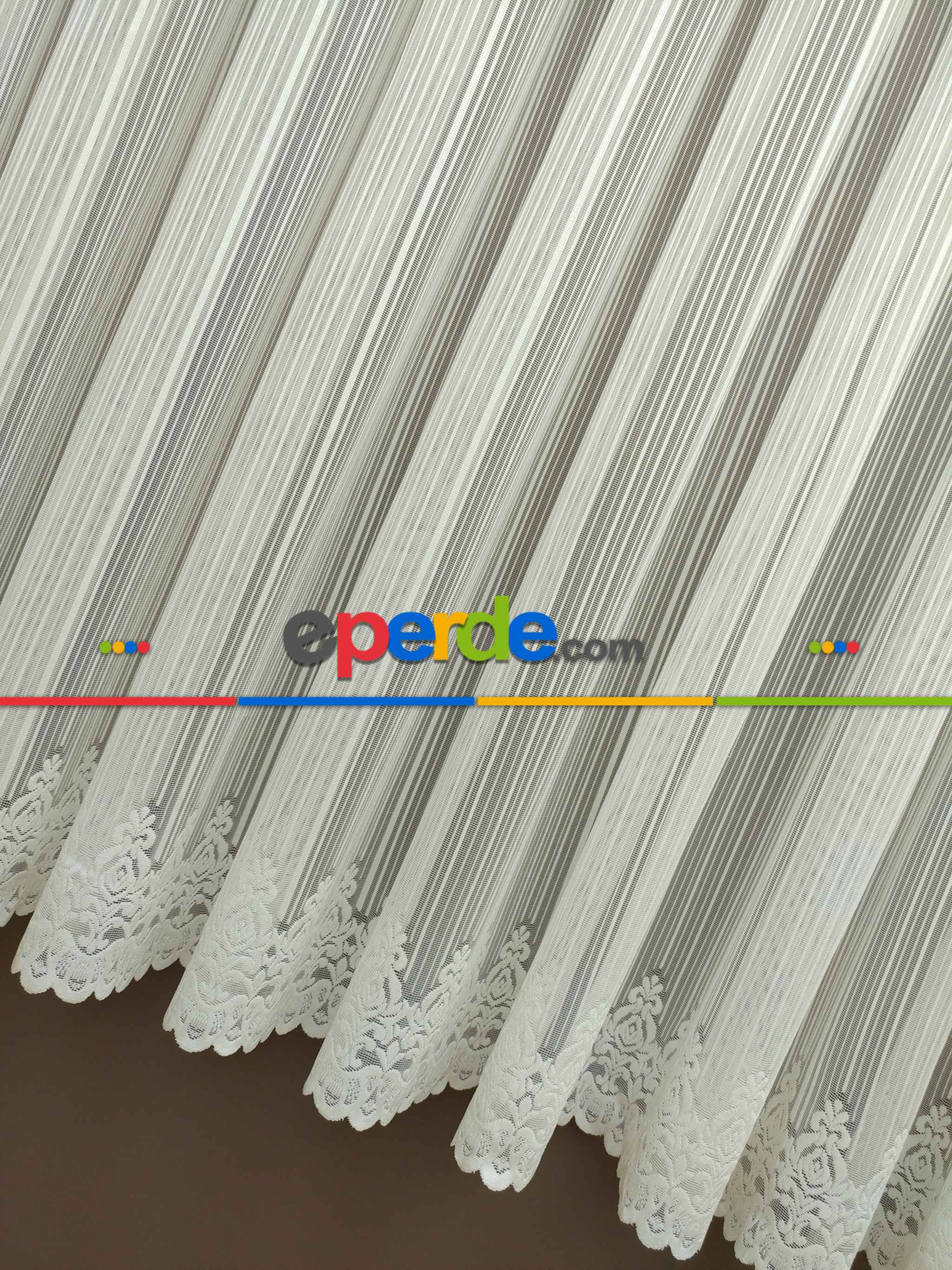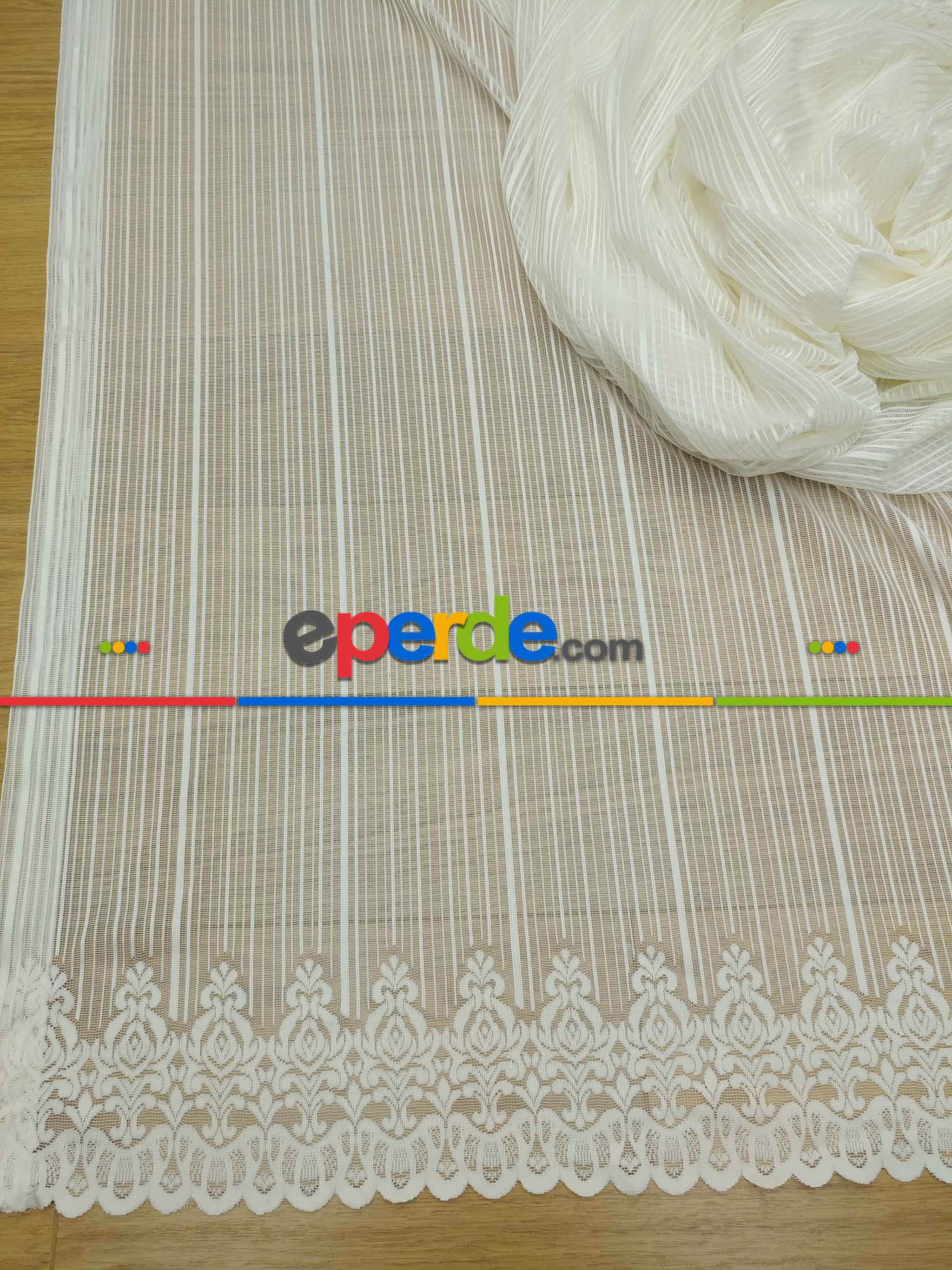 Kısa Boylu Boyuna Çizgili Etek Ucu Desenli Tül Perde - Petek Üstü Boy- Ekru