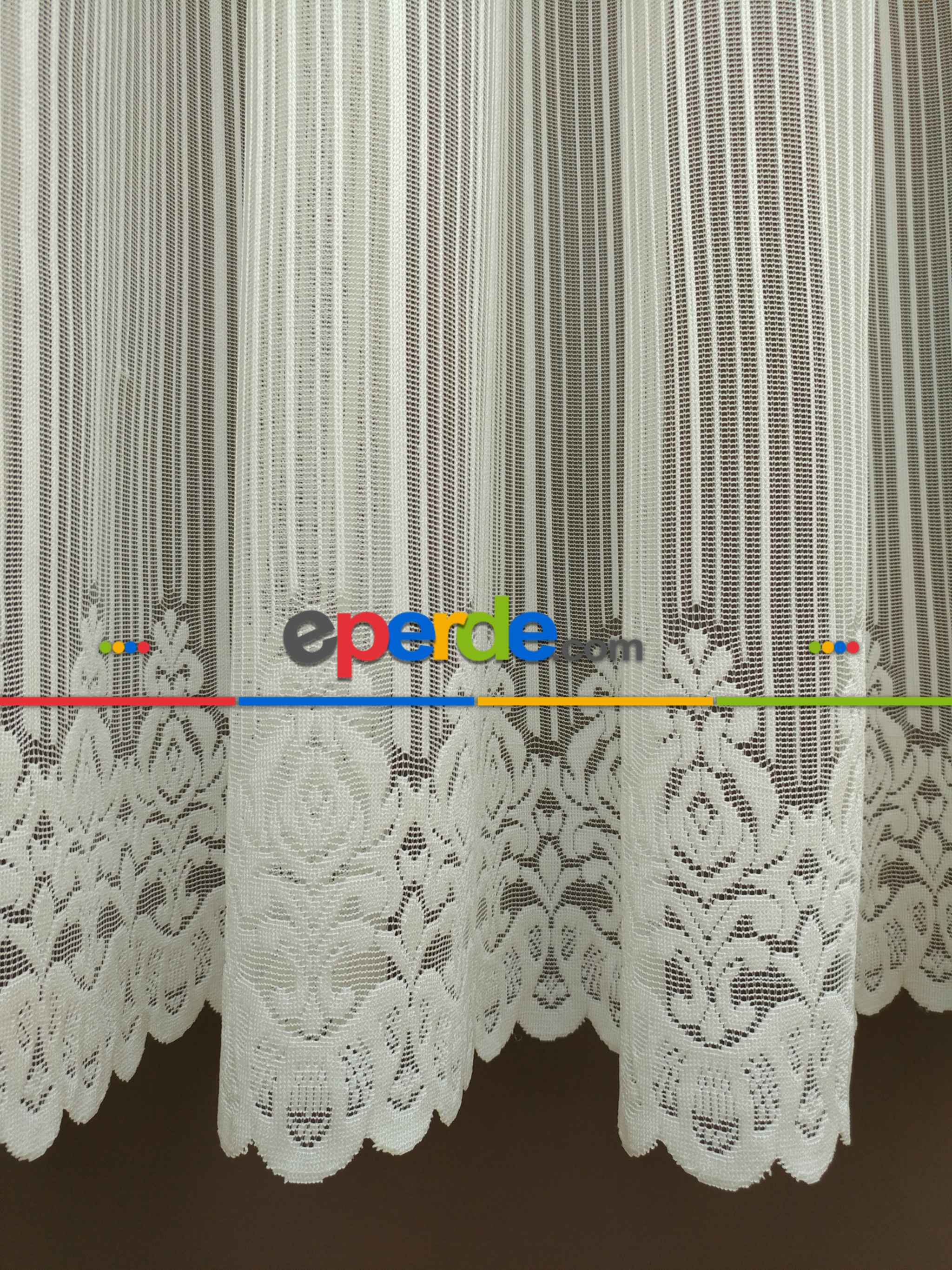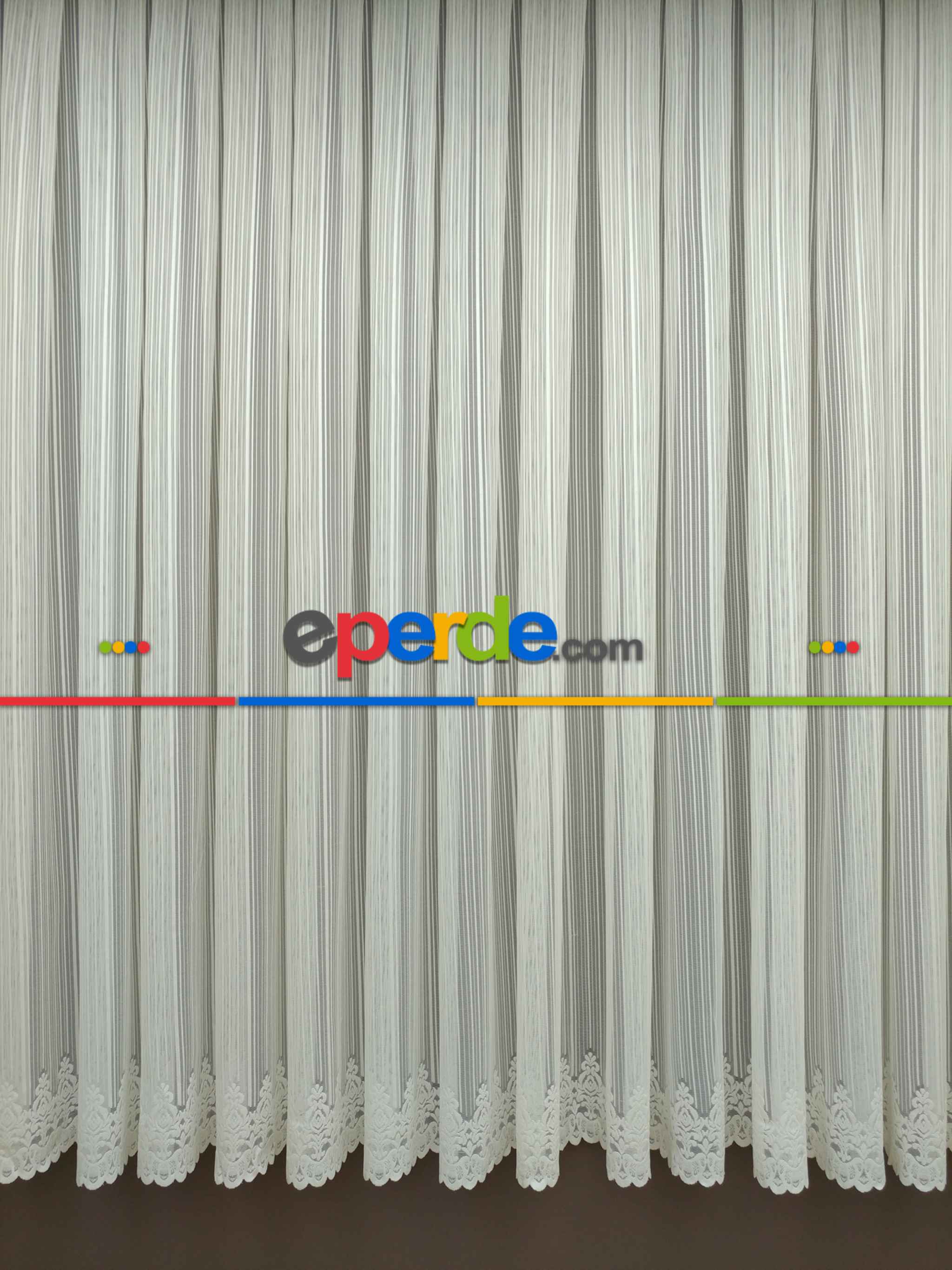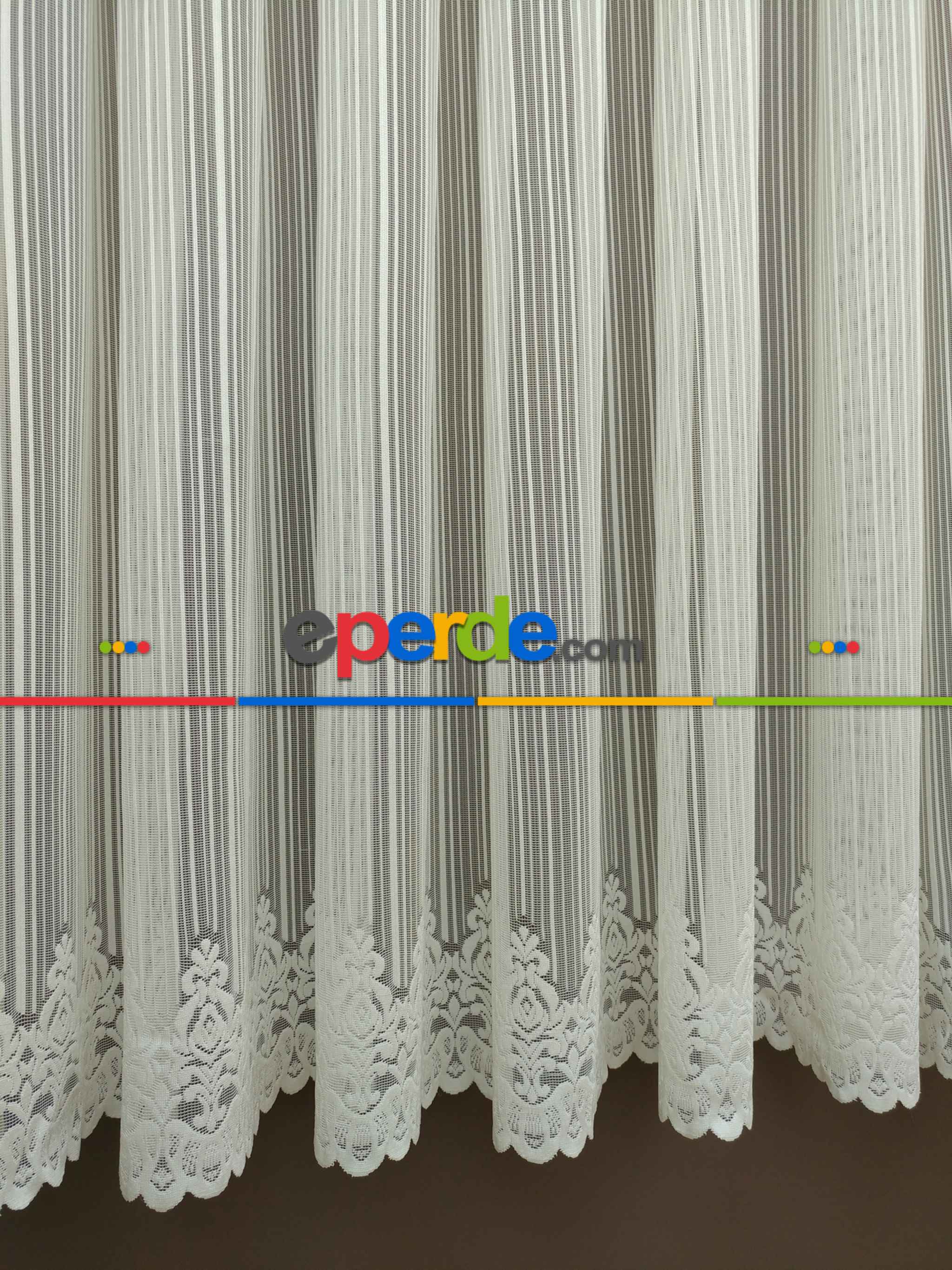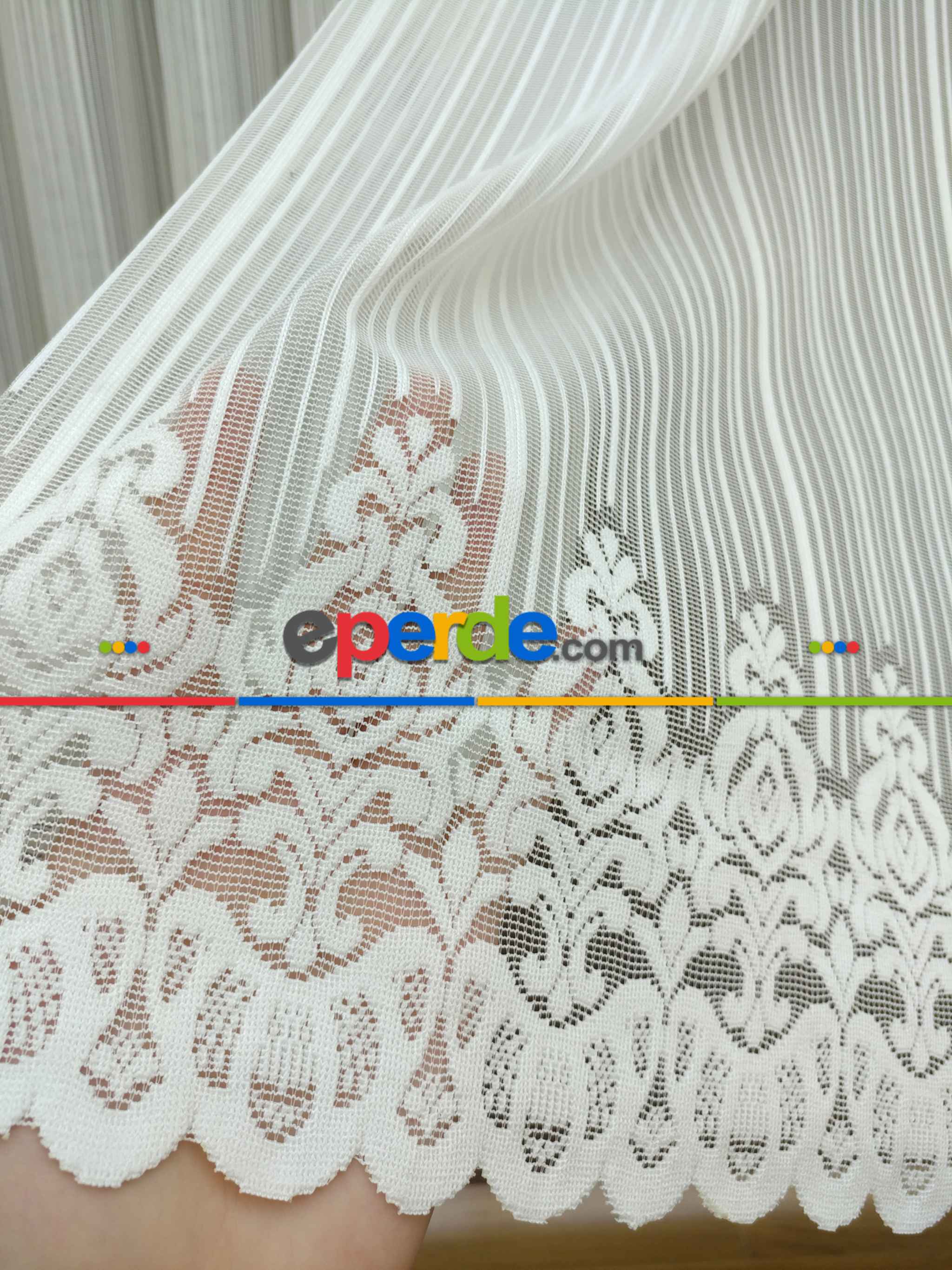 Kısa Boylu Boyuna Çizgili Etek Ucu Desenli Tül Perde - Petek Üstü Boy- Ekru