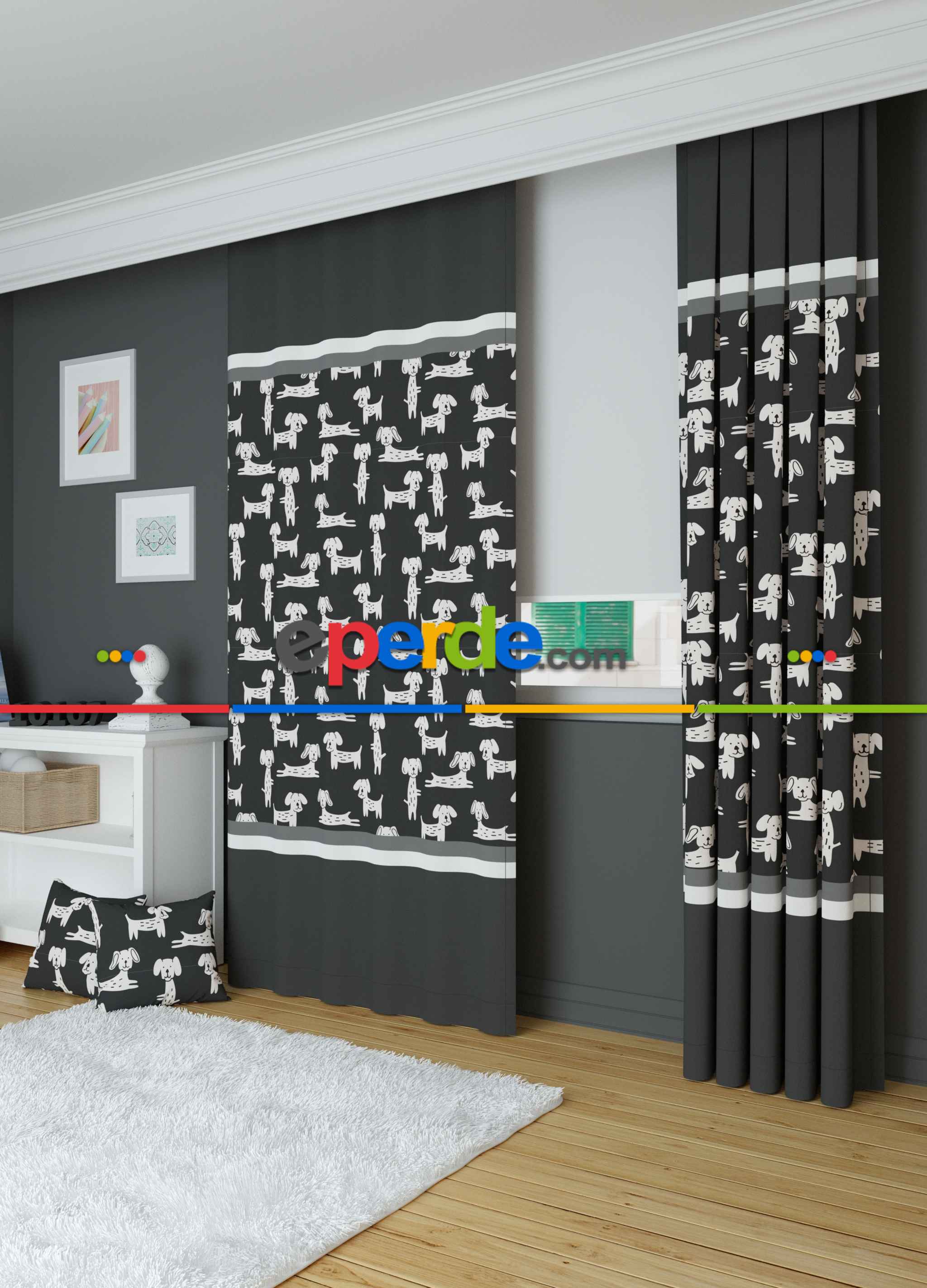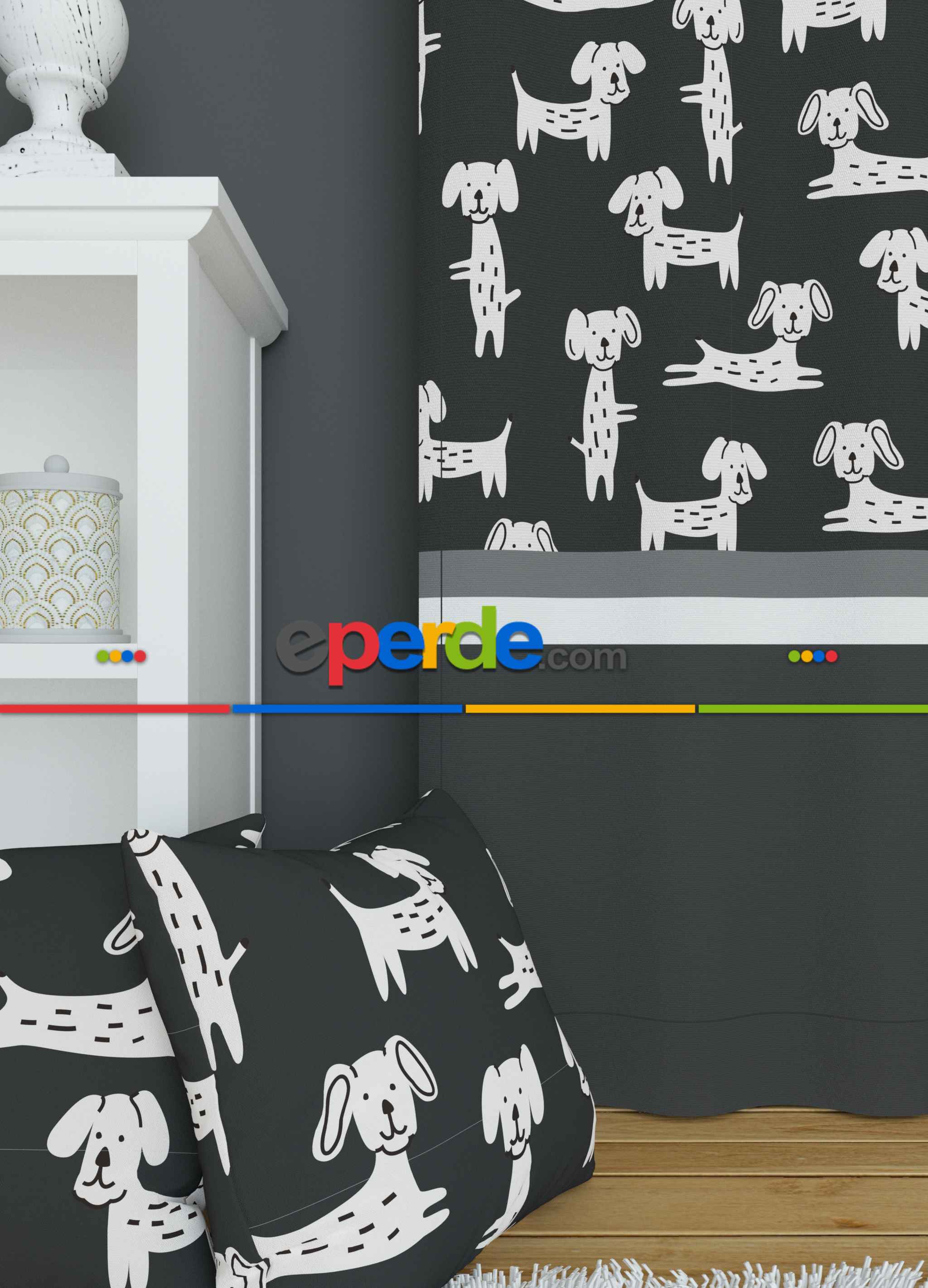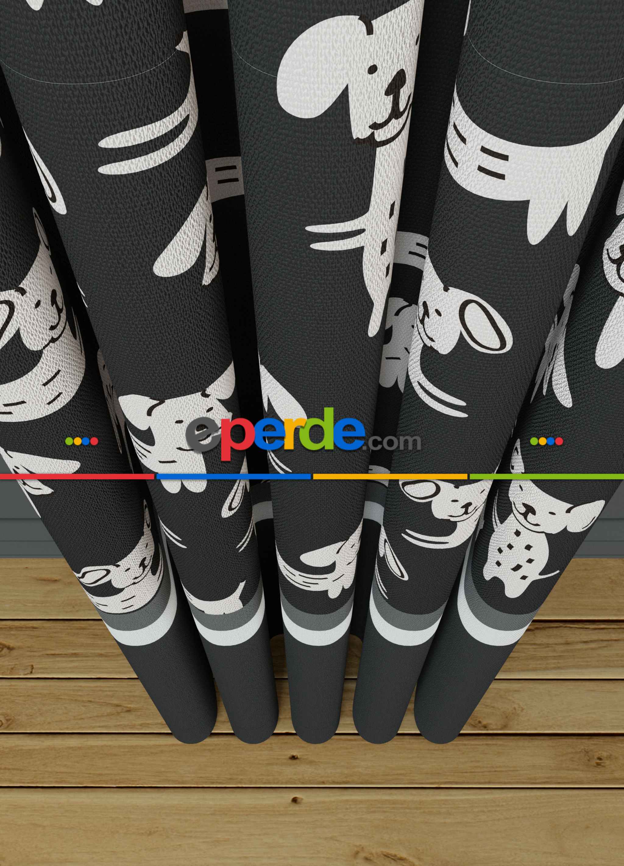 Dökümlü Kumaştan Koyu Antrasit Sevimli Hayvanlar Köpek Desenli Baskılı Fon Perde 1. Kalite Ürün Açıklaması