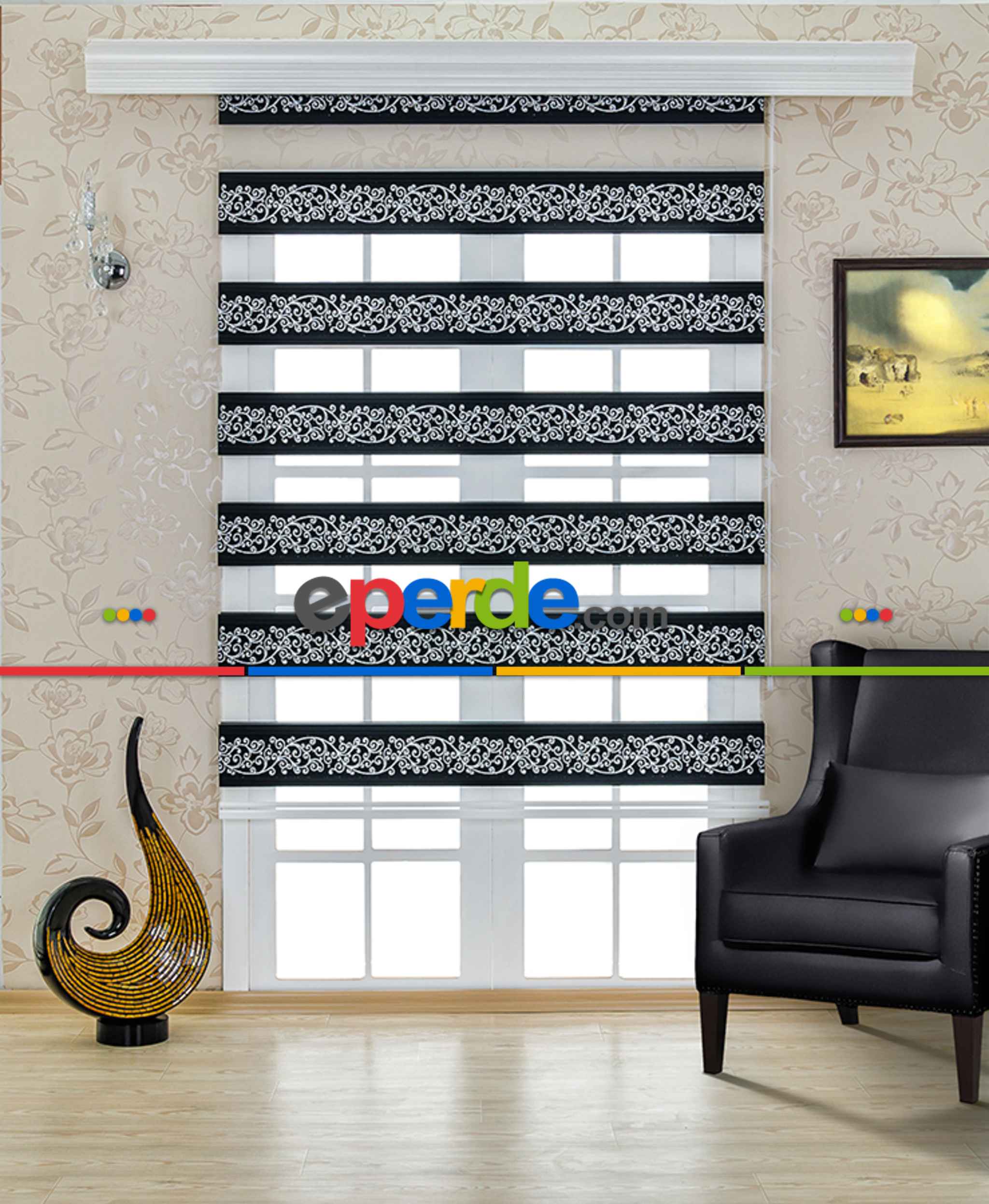 Mutfak - Siyah Sarmaşık Zebra Perde- Siyah-Beyaz-Gümüş Simli Ödeme Seçenekleri