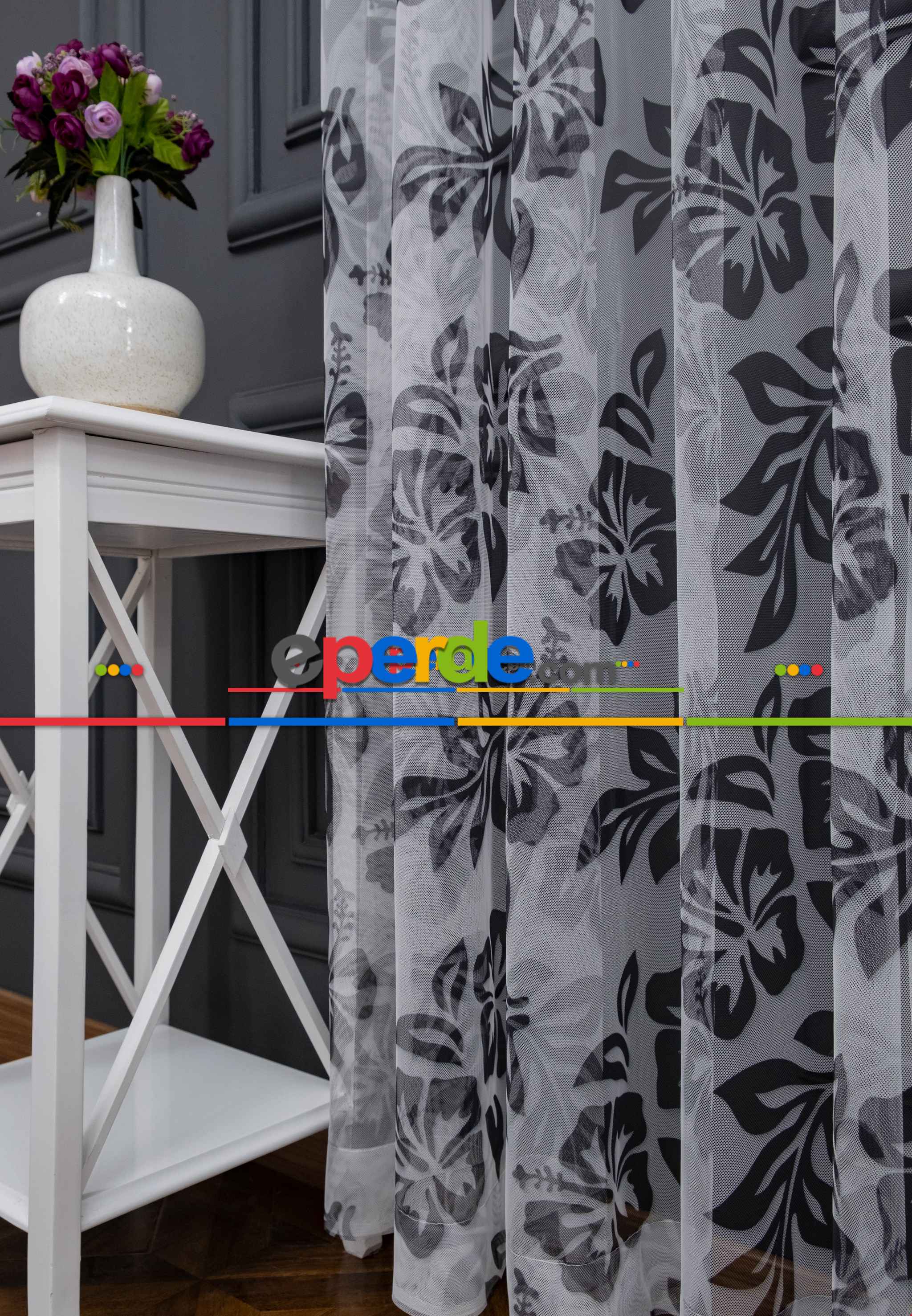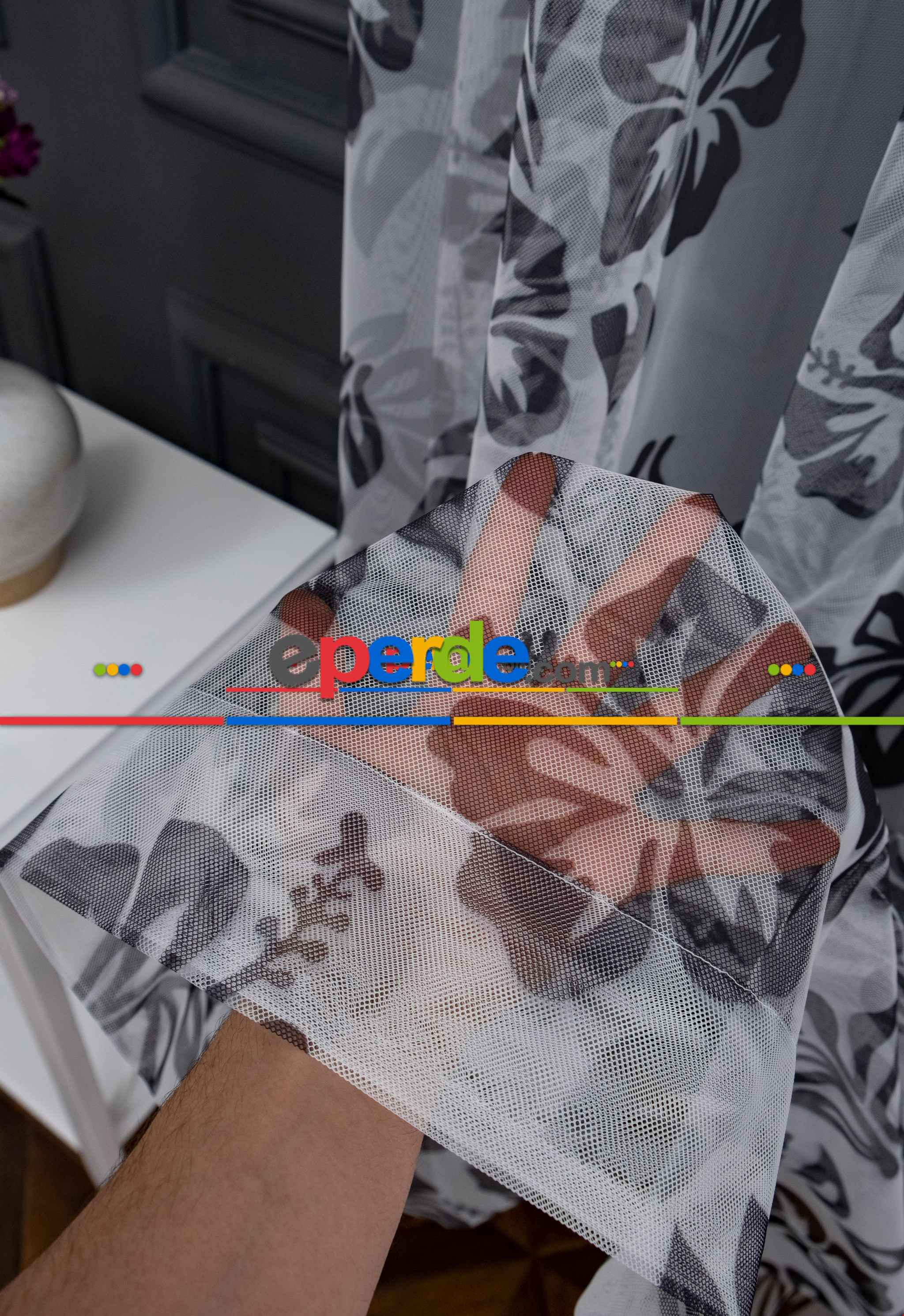 İsveç | Petek Zemin Siyah Renkli Çiçek Ve Yaprak Desenli Grek Baskılı Tül Perde » Eperde