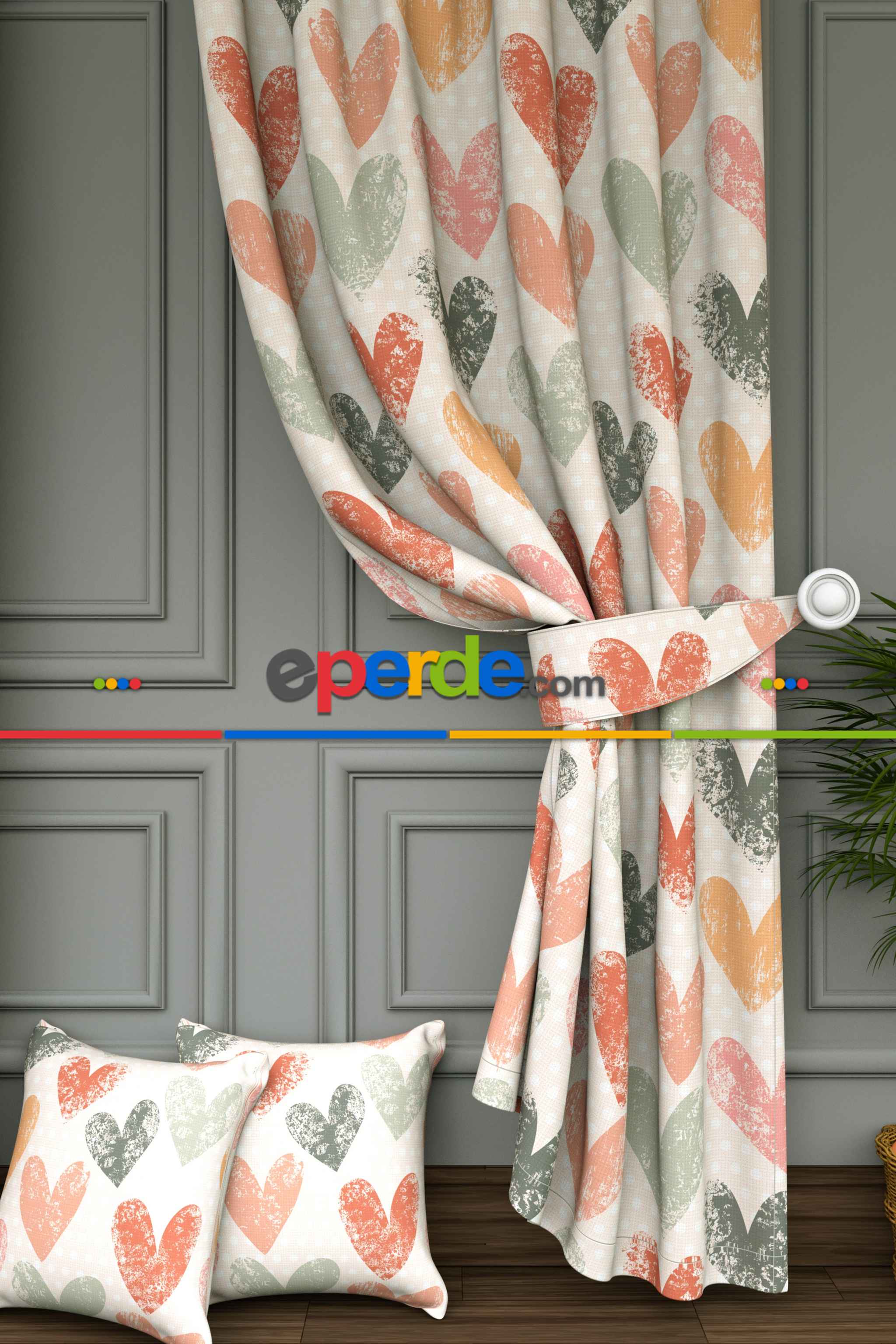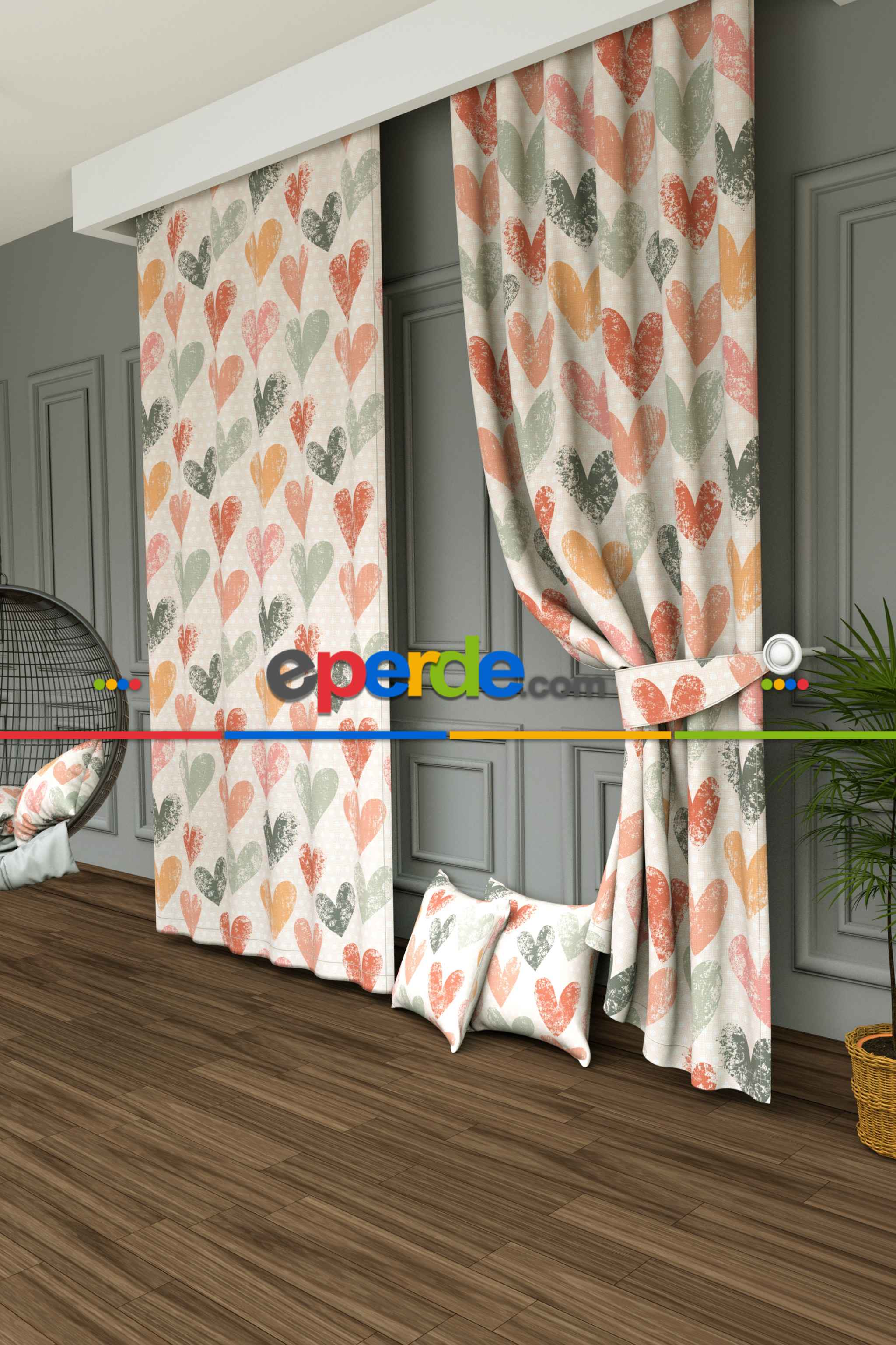 Dökümlü Kumaştan Renkli Kalpler Desenli Baskılı Fon Perde