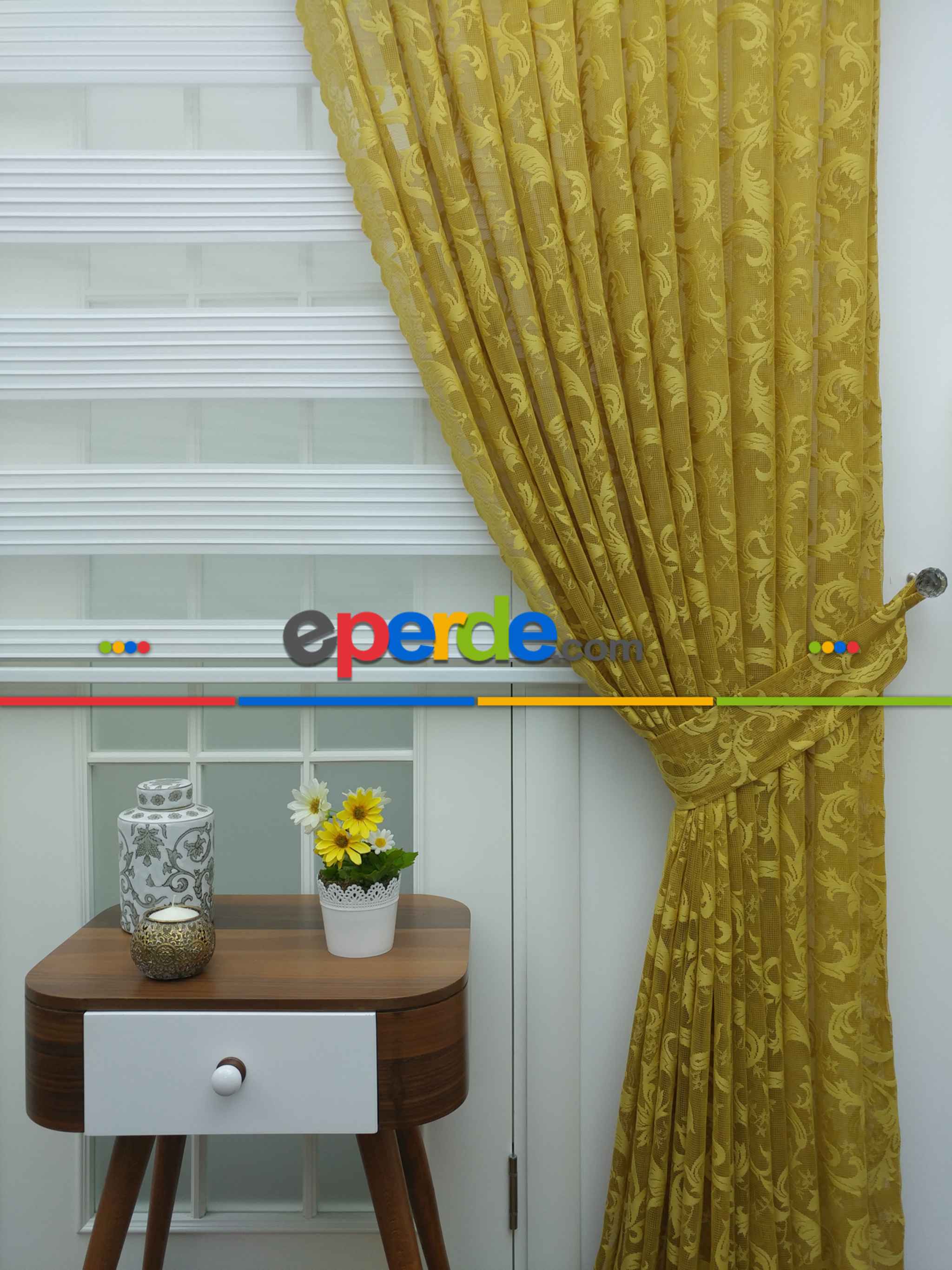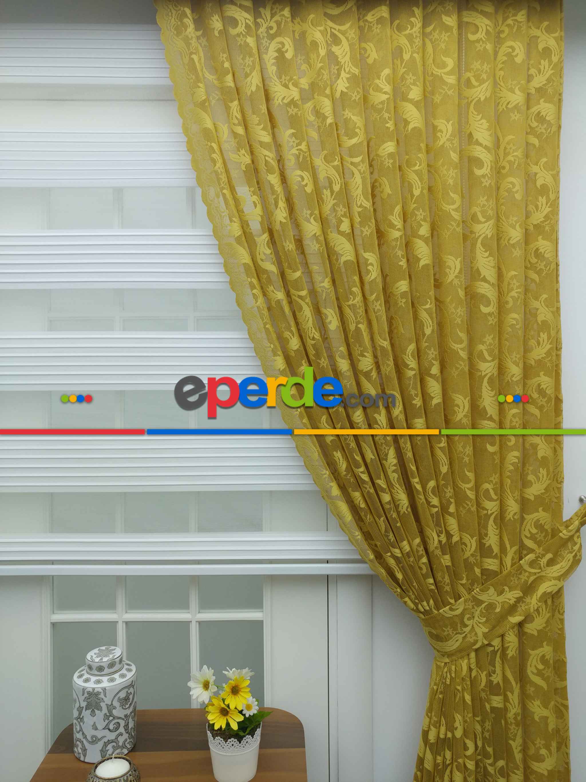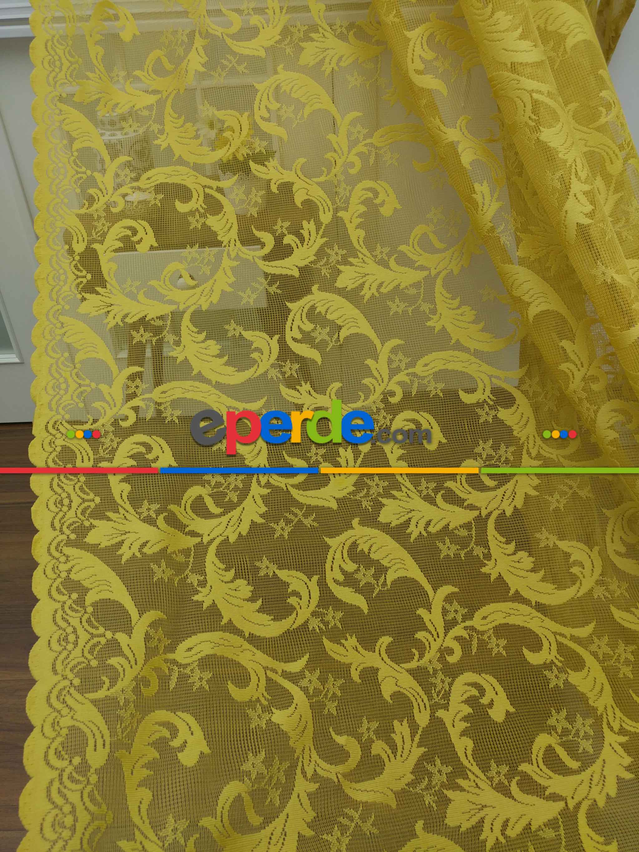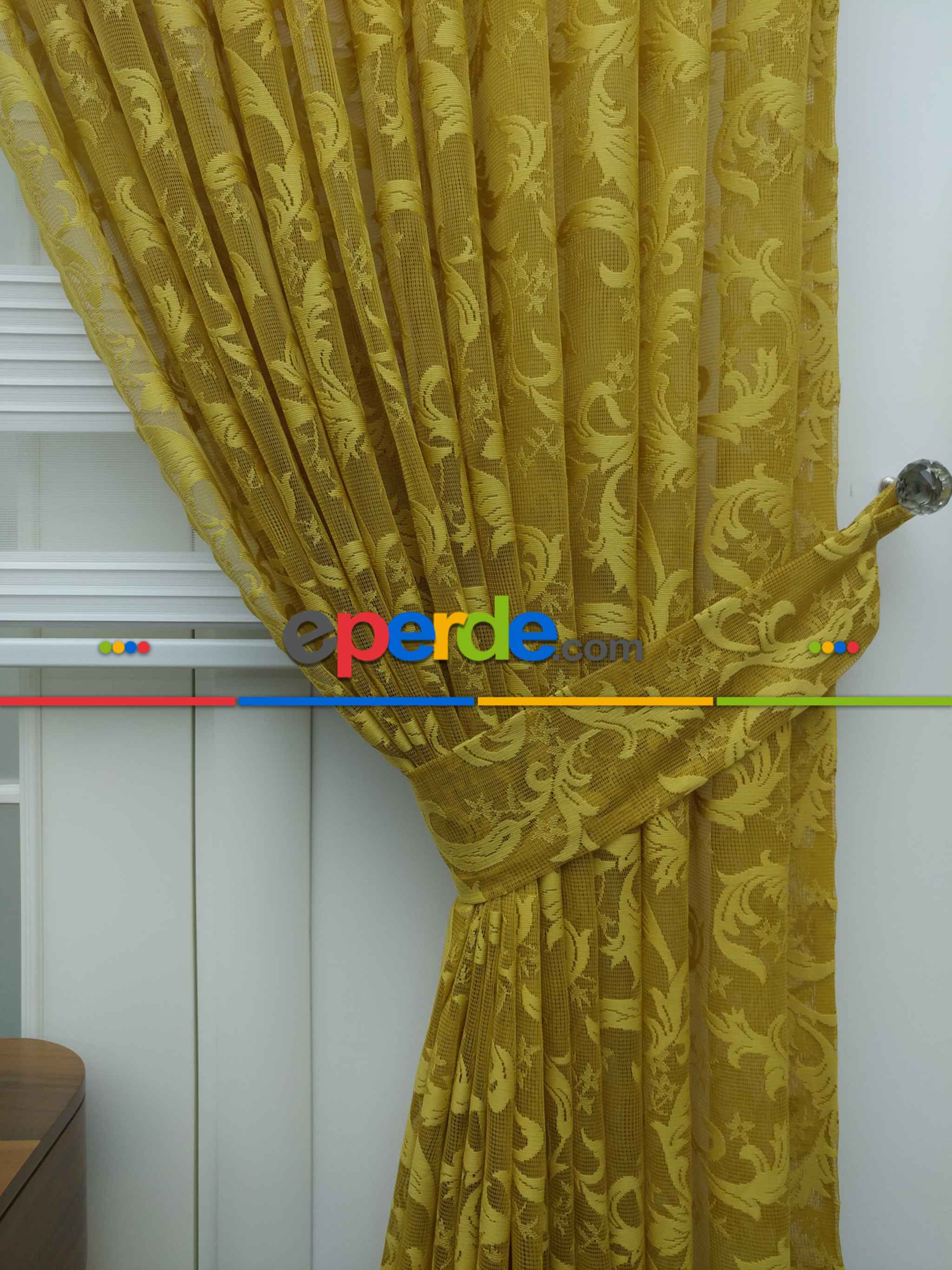 Sarı - Desenli Dantel Tül Fon Perde- Sarı