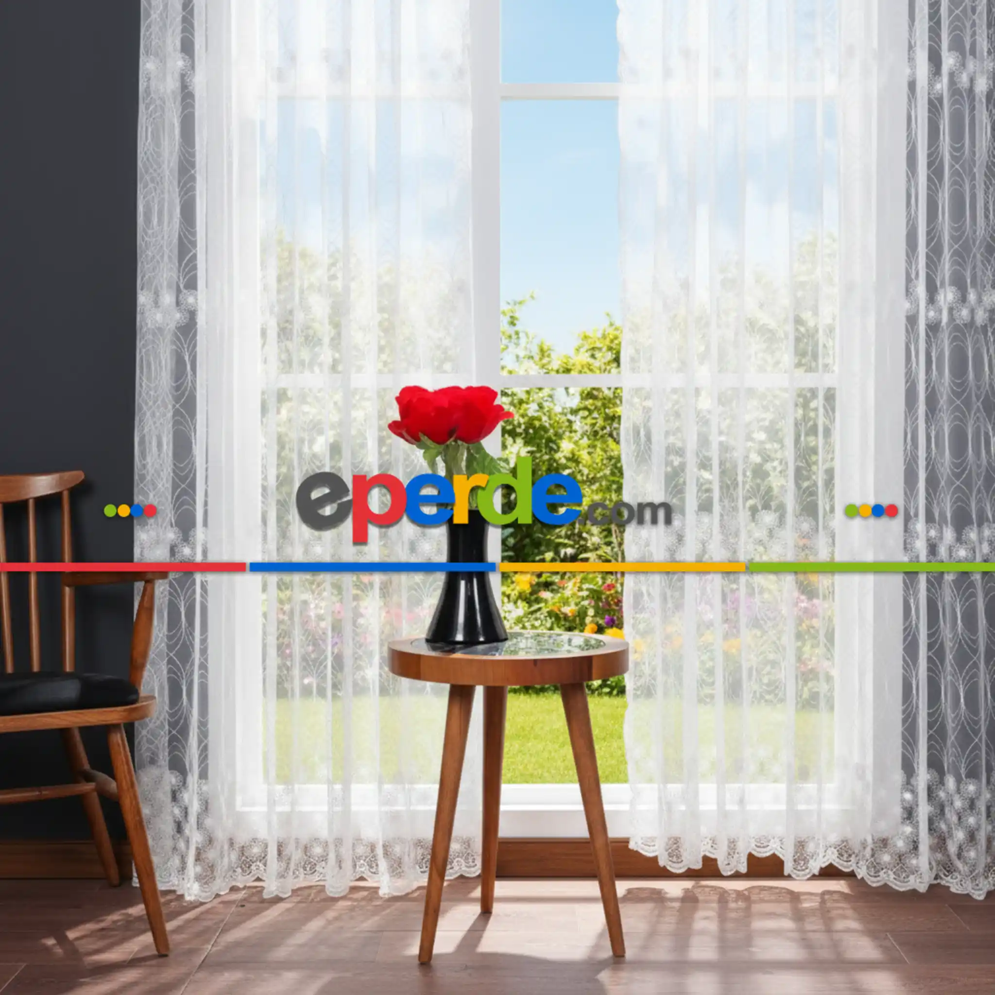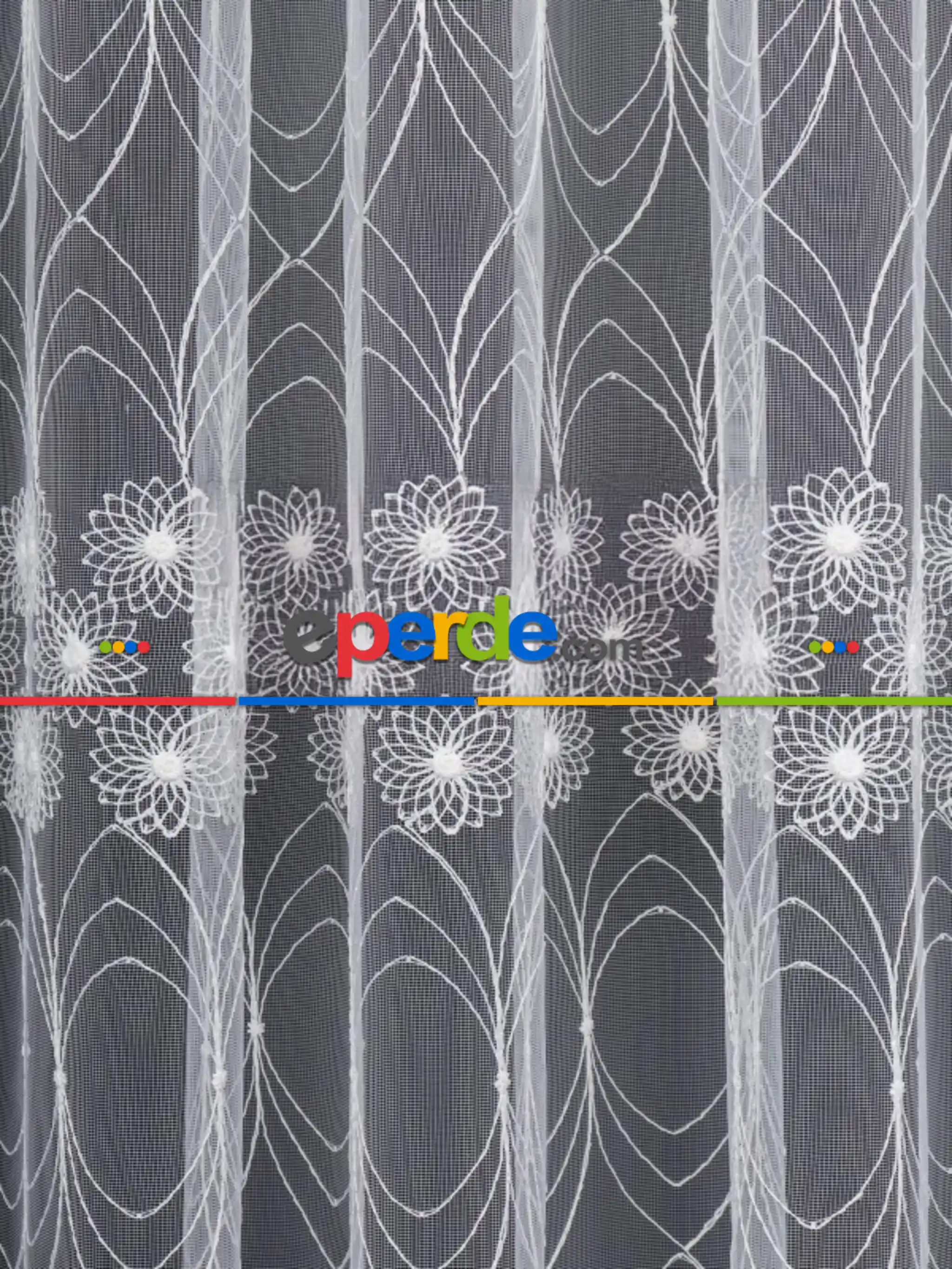 Şeritli Papatya Nakış İşlemeli Brode Tül Perde