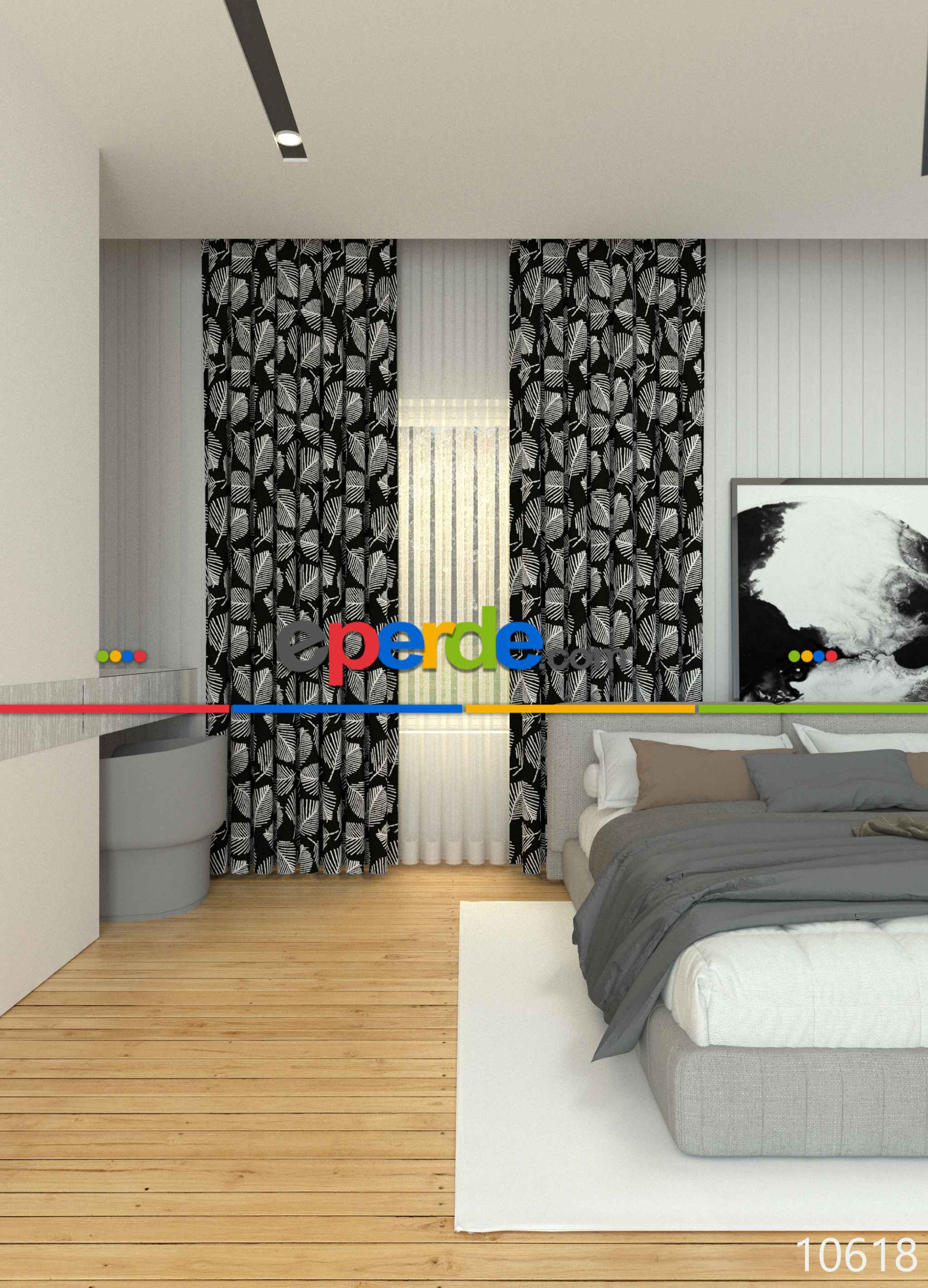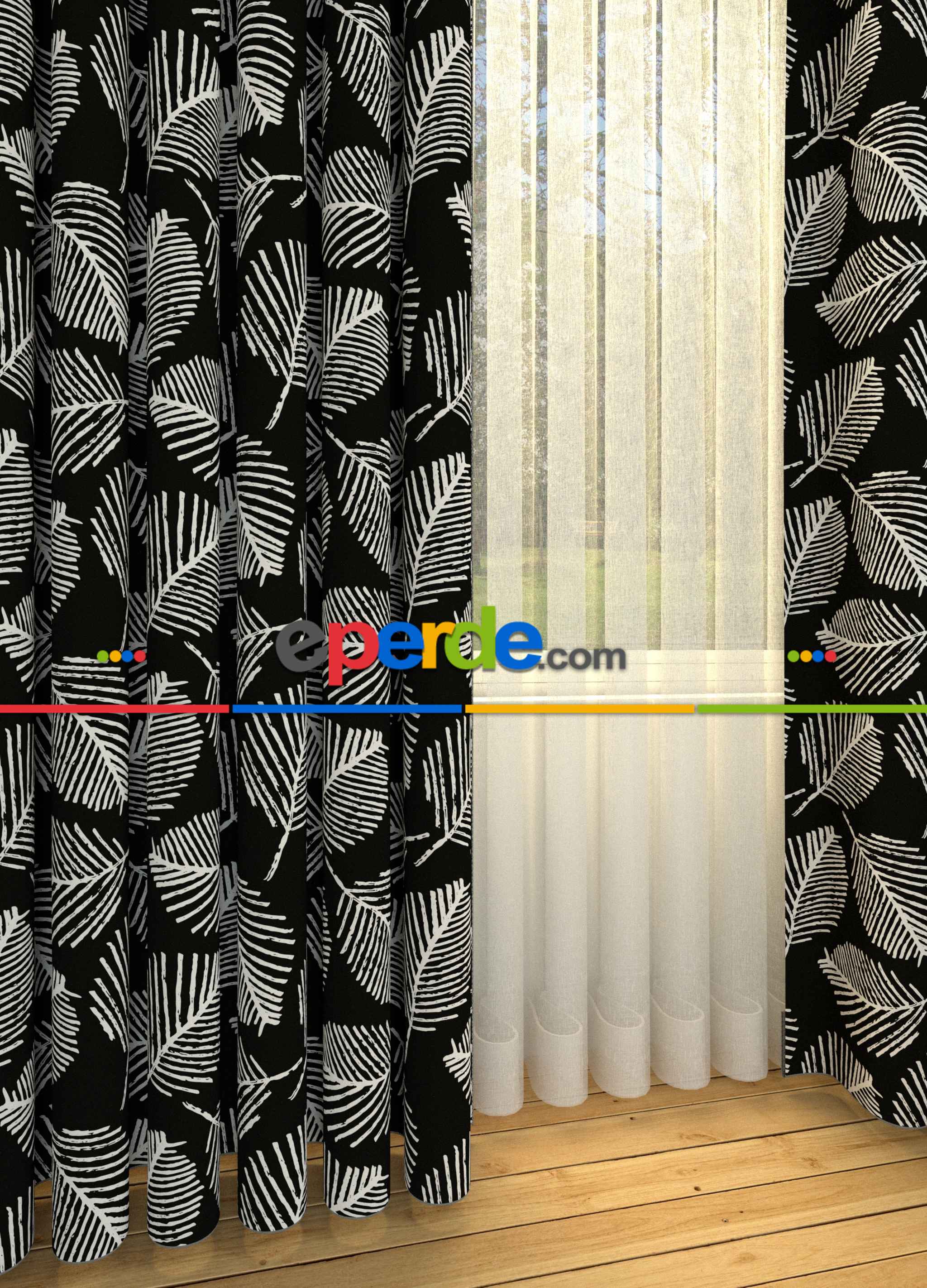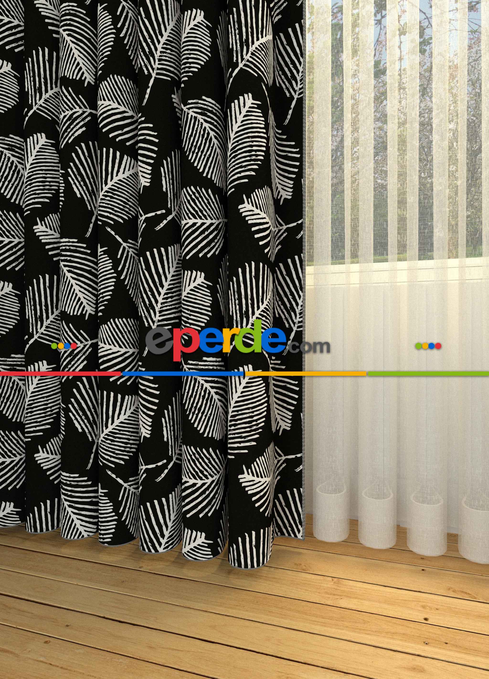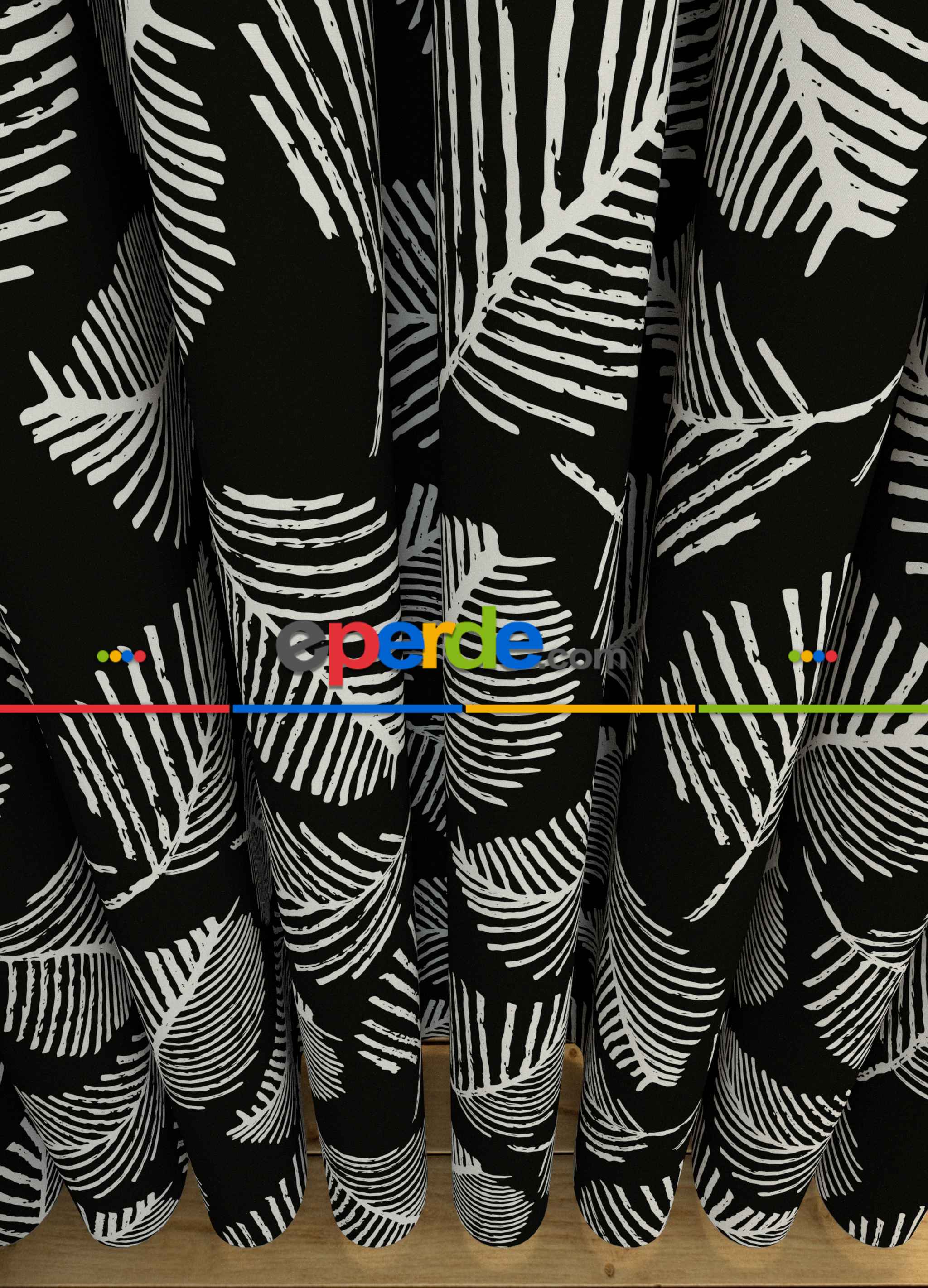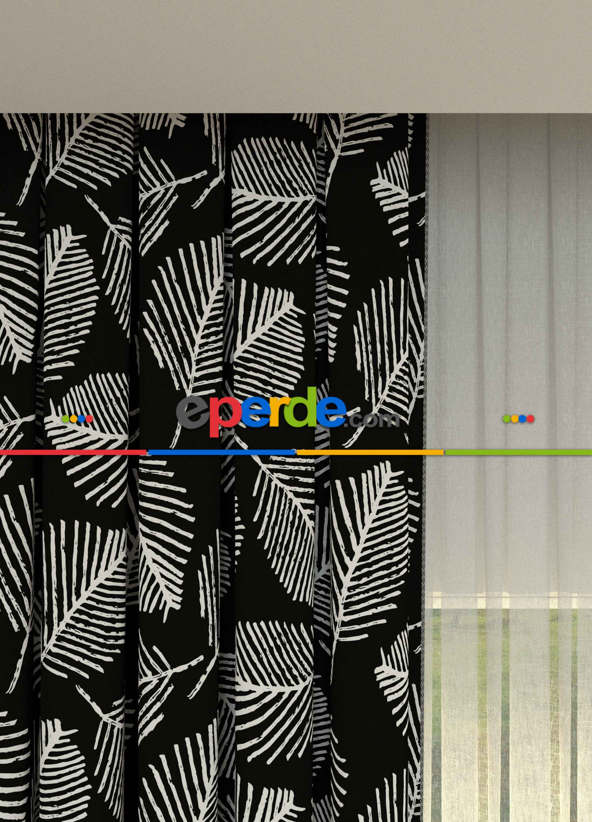 Dökümlü Kumaştan Siyah Yaprak Desenli Baskılı Fon Perde Geniş En 1. Kalite