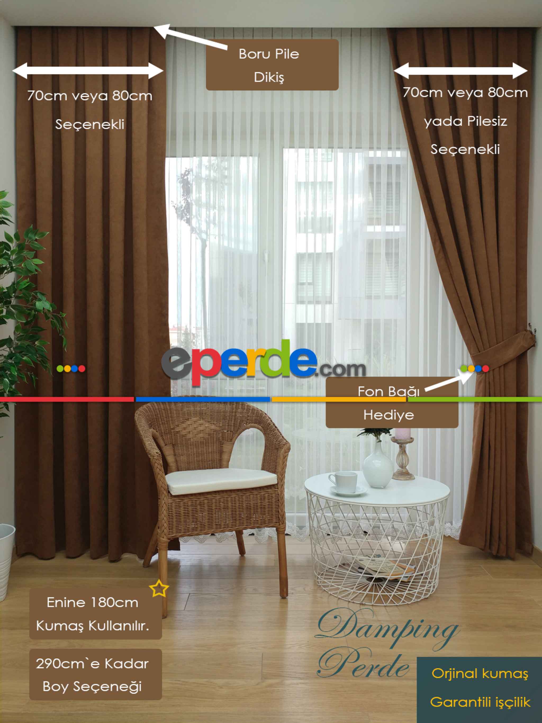 Yere yığılma şeklinde bir duruş sergilemek isterseniz, yere kadar ölçün +15 santim ilave edin, bu yeterli olacaktır. Dekor amaçlı kullanacaksanız enini geniş sipariş etmemeye çalışın ki gündüz pencerenizden giren ışığı kesmesin, ideal fon eni 70-90 cm arasıdır.